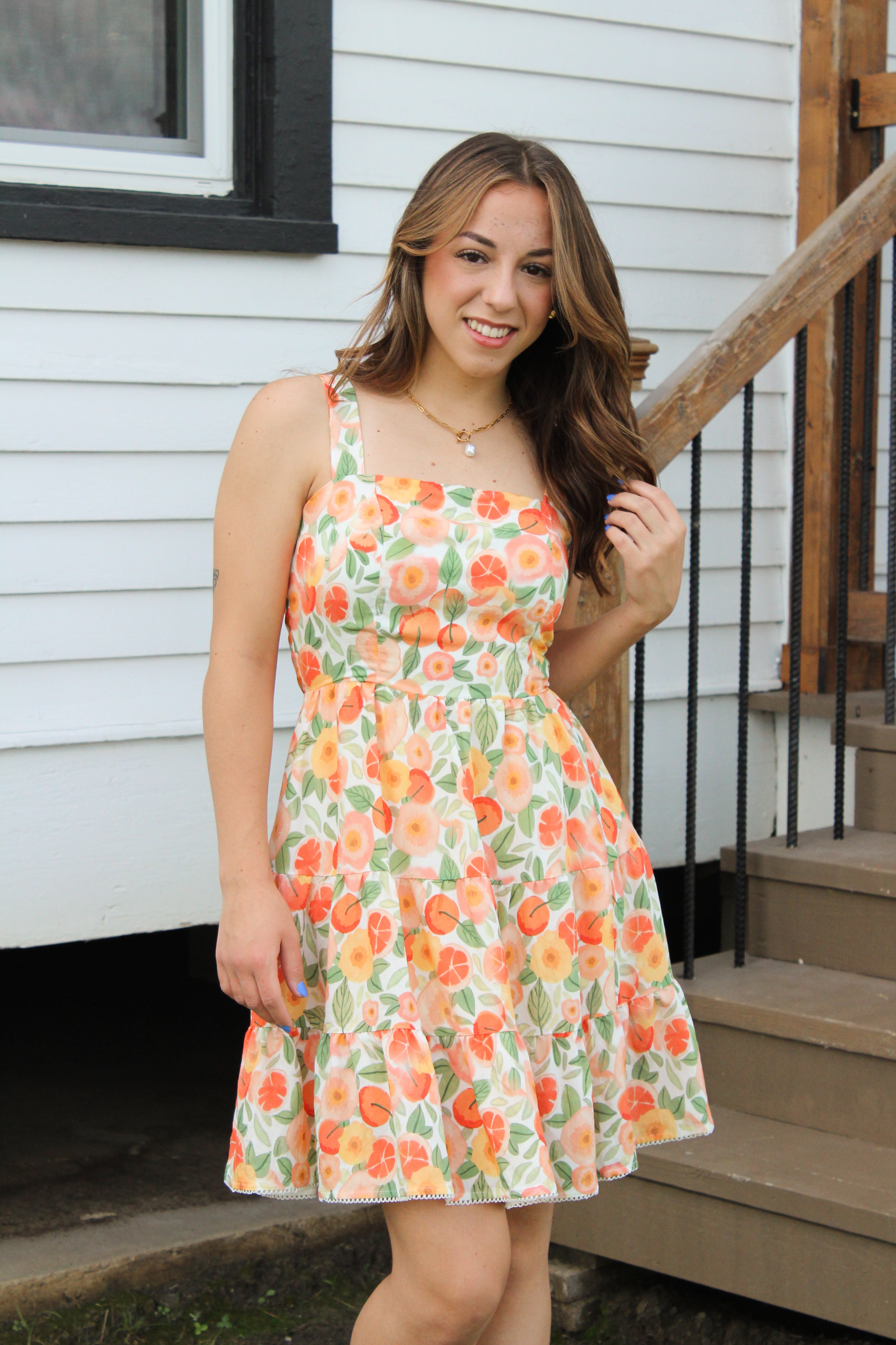 Brighten your wardrobe with the Bella Sun Dress, a playful off-white sleeveless dress featuring vibrant orange prints. Its tiered design adds a flirty, flowing silhouette, while a delicate scalloped bottom edge bring a charming, detailed finish. Perfect for sunny days and casual outings, this dress combines comfort with a fun, fresh style you'll love to wear.