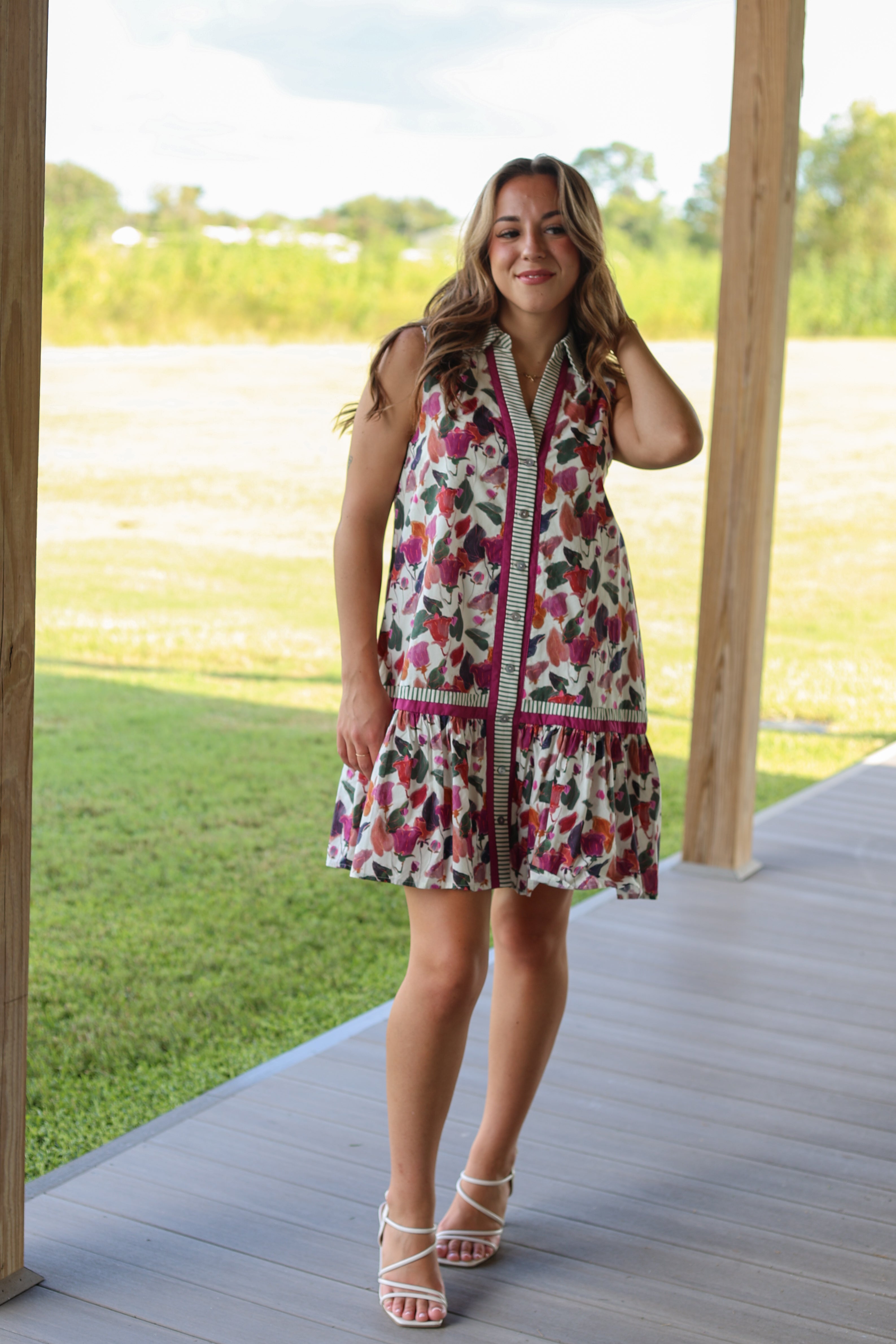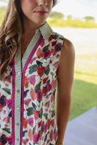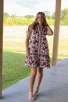 The Maggie Dress is a sleeveless button-down perfect for sunny days. Featuring a vibrant magenta floral print and a classic collar, it’s a fun and fresh choice for casual outings. Easy to wear and effortlessly stylish, this dress adds a pop of color and playful charm to your wardrobe.