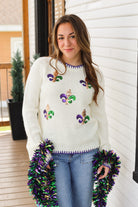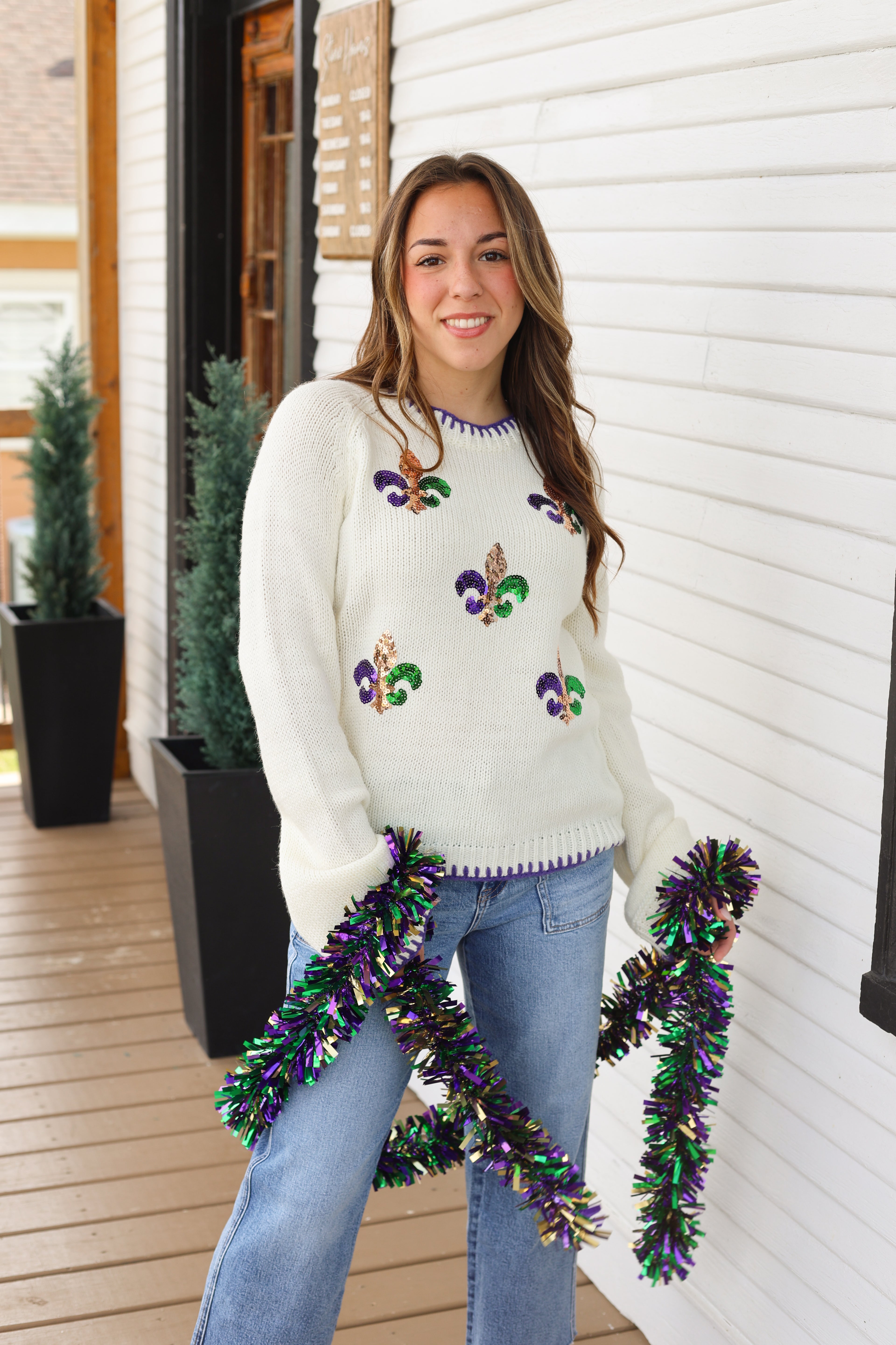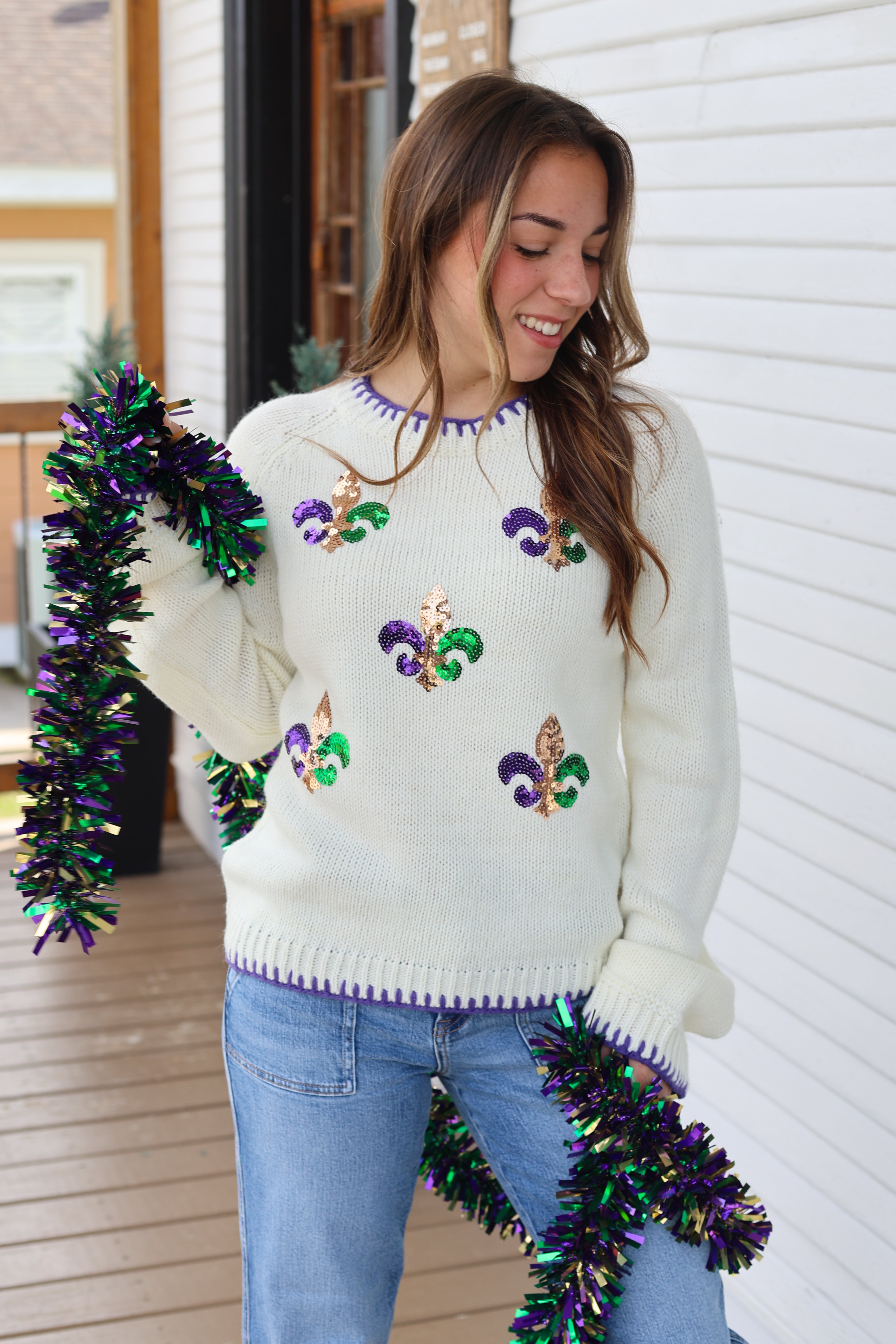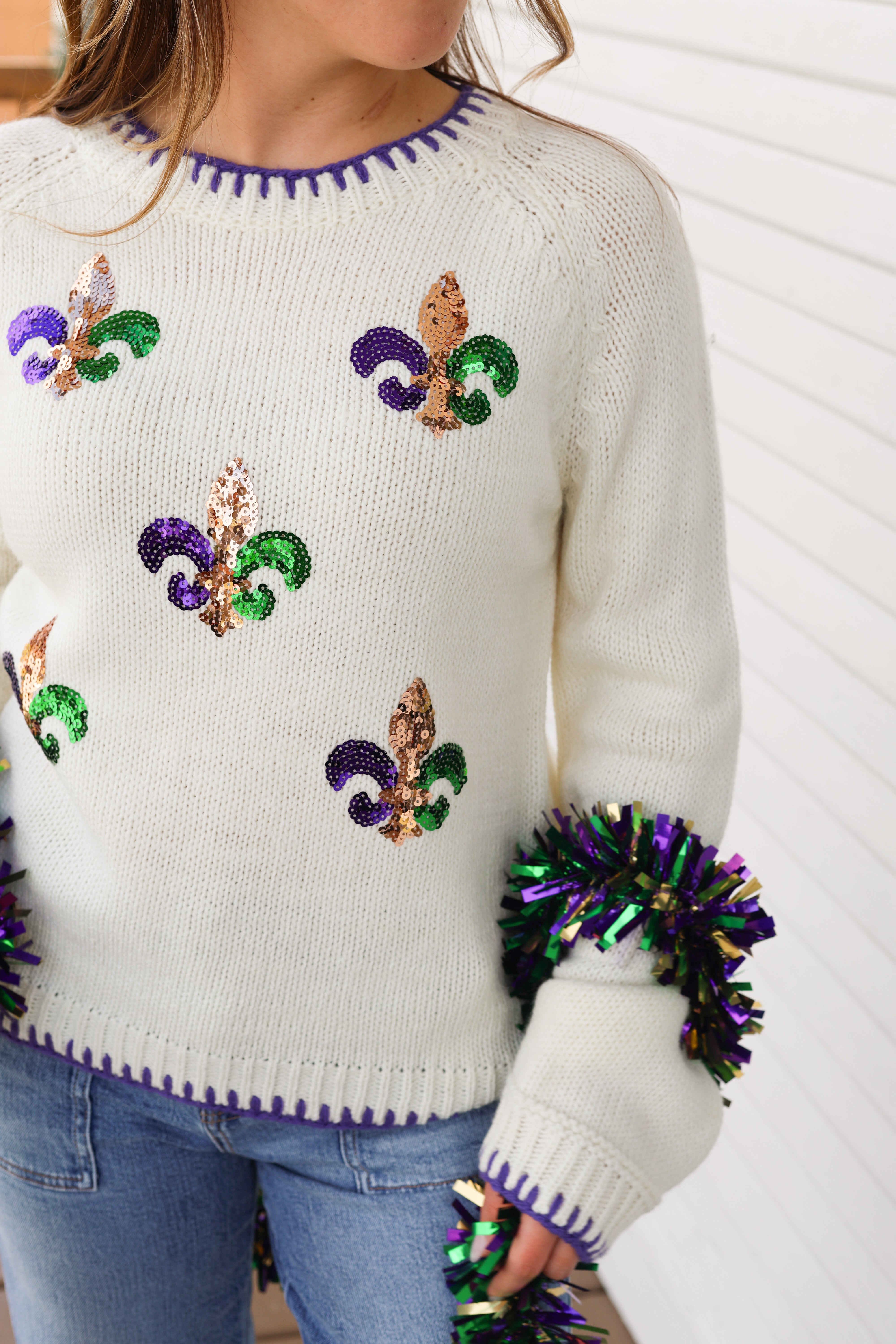STITCH DETAIL SEQUIN FLEUR DE LIS EMBROIDERY MARDI GRAS SWEATER