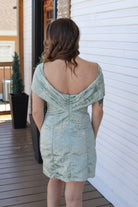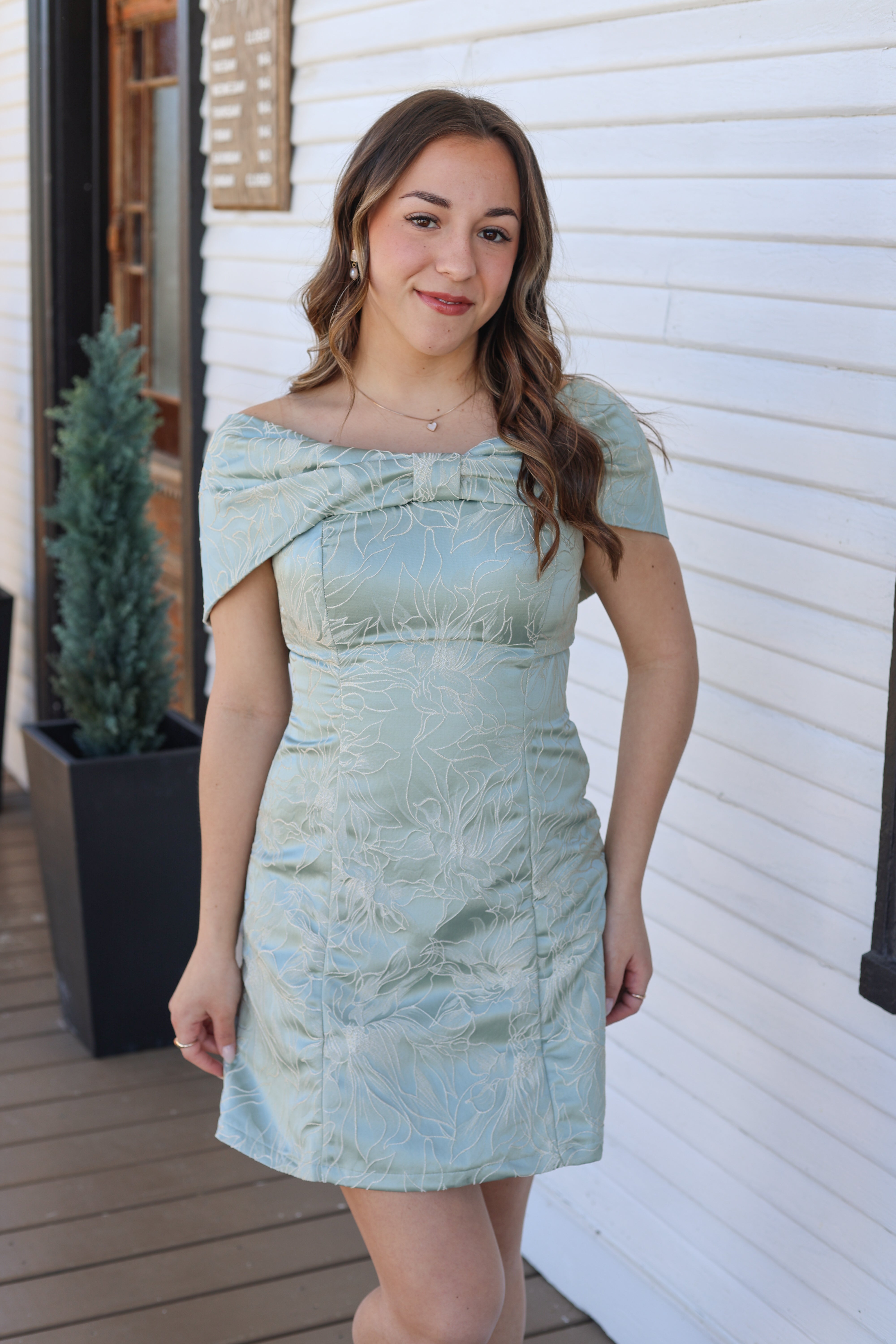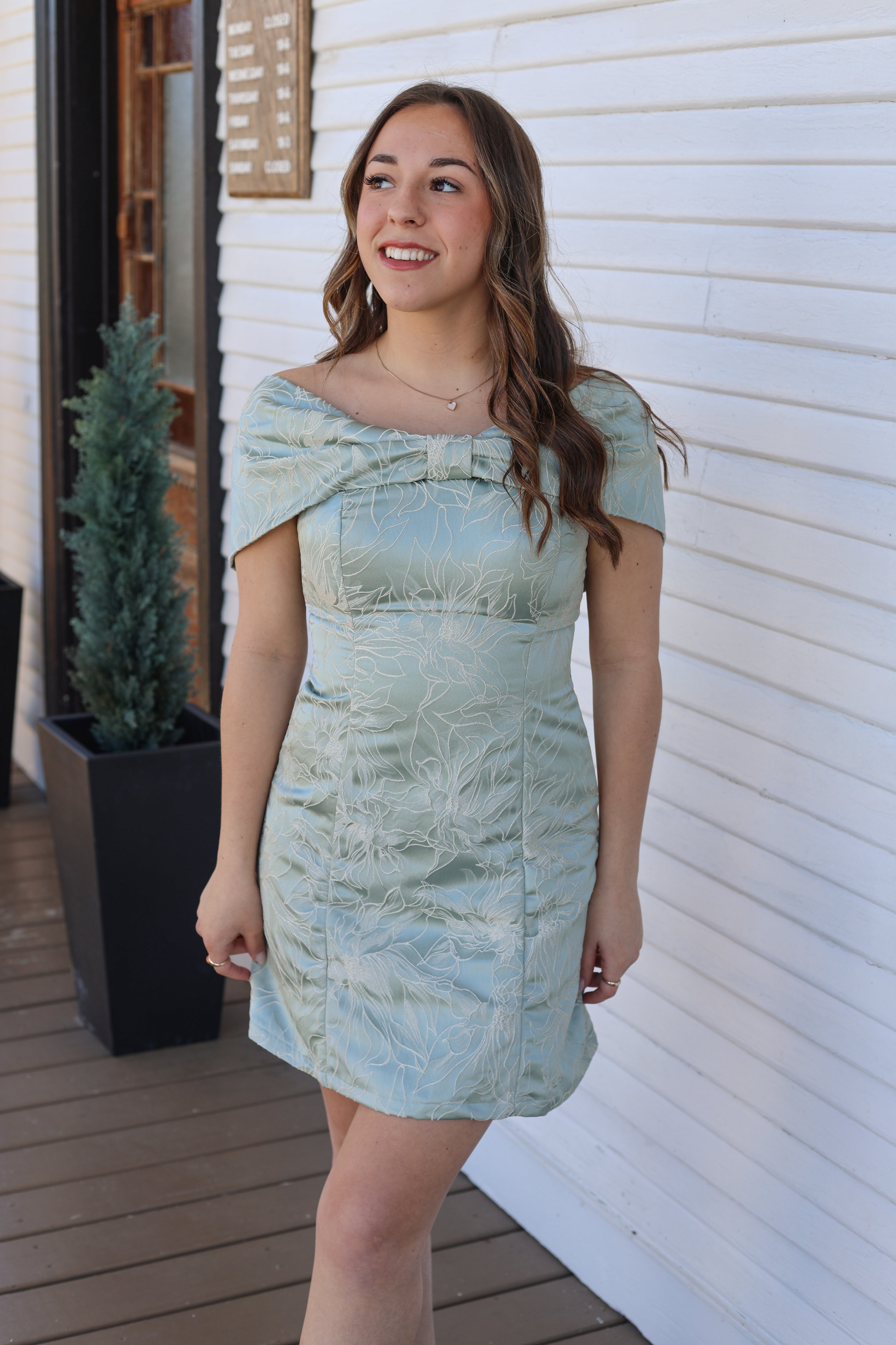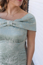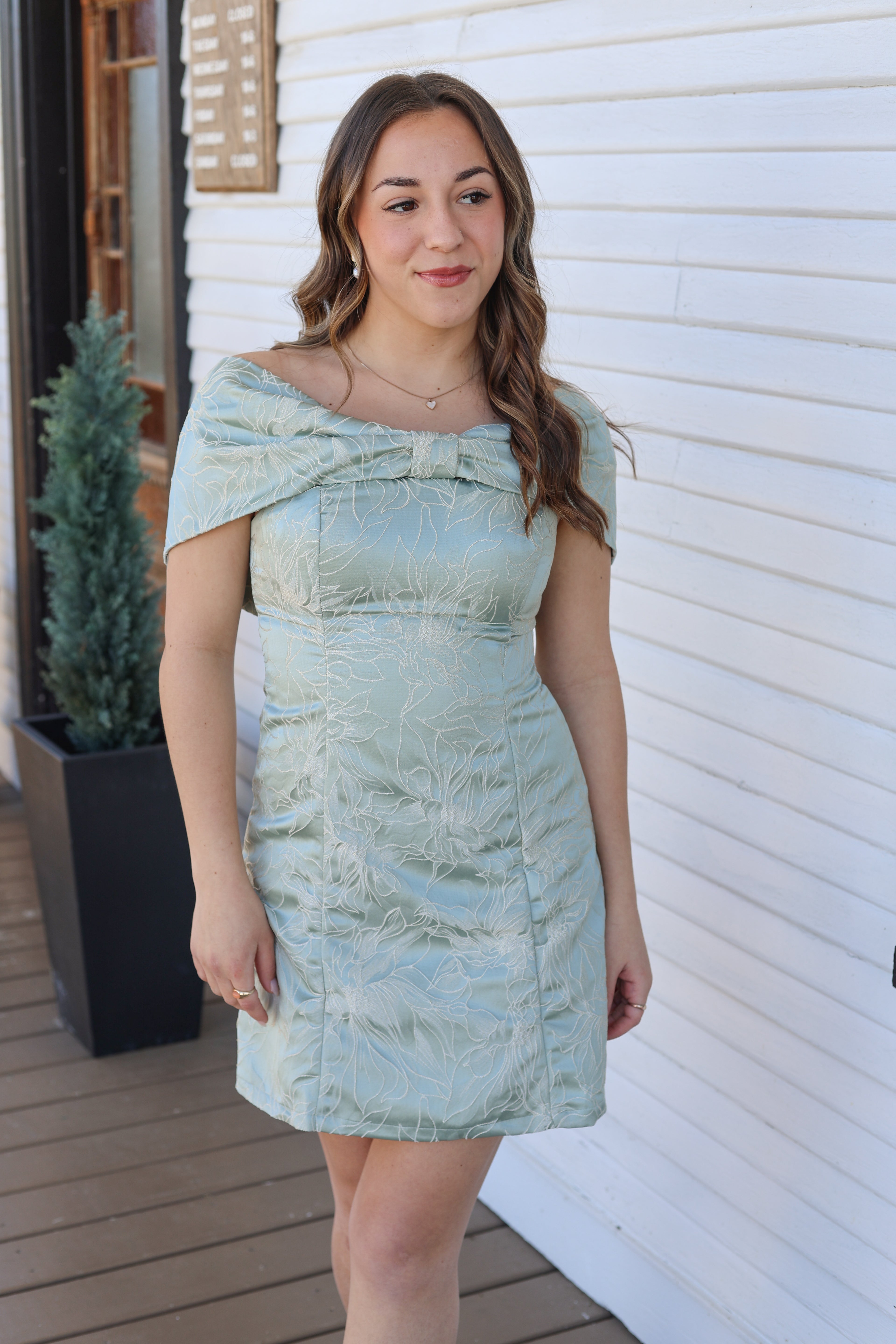 Make a sophisticated entrance at your next special occasion in this sage green and gold jacquard mini dress. The elegant off-the-shoulder silhouette and refined jacquard pattern elevate any event, from wedding celebrations to bridal showers and awards ceremonies. The streamlined zip closure ensures a polished fit, while the mini length keeps the look modern and chic. Versatile enough for multiple occasions, this dress pairs beautifully with heels or dressy flats. Whether you're a guest or part of the celebration, this timeless piece delivers understated elegance with just the right amount of glamour.