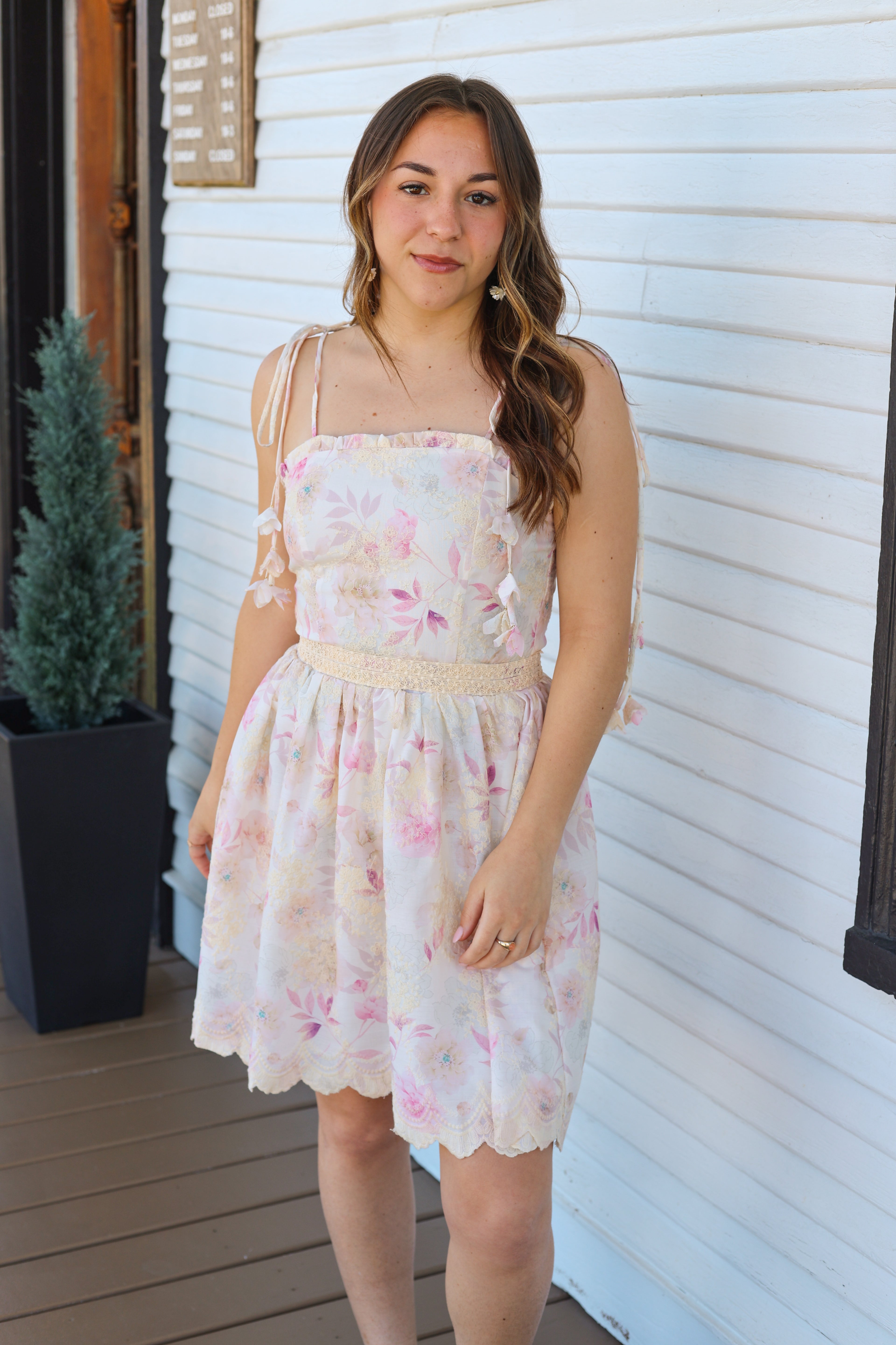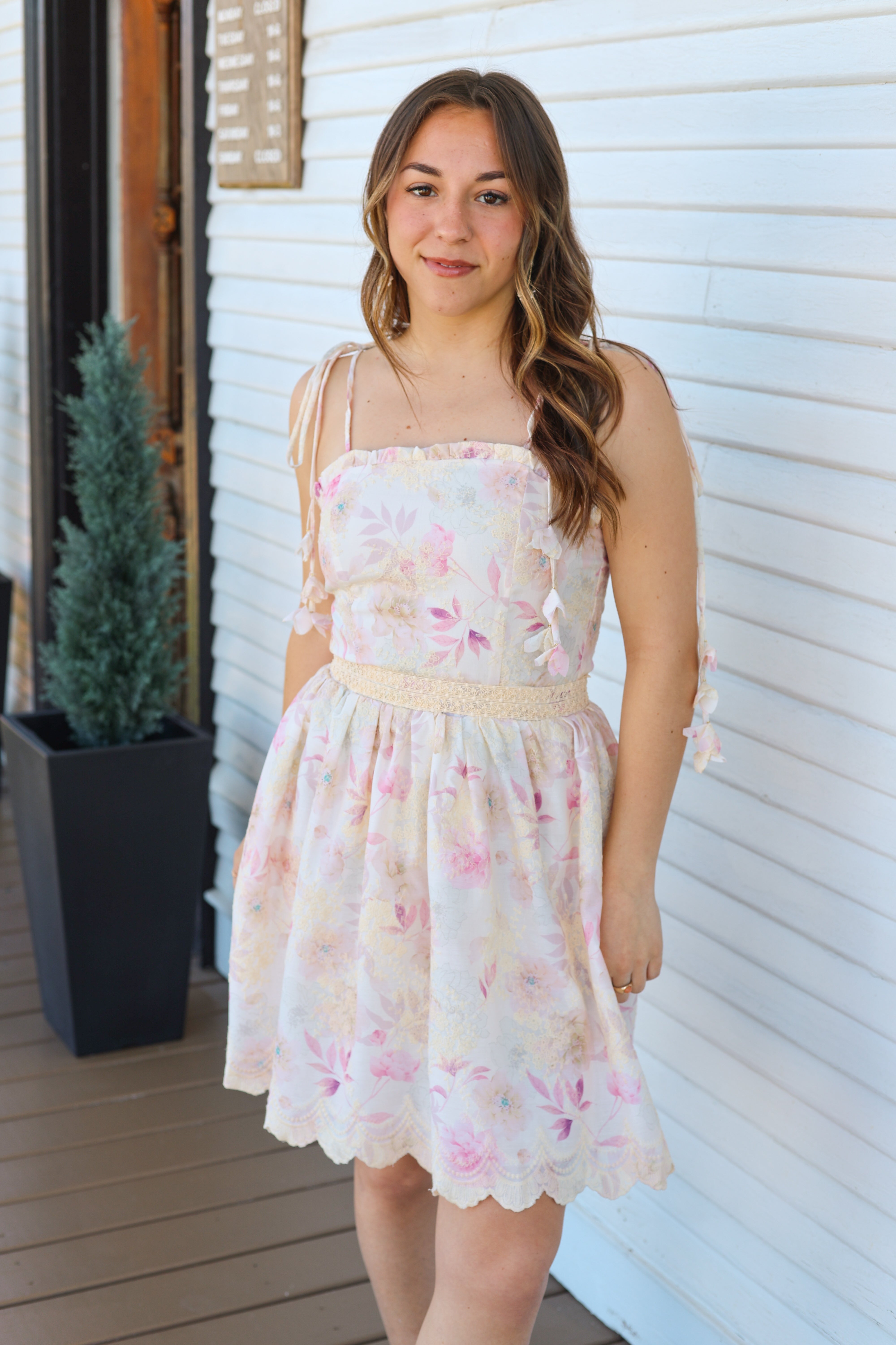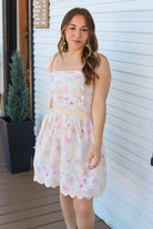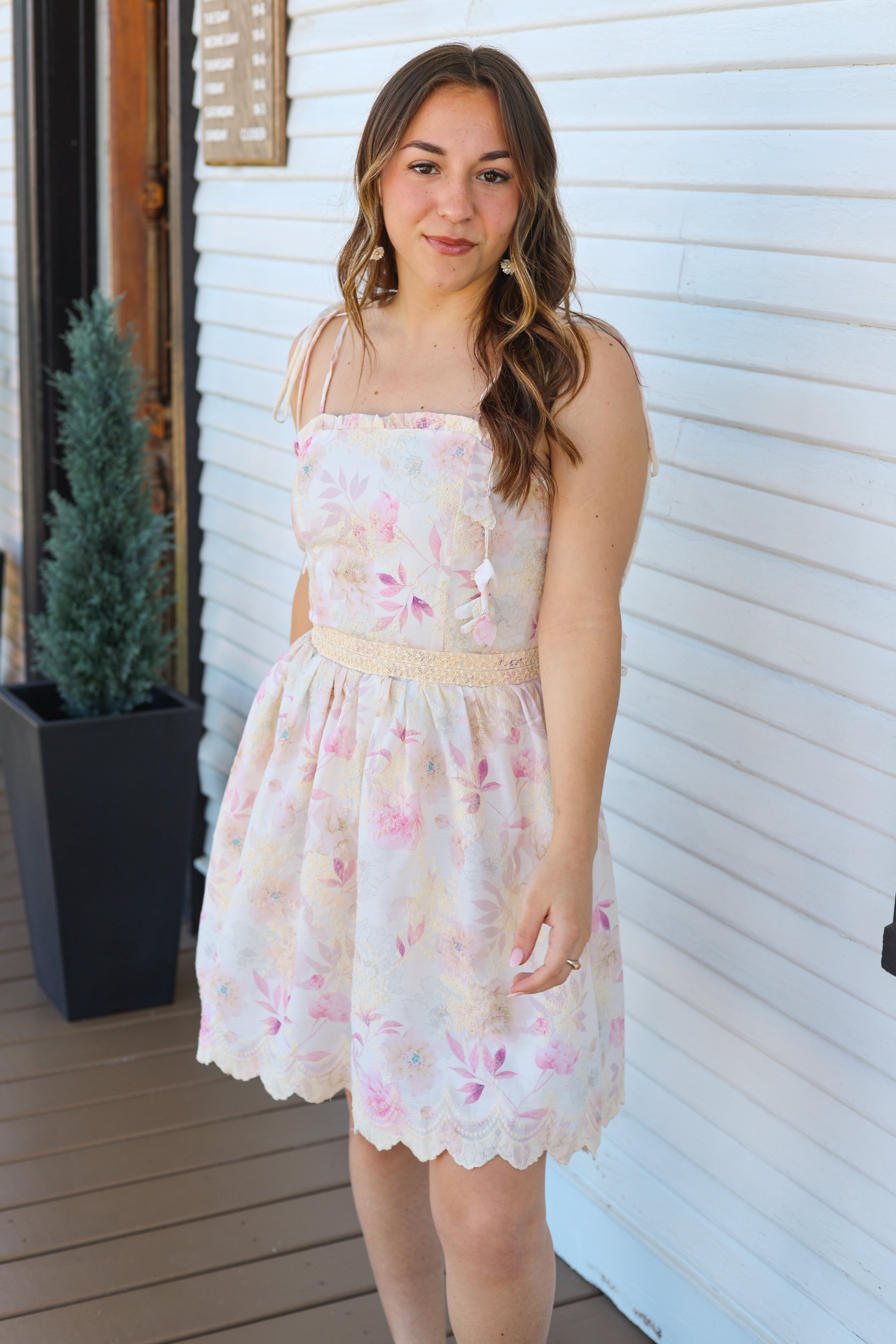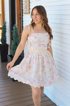 Floral Embroidered Mini Dress- Tie Strap Smocked Back Scallop Hem Dress Product Description This floral embroidered mini dress features delicate tie straps, a flattering smocked back, and a flowy A-line skirt with a scalloped lace hem. Soft, feminine, and lightweight, it's the perfect summer dress for brunch, vacations, and special warm-weather occasions.