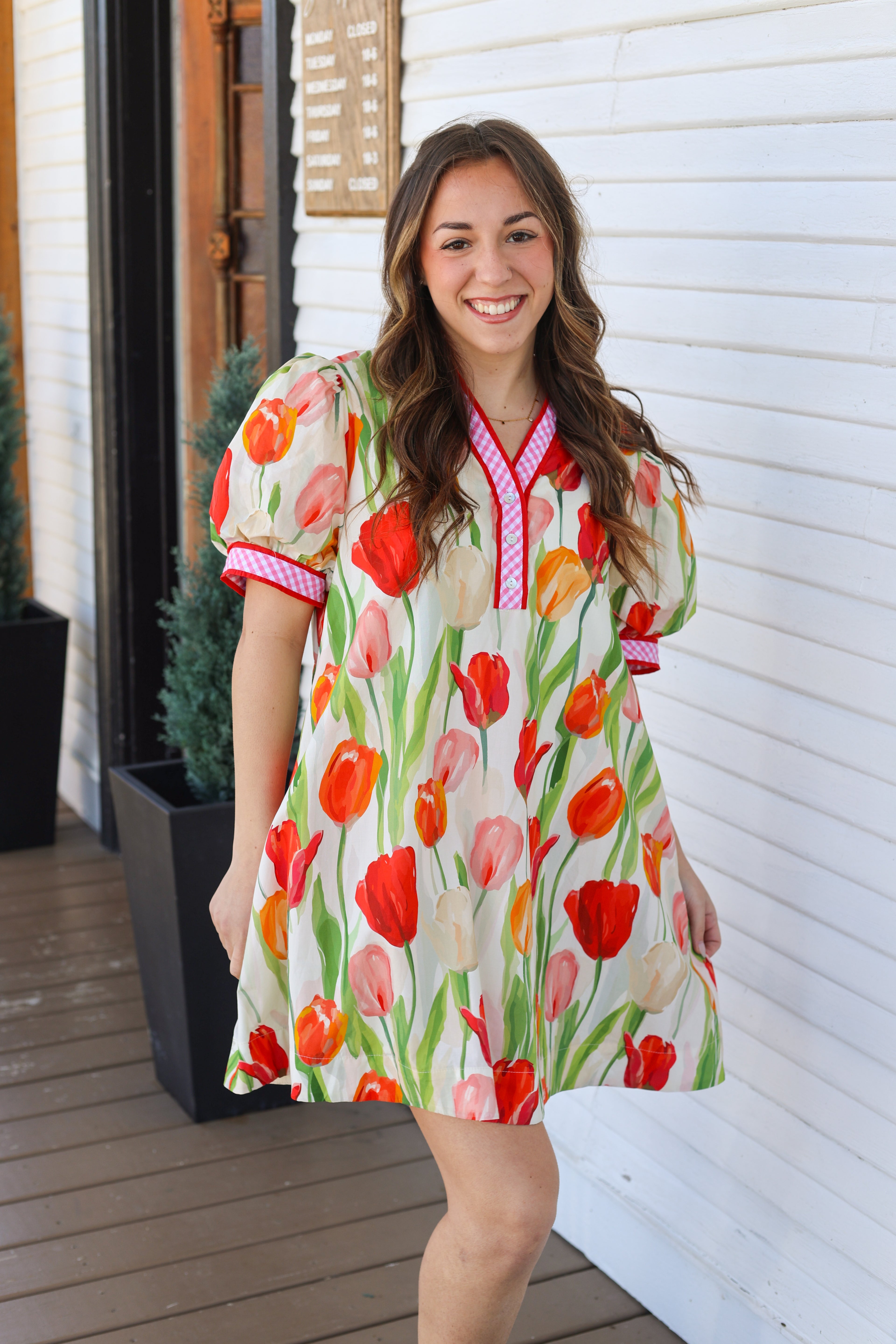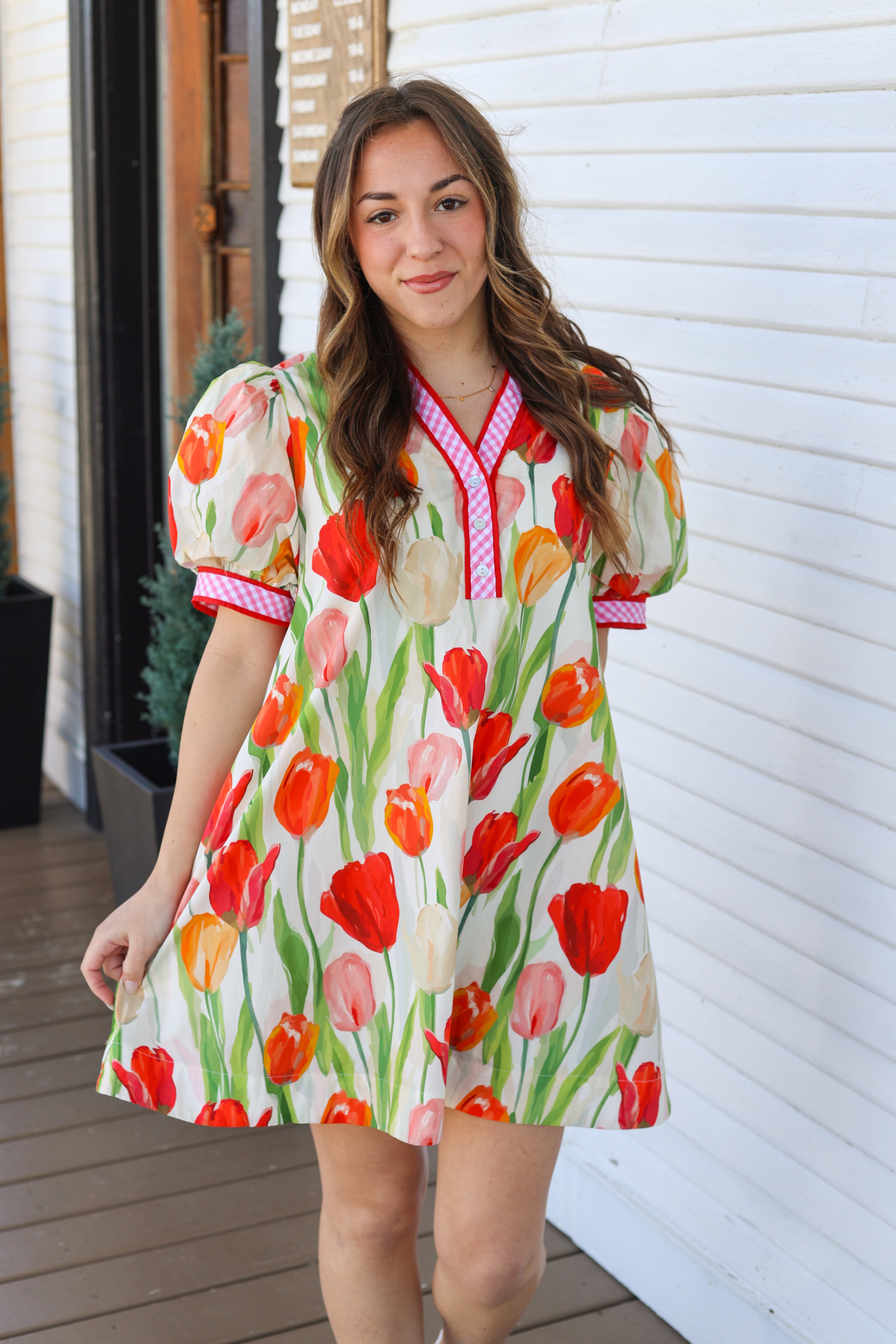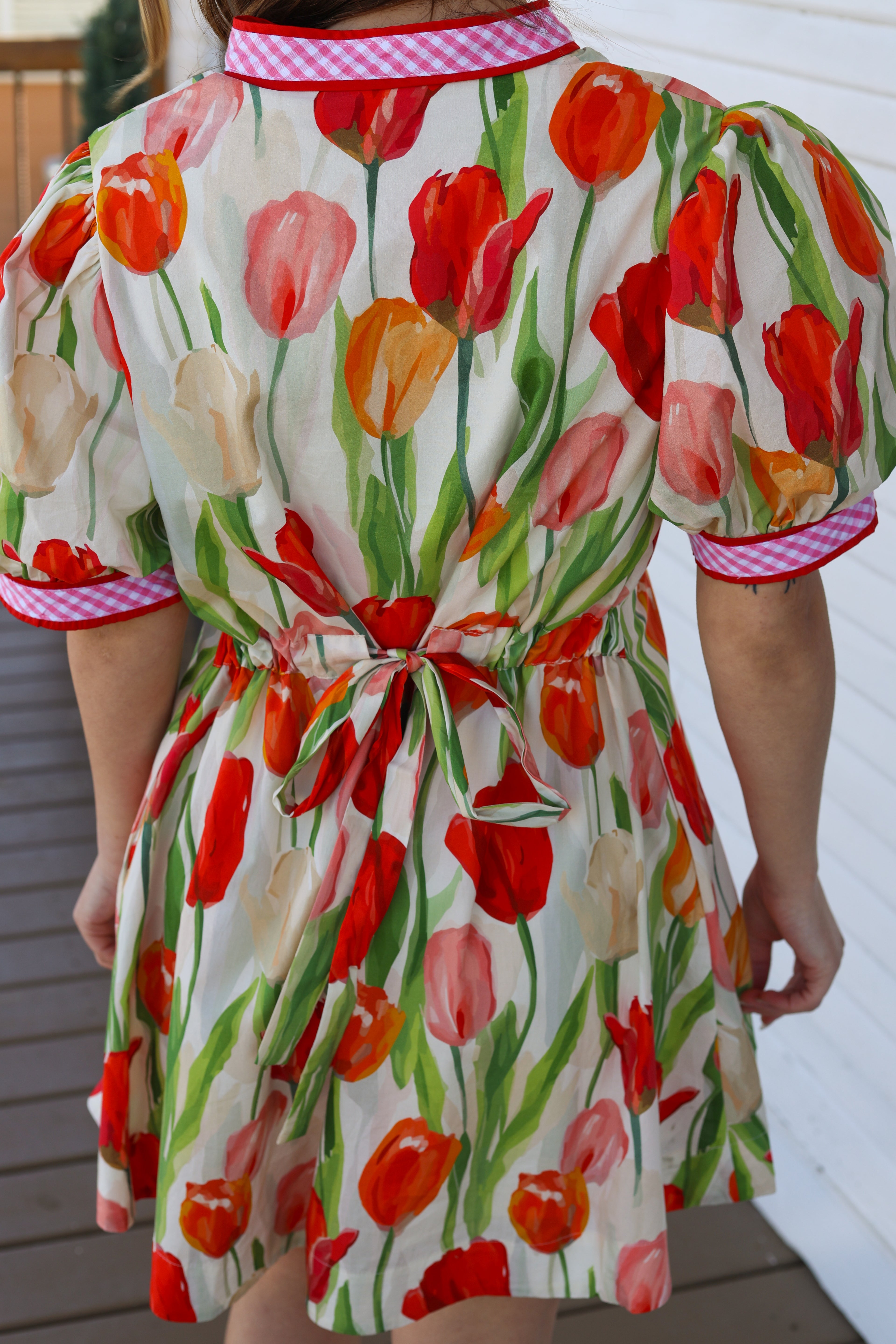 The Eliza Dress is a fun and flirty mini dress featuring short puff sleeves and a playful pink gingham design with red outlining. Its bright tulip floral print adds a cheerful touch, making it perfect for sunny outings or casual get-togethers. Embrace your playful side with this standout piece! Checkout the drawstring detail in the back for that extra flattering fit!