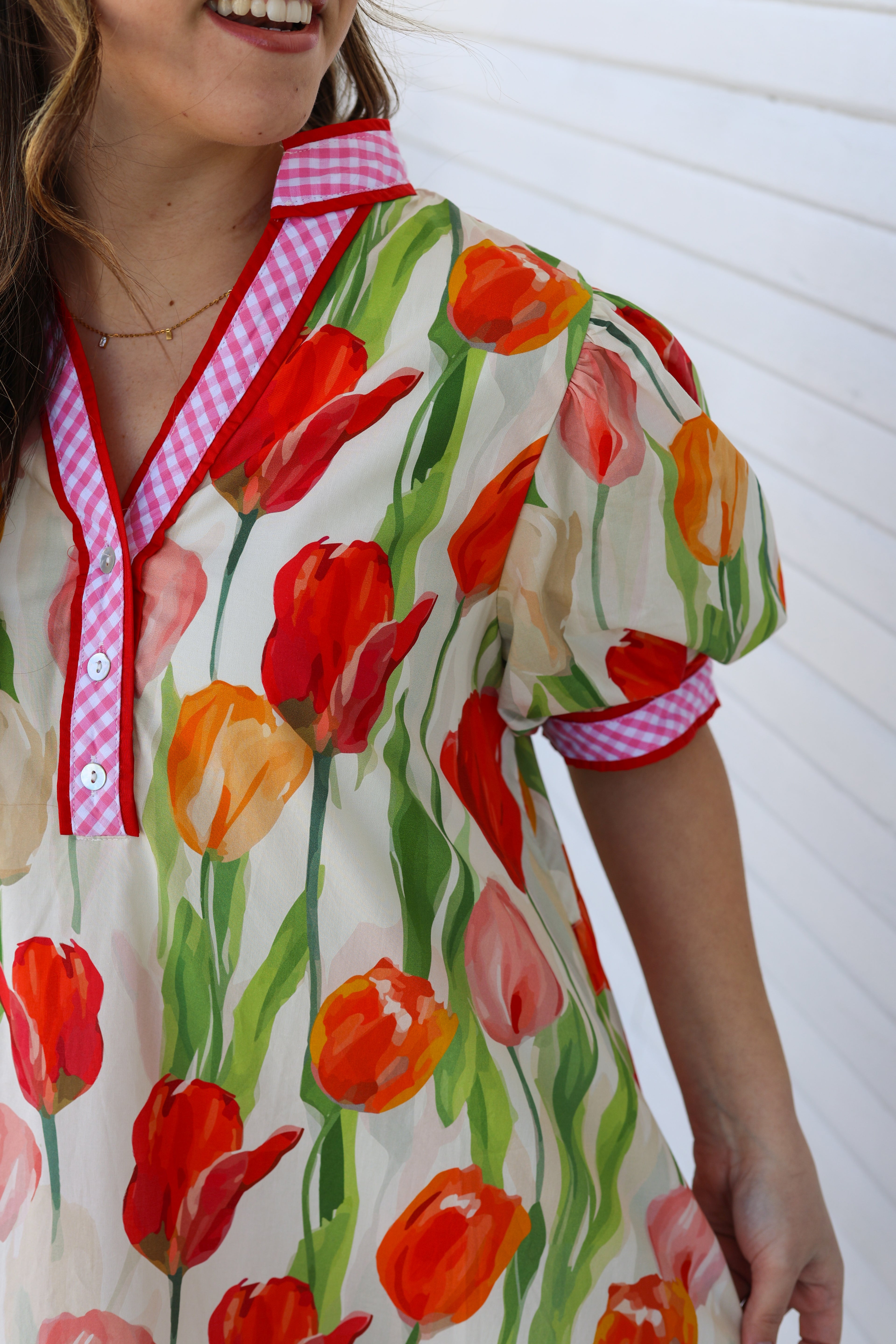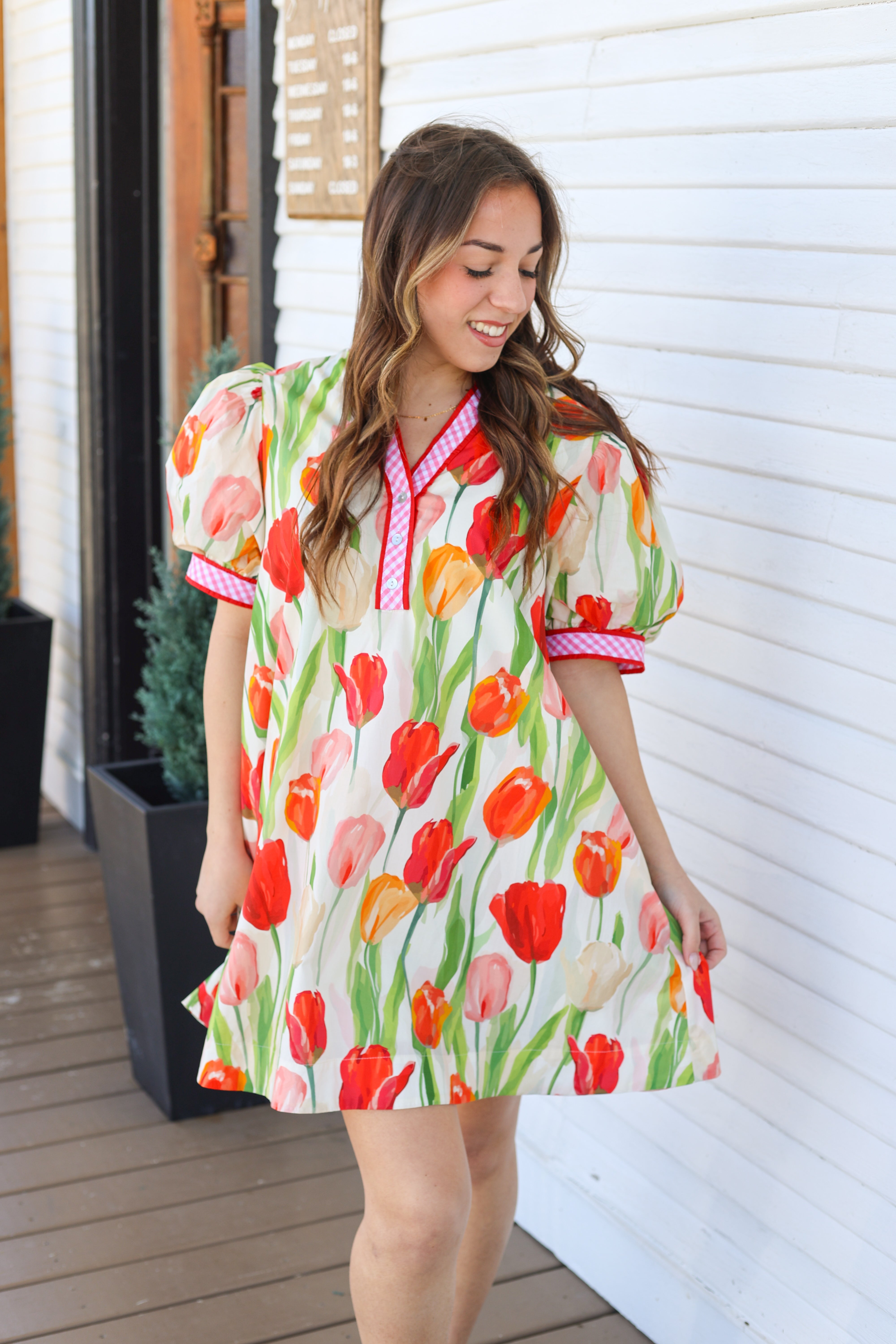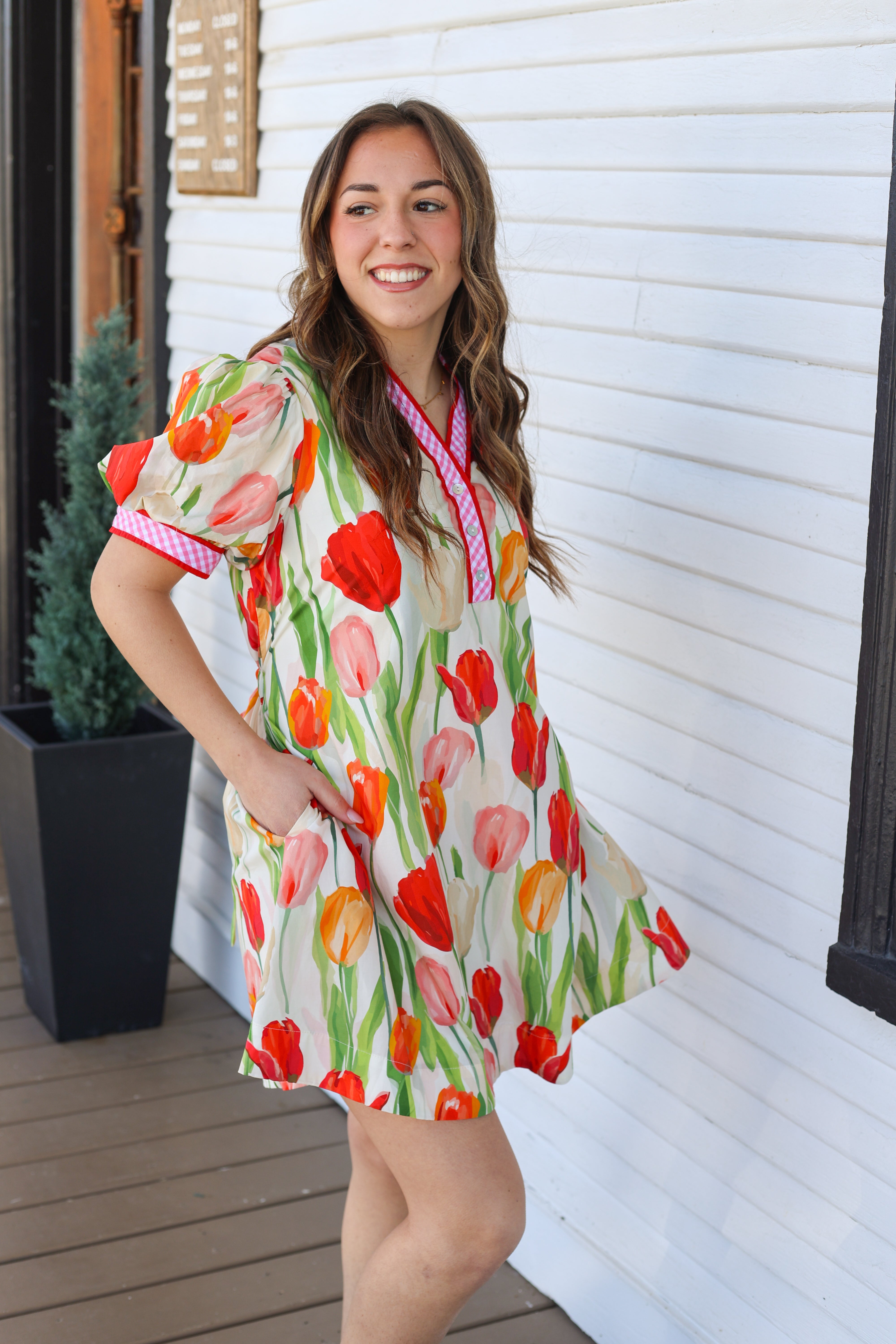 The Eliza Dress is a fun and flirty mini dress featuring short puff sleeves and a playful pink gingham design with red outlining. Its bright tulip floral print adds a cheerful touch, making it perfect for sunny outings or casual get-togethers. Embrace your playful side with this standout piece! Checkout the drawstring detail in the back for that extra flattering fit!