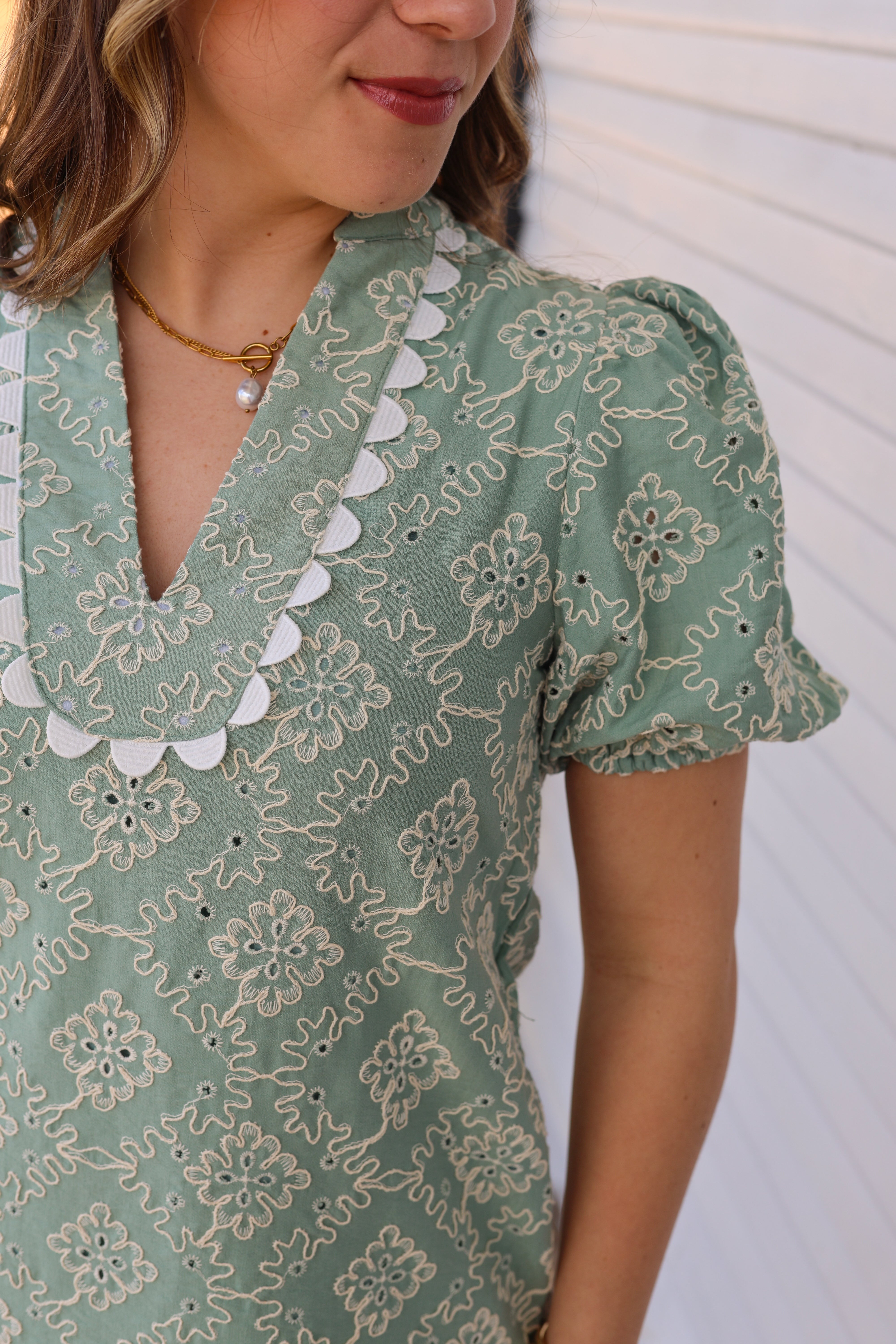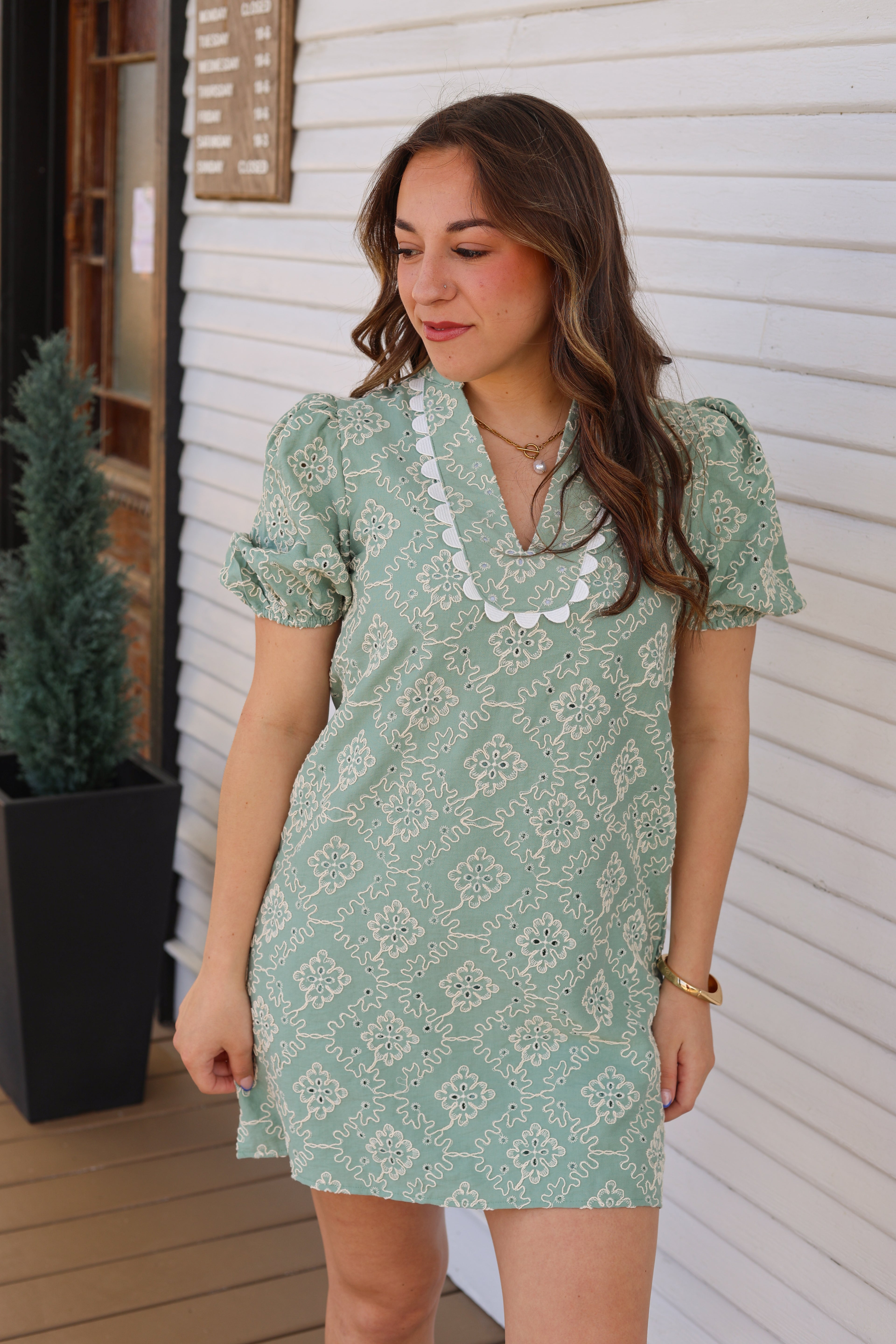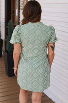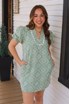 A mini dress featuring an allover embroidered pattern with a flattering V-neckline accented by scalloped trim. Designed with short puff sleeves, a fitted bodice, and a softly flared skirt.