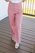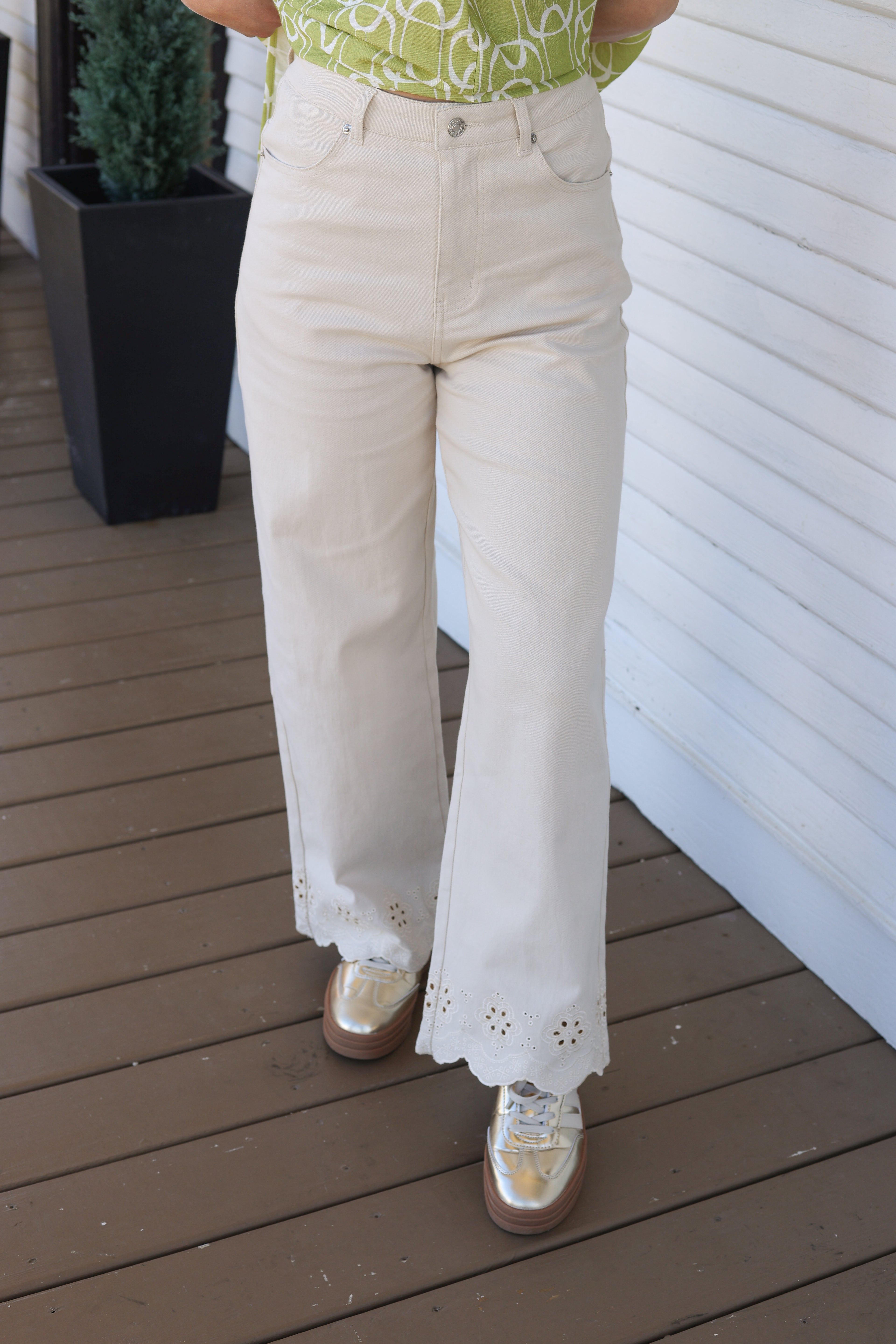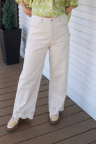 Elevate your style with our Eyelet Pants, featuring a roomy fit and chic eyelet details at the bottom. Perfect for a relaxed day out or dressy occasions, these straight wide pants offer both comfort and a trendy twist to any outfit.
