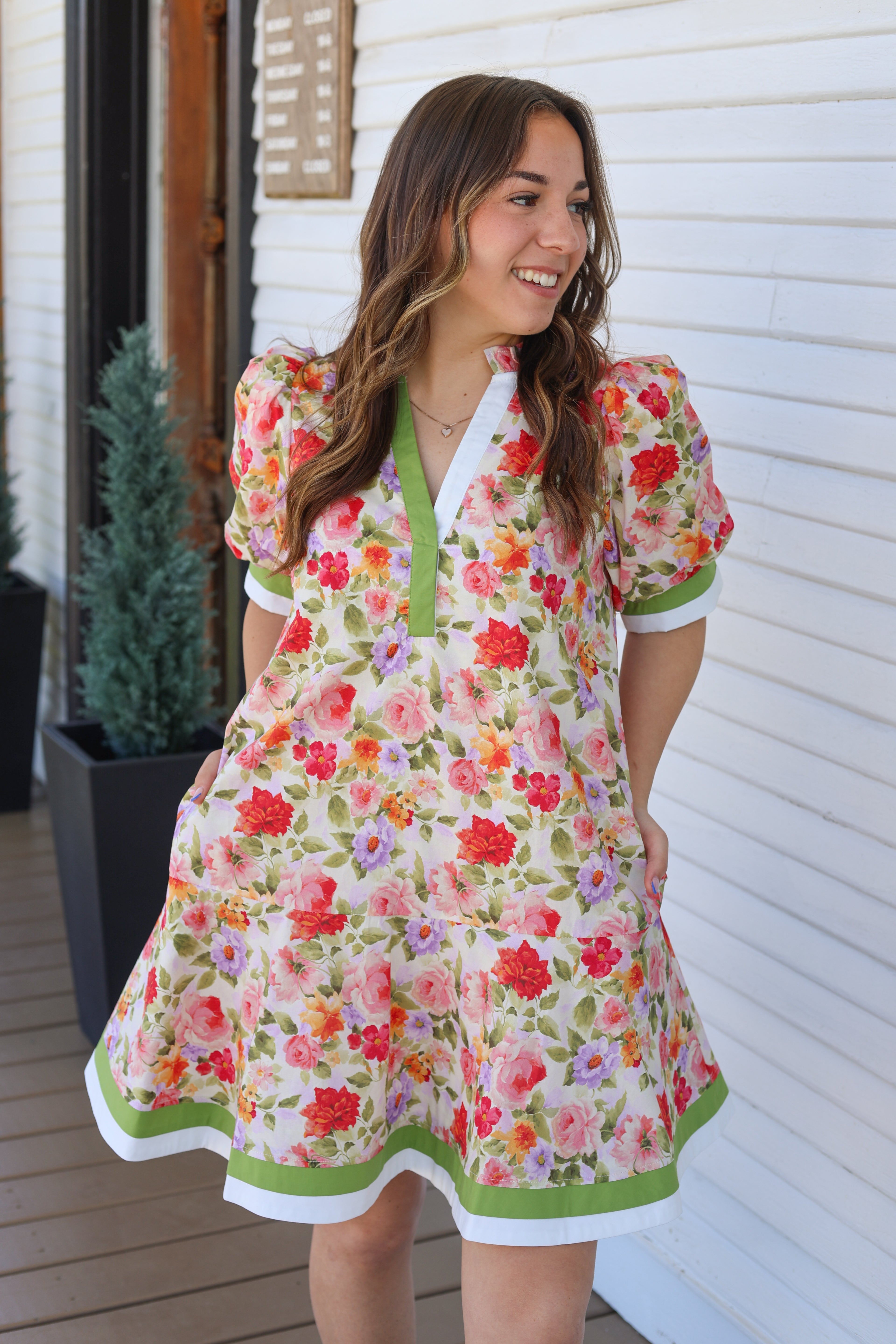 Elevate your spring wardrobe with this charming floral matcha dress. Delicate puff sleeves add a romantic touch, while the vibrant floral print brings life to any occasion. Bold contrast hem details create visual interest and a polished finish. Perfect for brunches, Spring parties, or casual outings, this versatile piece transitions seamlessly from day to night. Comfortable, stylish, and effortlessly chic.