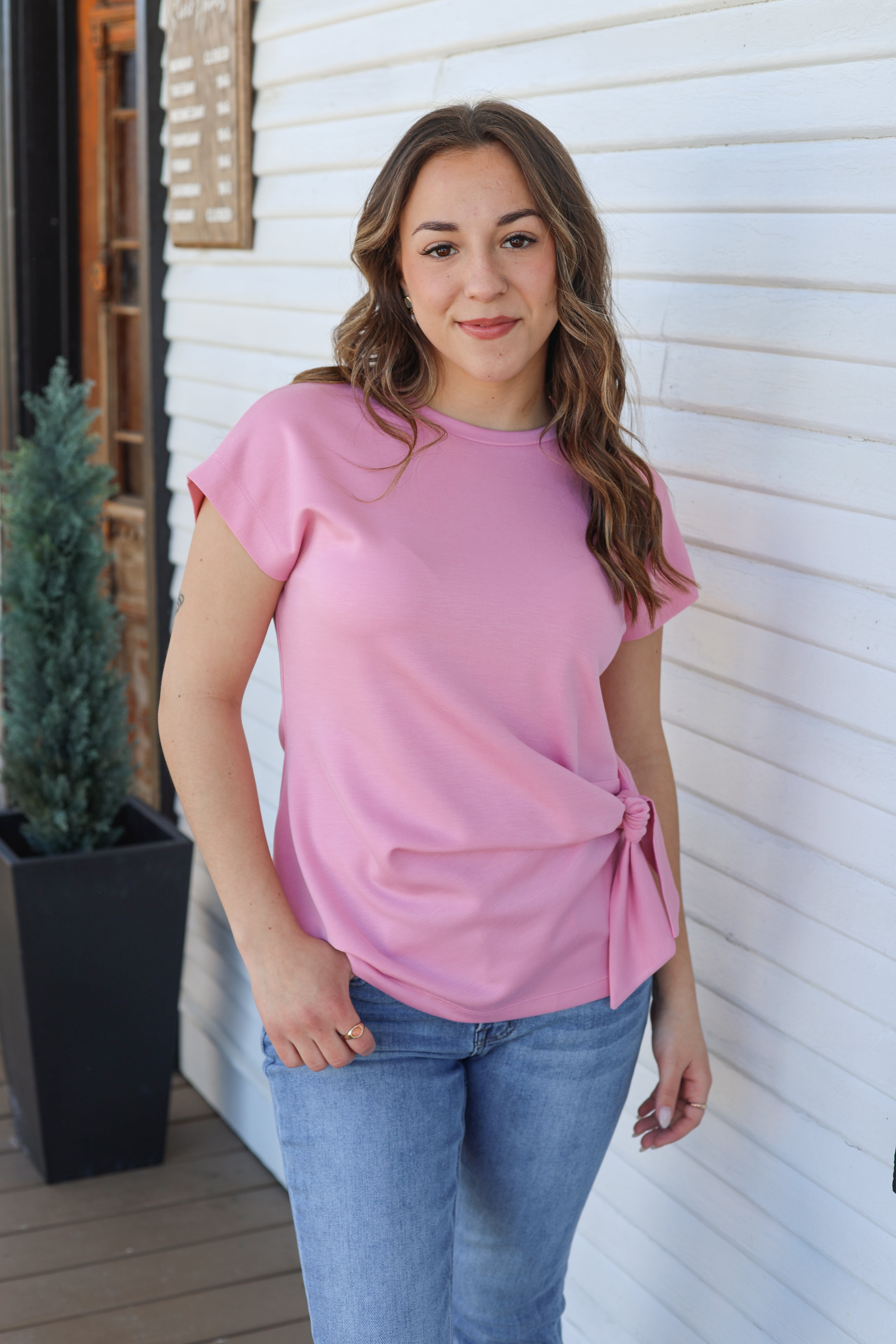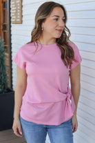 Effortless style meets comfort in this cap sleeve top, featuring a charming front knot detail that elevates your everyday look. The relaxed fit and breathable fabric make it perfect for layering or wearing solo, while the structured neckline adds just the right amount of polish. Whether you're dressing up for brunch or keeping it casual, this versatile piece transitions seamlessly from day to night.
