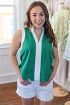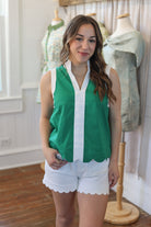 Sleeveless Kelly green top with scalloped hem and white contrast details