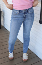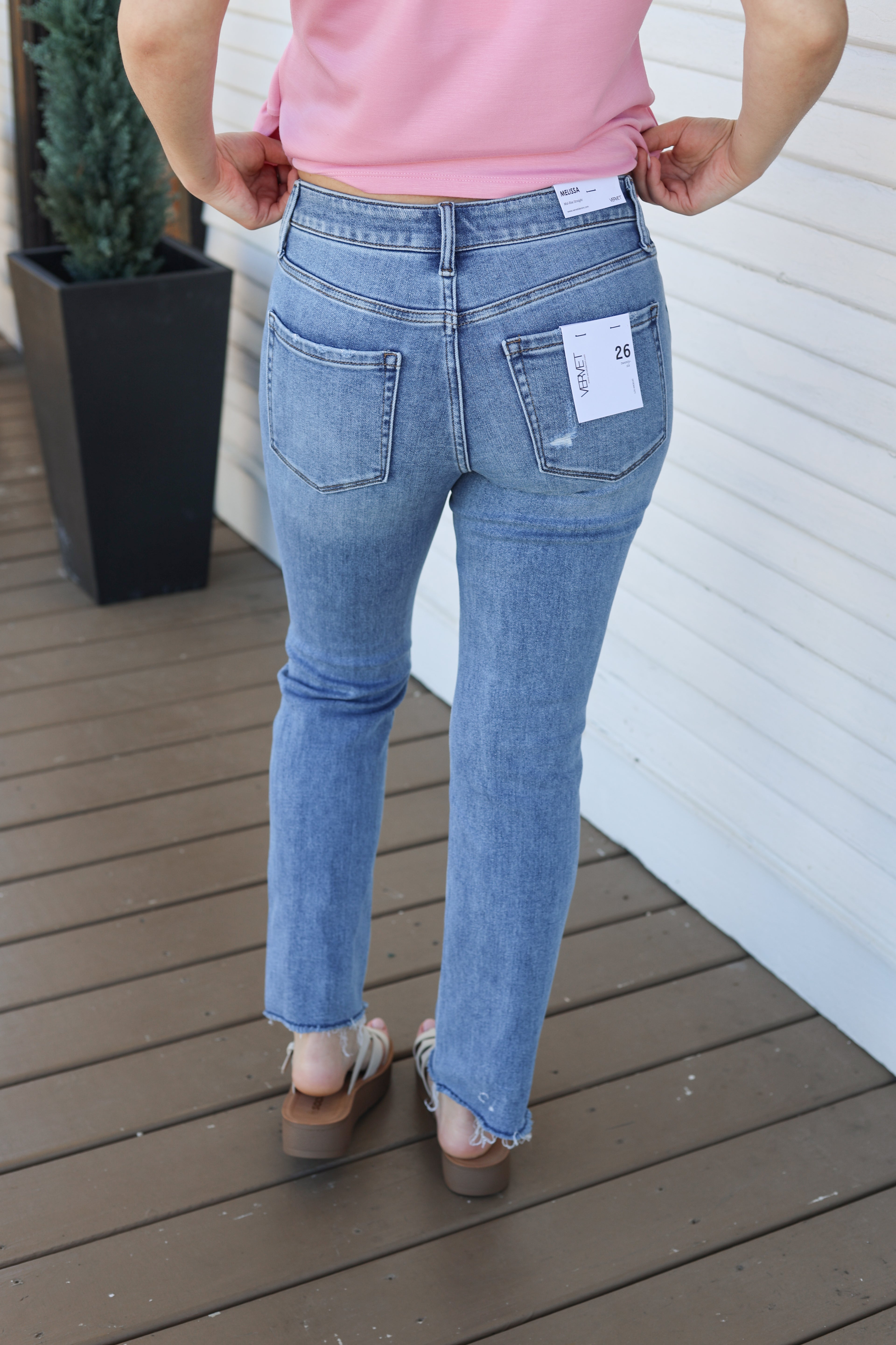 Vervet Mid Rise Medium Wash Raw Hem Crop Straight Jeans