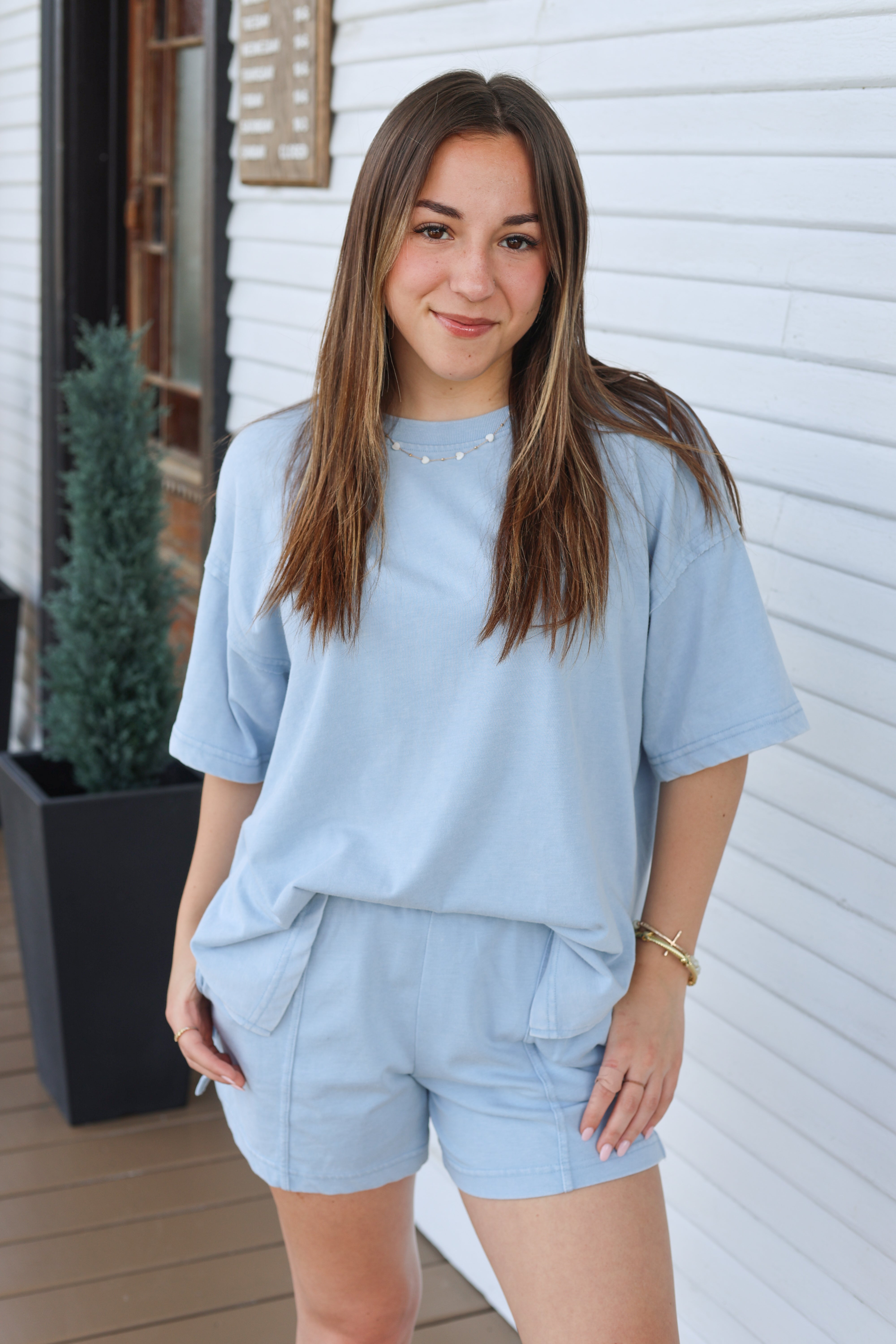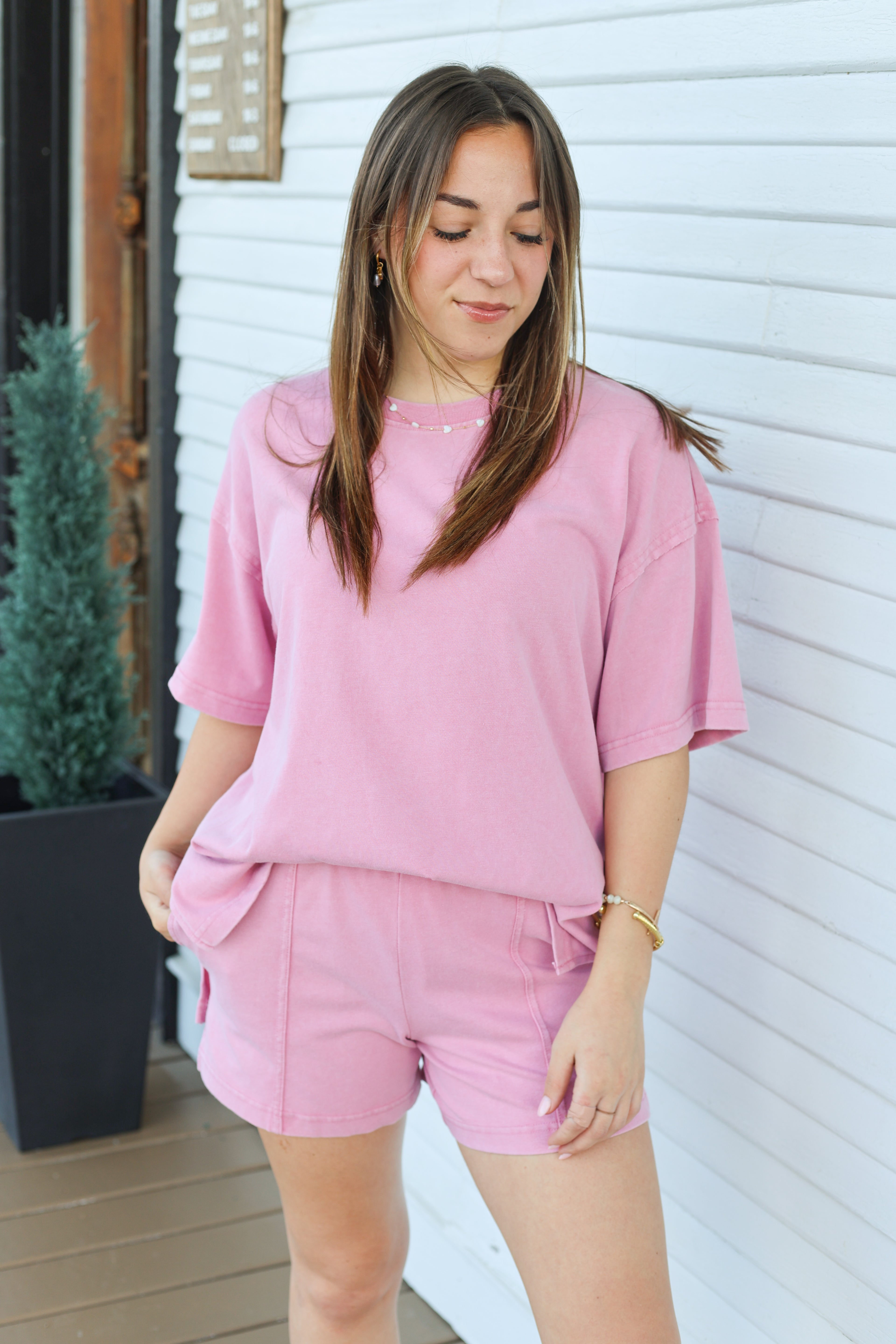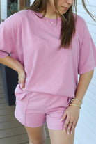 Effortlessly chic and undeniably comfortable, this mineral washed short set features flattering side slits that add movement and style. The soft, relaxed fit makes it perfect for casual days—whether you're running errands, meeting friends, or lounging at home. The unique mineral wash gives each piece a one-of-a-kind vintage appeal. Pair it with sneakers for an easy weekend look or dress it up with accessories for a night out.