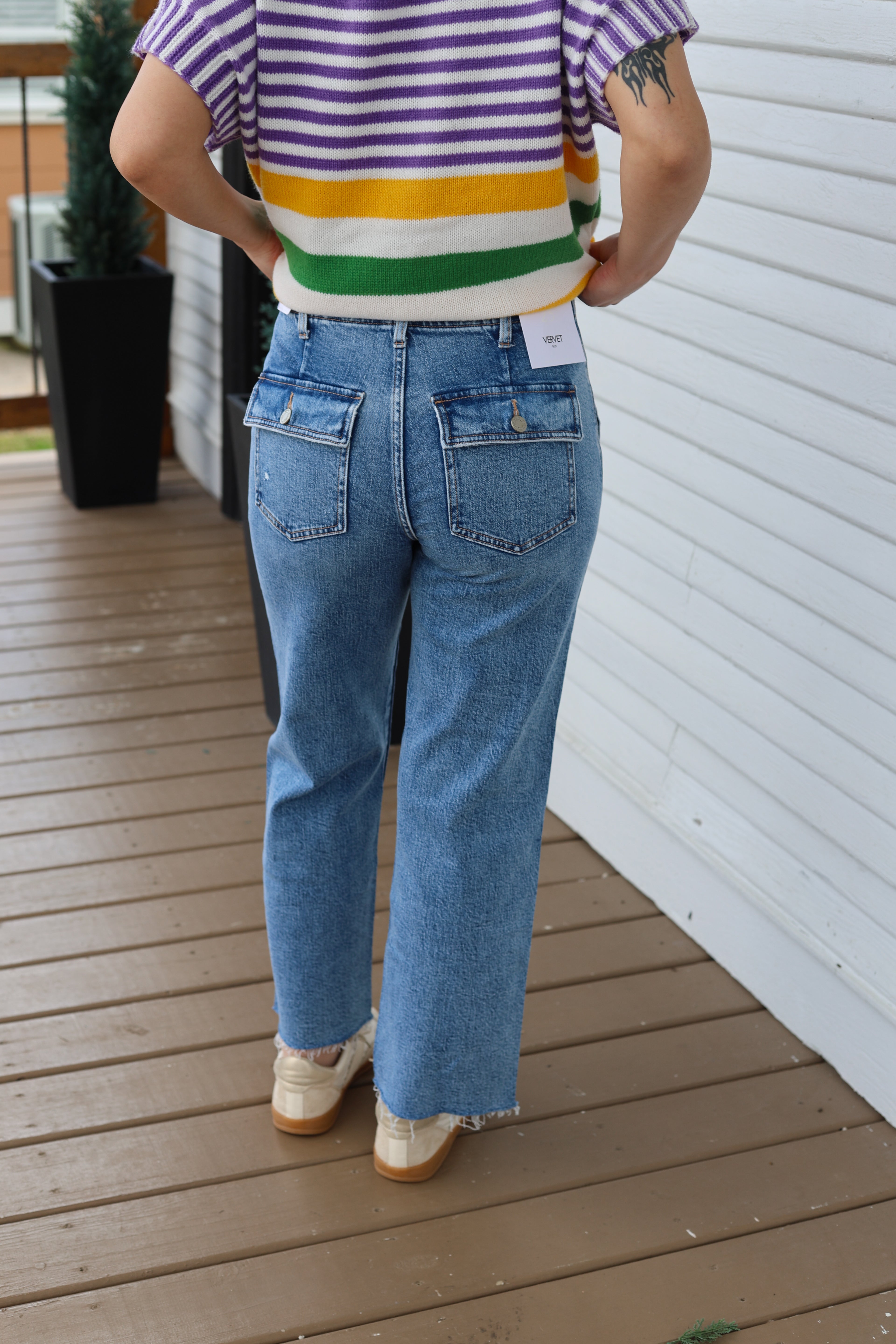 Hanna is pictured in a size large in all items. She wears a size 29 in denim!