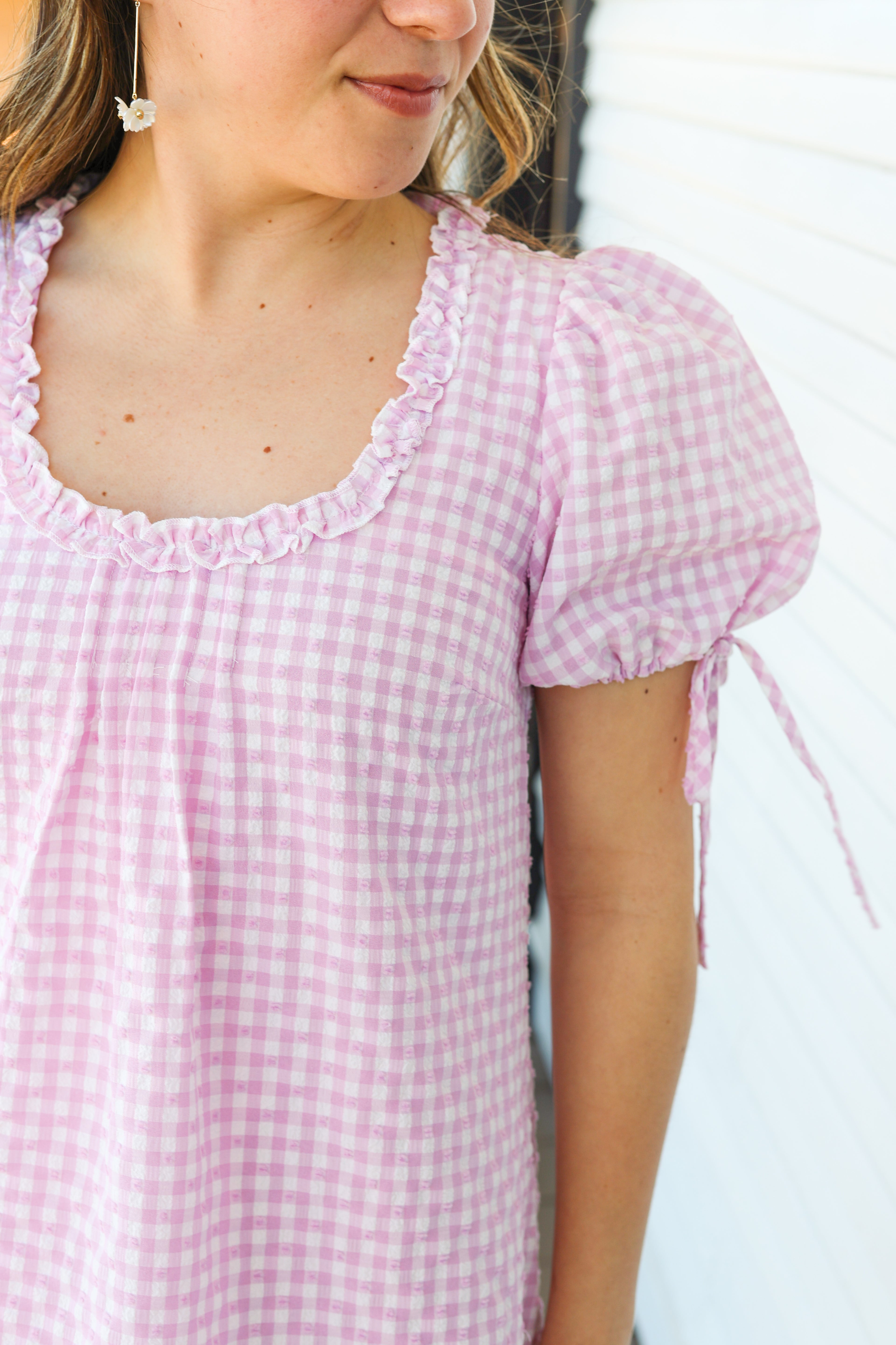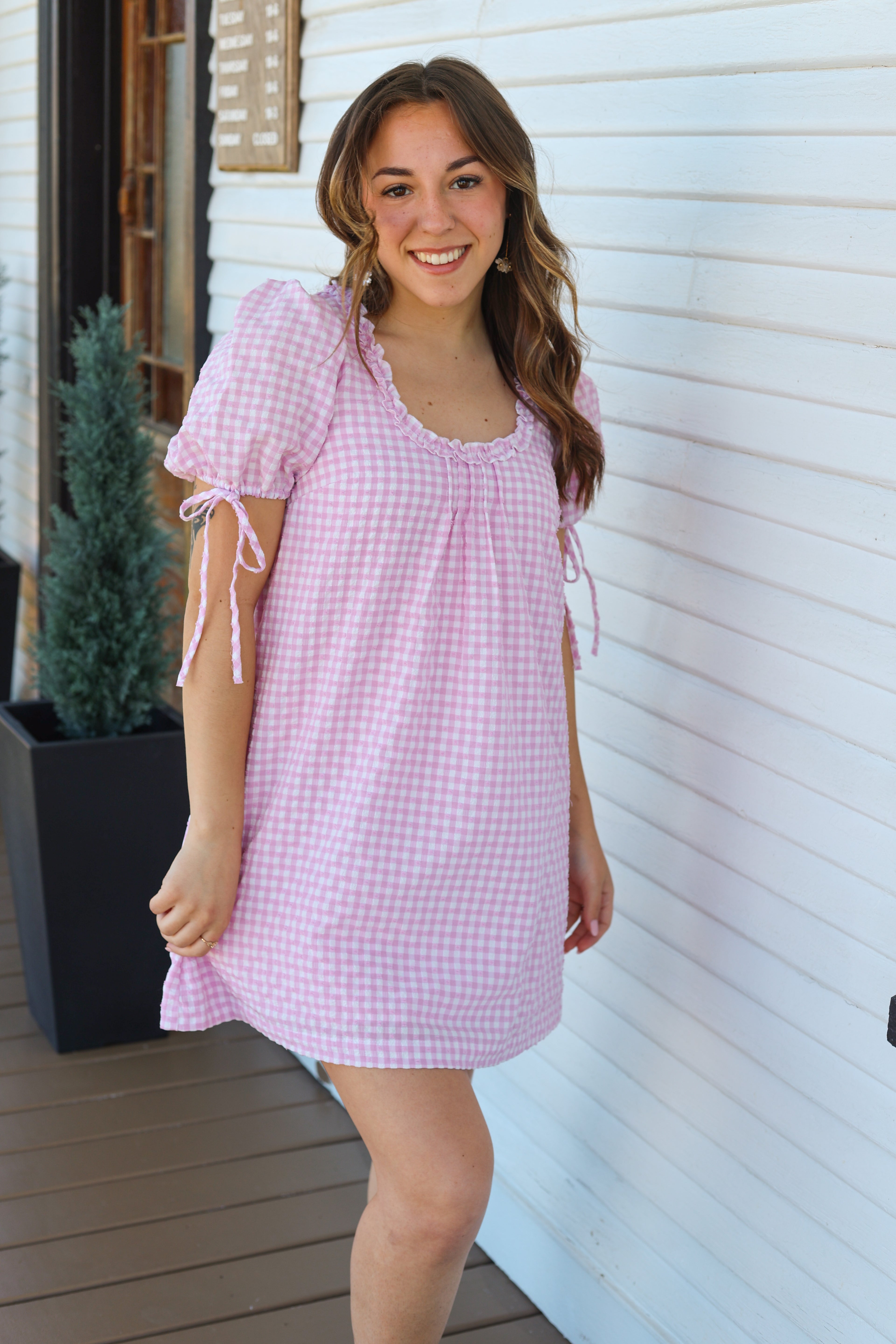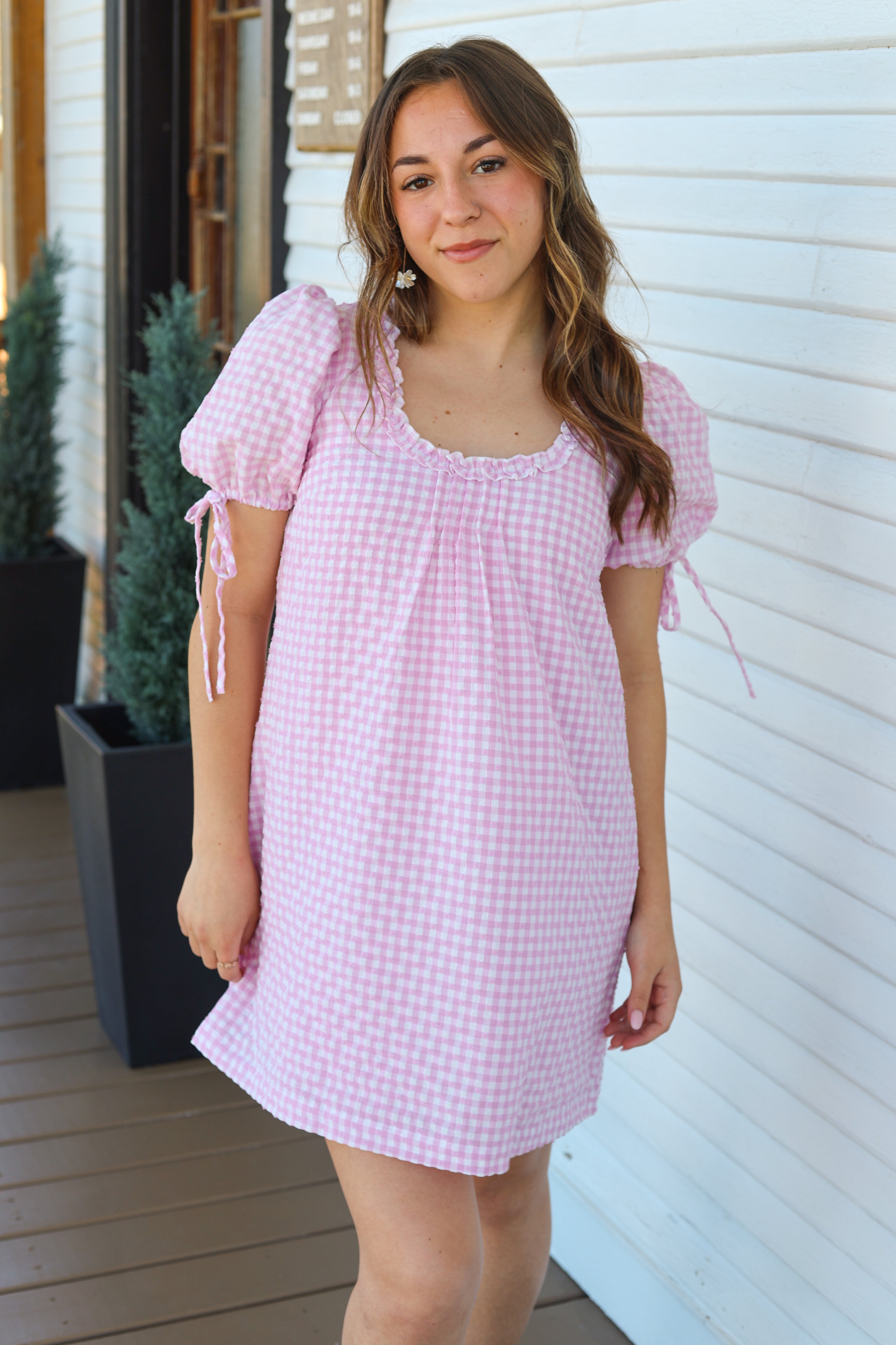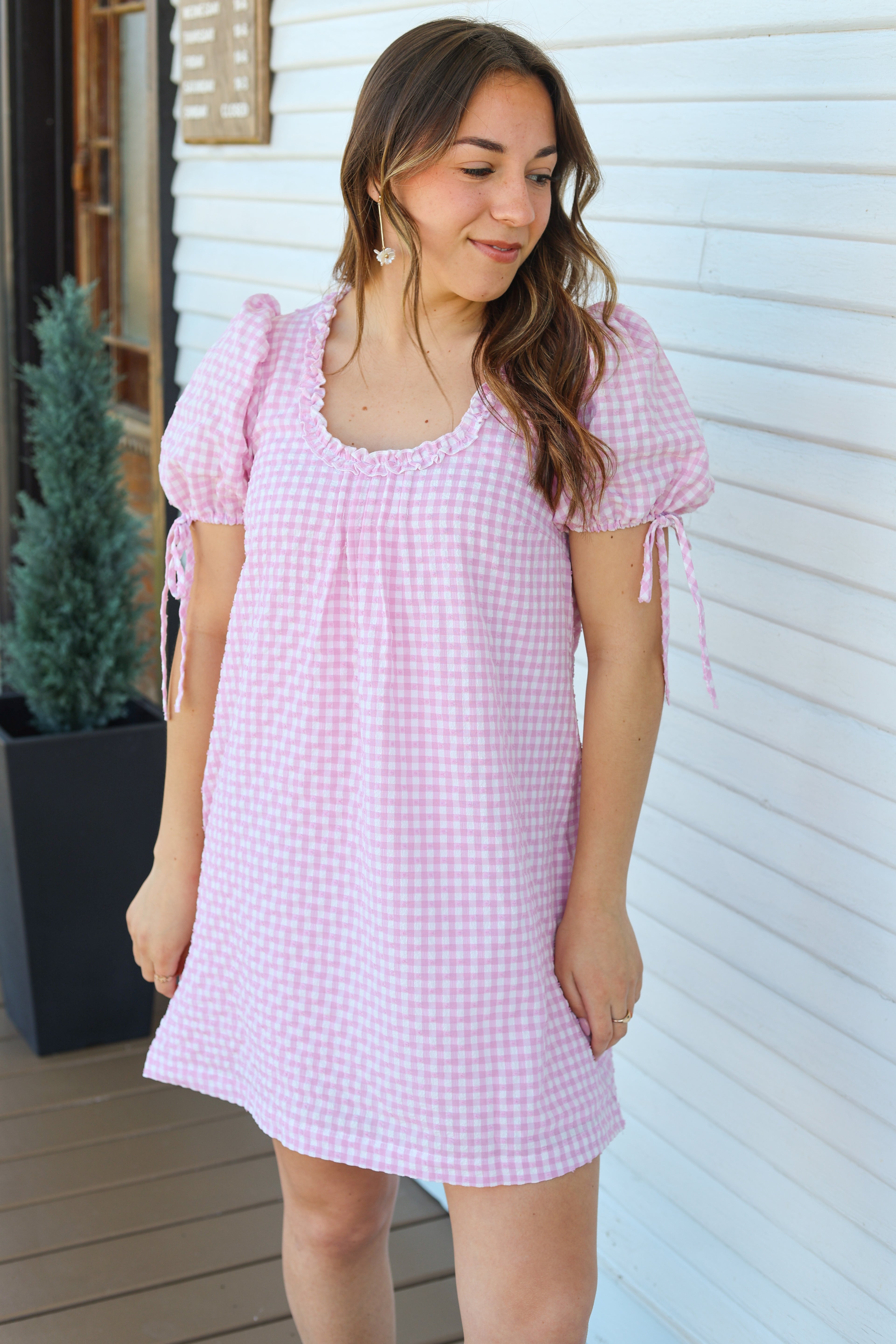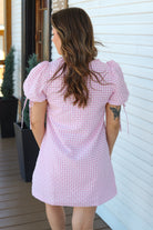 Pink Gingham Puff Sleeve Mini Dress - Sweet & Effortless Everyday Style Stay effortlessly cute in this pink gingham puff-sleeve mini dress. Designed with a relaxed A-line silhouette, soft textured gingham fabric, and dainty ruffle neckline, this dress is perfect for warm-weather outings. Adjustable tie sleeves add a charming touch while ensuring a comfortable fit. Easy, airy, and feminine - your go-to dress for brunch, weekends, and sunny days.