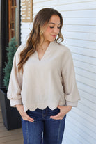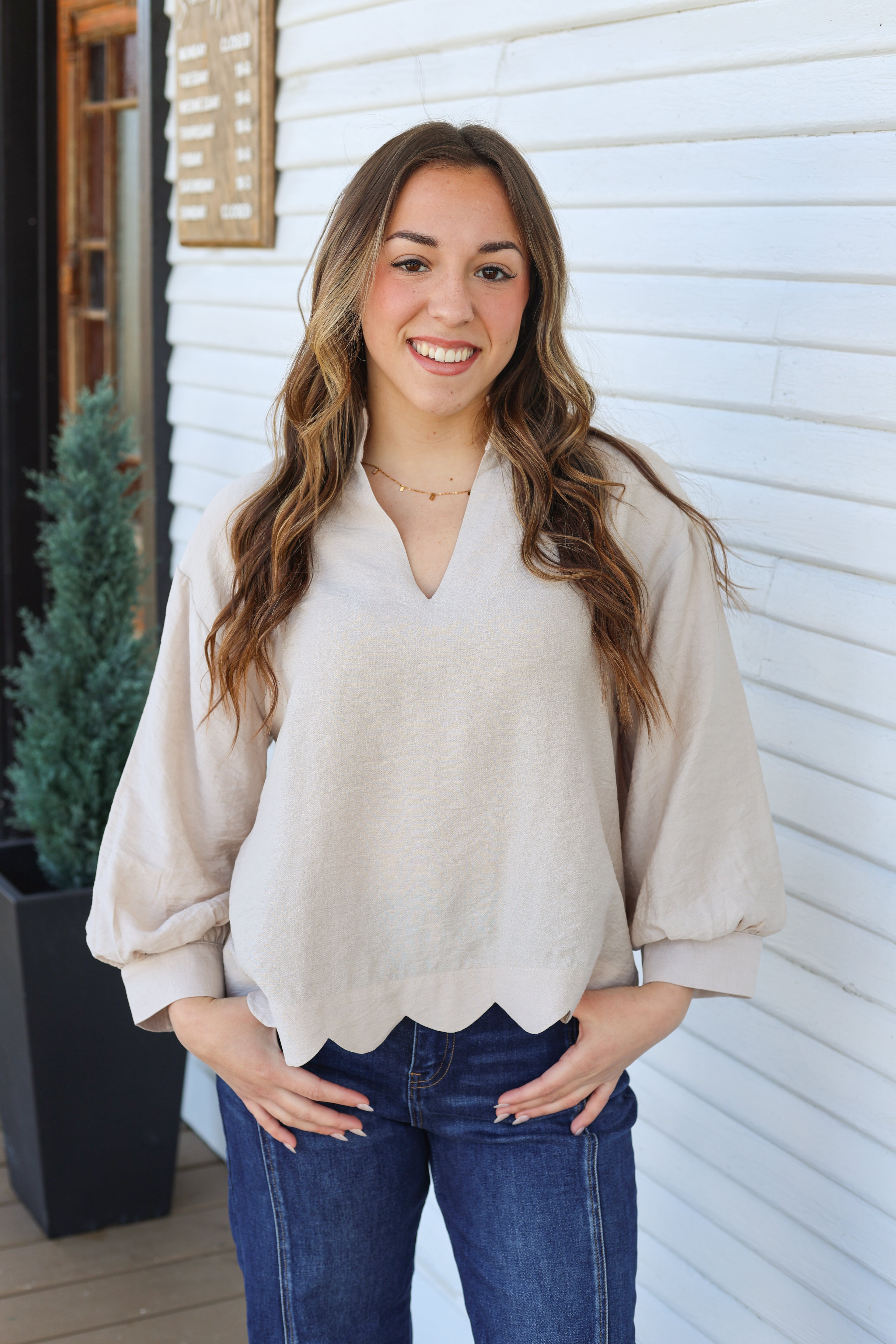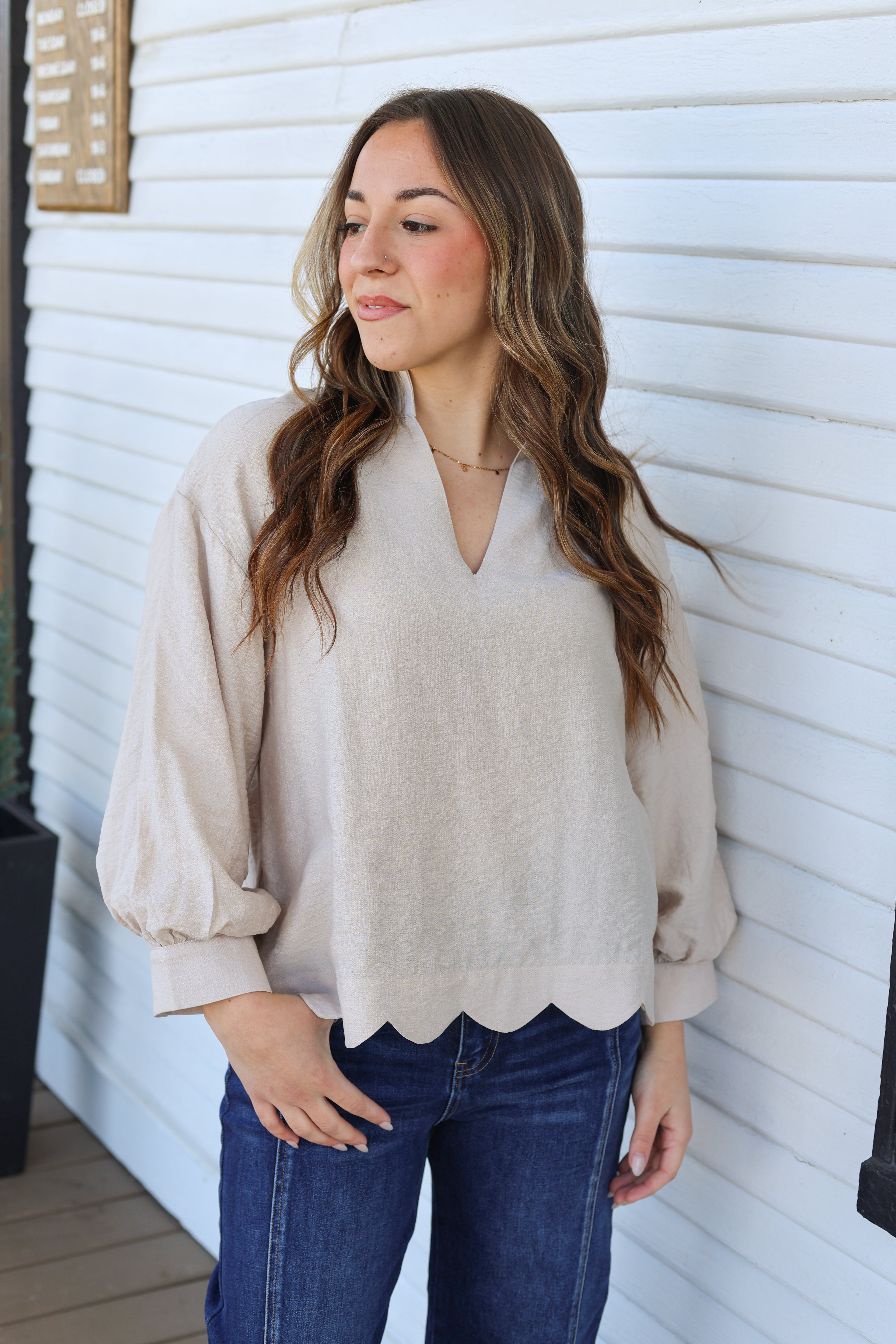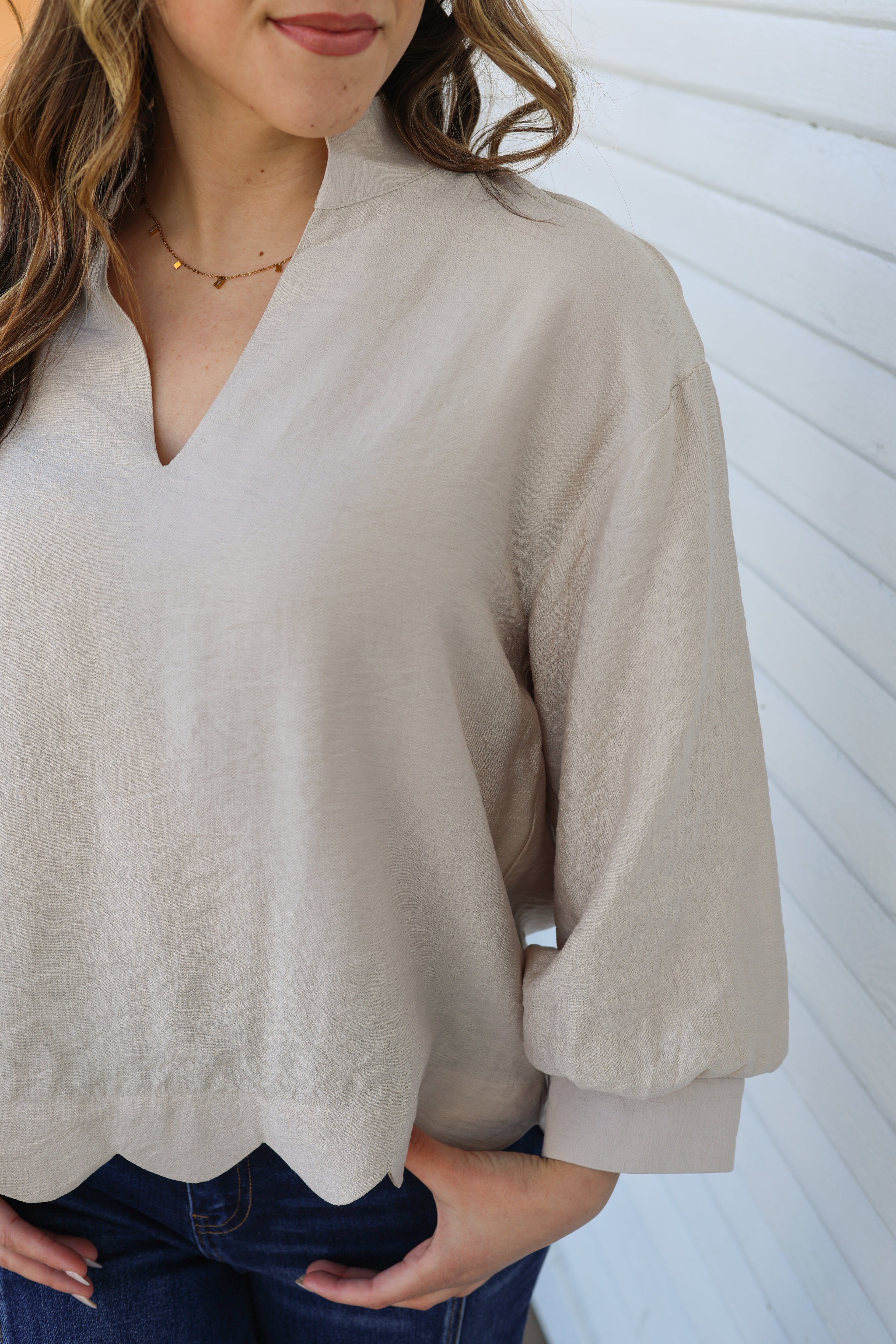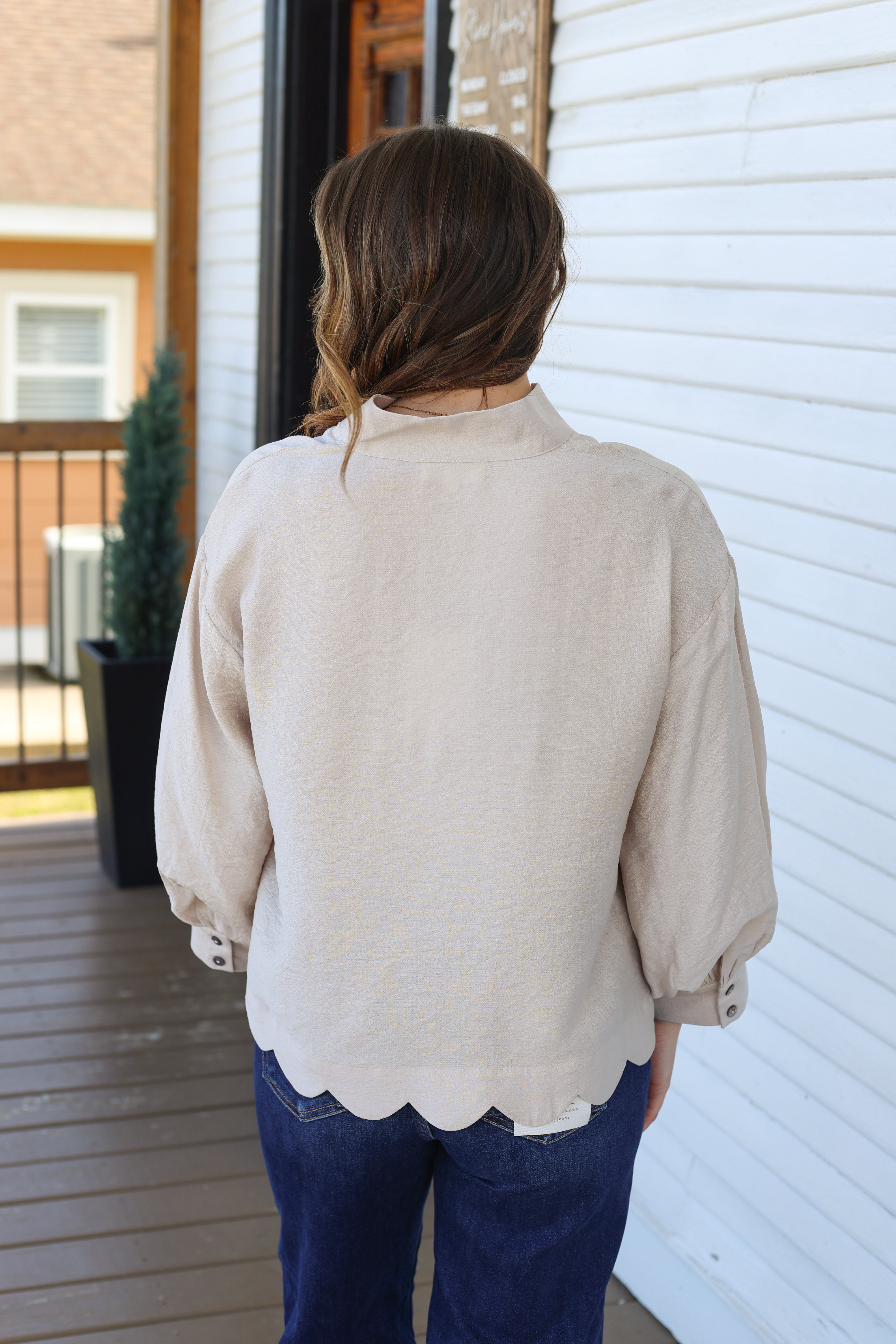 taupe colored top, 3/4 length sleeves, scalloped hem, buttoned cuffs