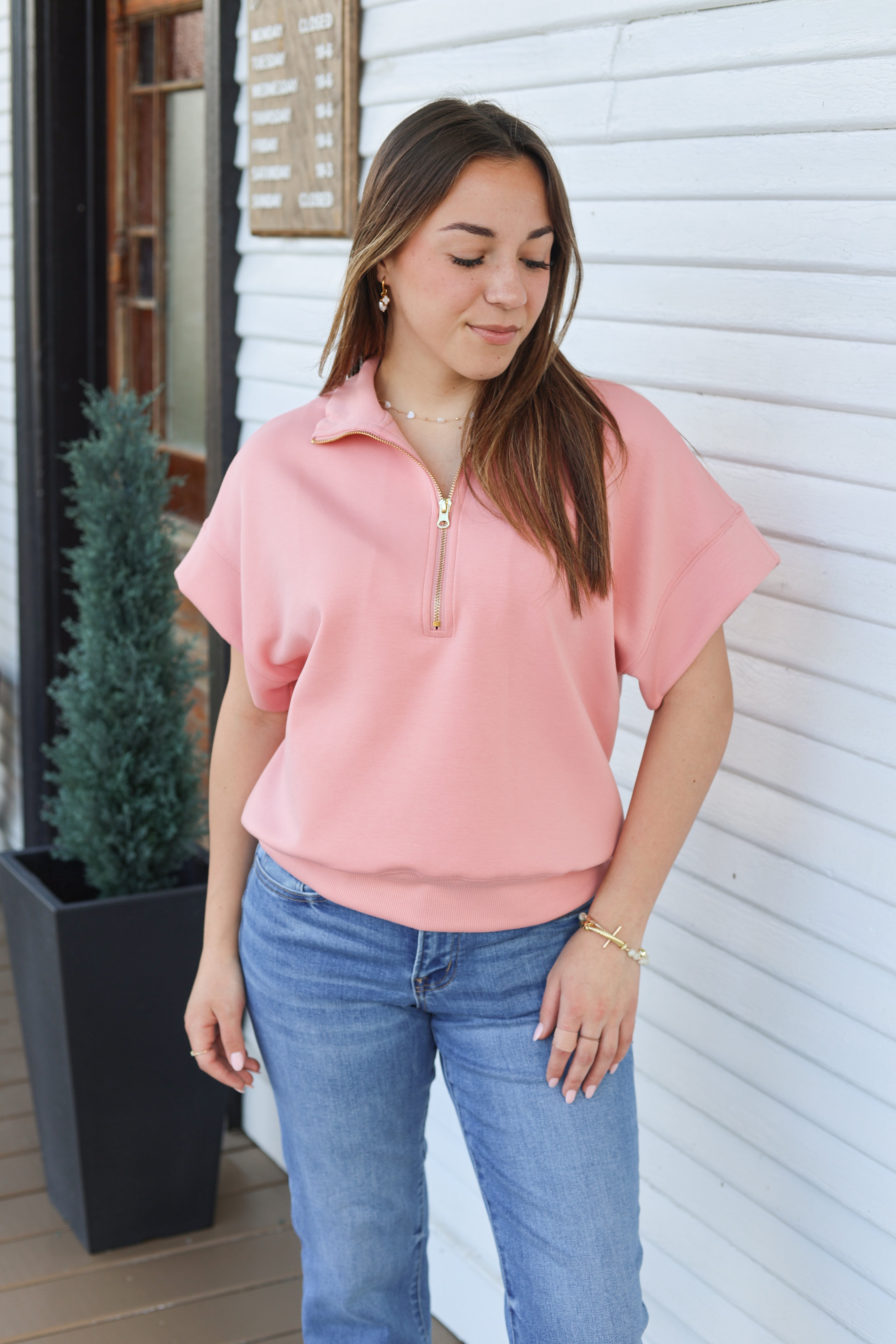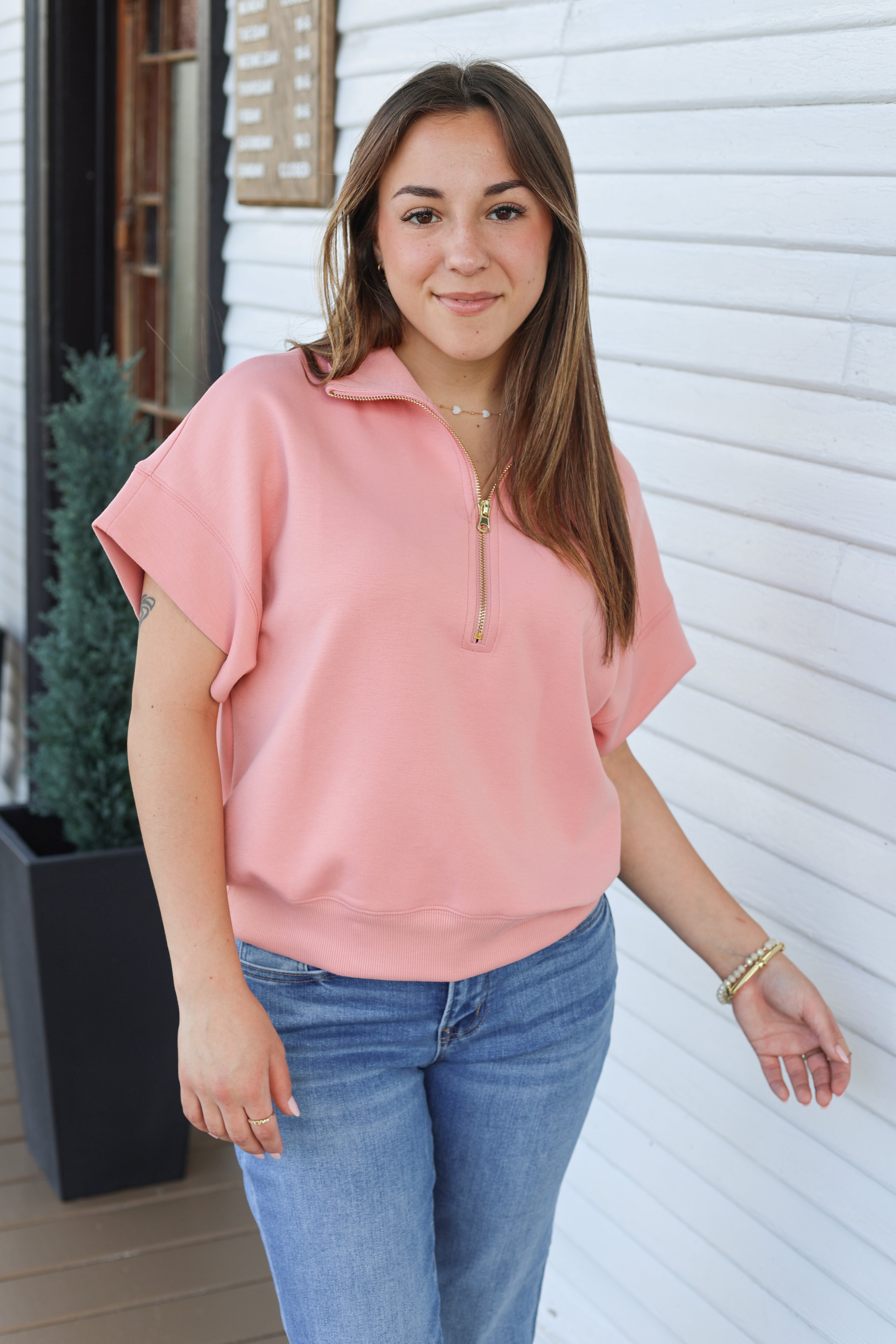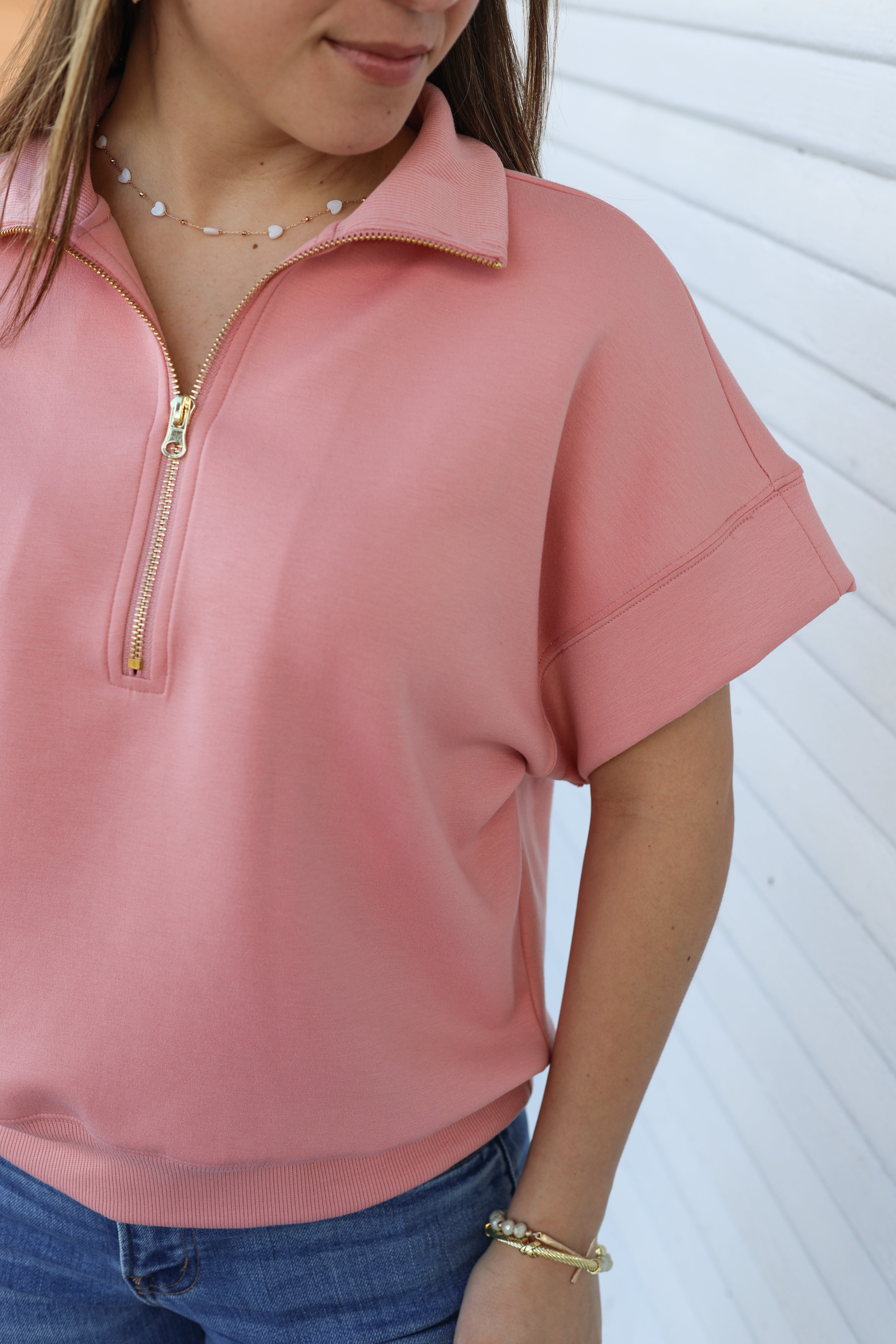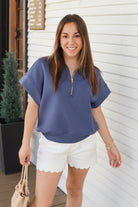 Dive into comfort with this Scuba High Neck Half Zip Short Sleeve Pullover. Designed for casual layering and active wear, the high neckline provides extra coverage while the half zip allows easy ventilation and adjustability. Soft scuba knit fabric offers a cozy, relaxed fit perfect for cool days or post-workout wear. The short sleeves make it ideal for transitional seasons, while the structured pullover silhouette flatters any frame. Whether you're running errands or heading to the gym, this versatile piece pairs effortlessly with your favorite bottoms for an effortless, put-together look.