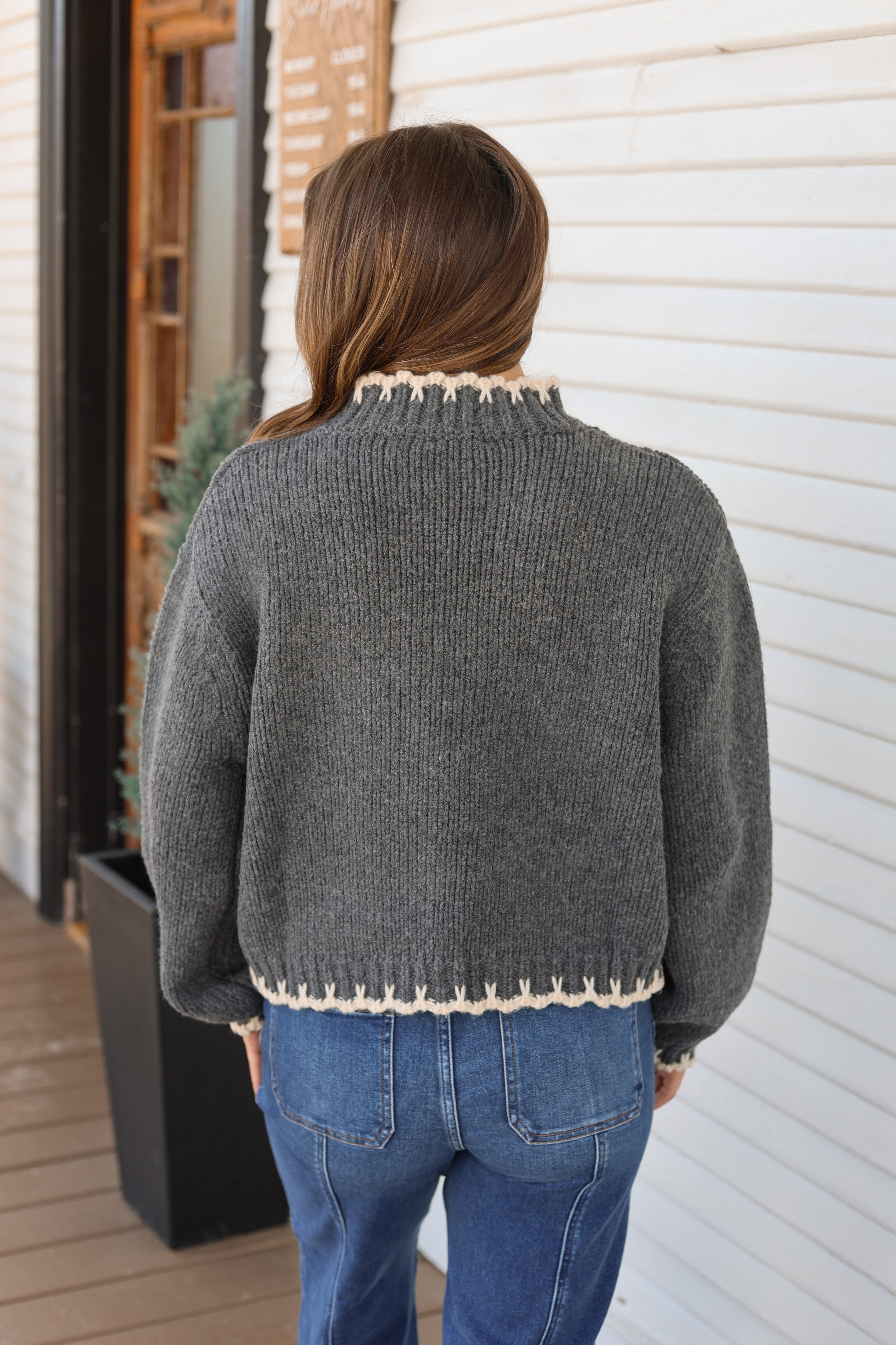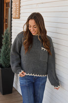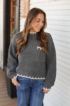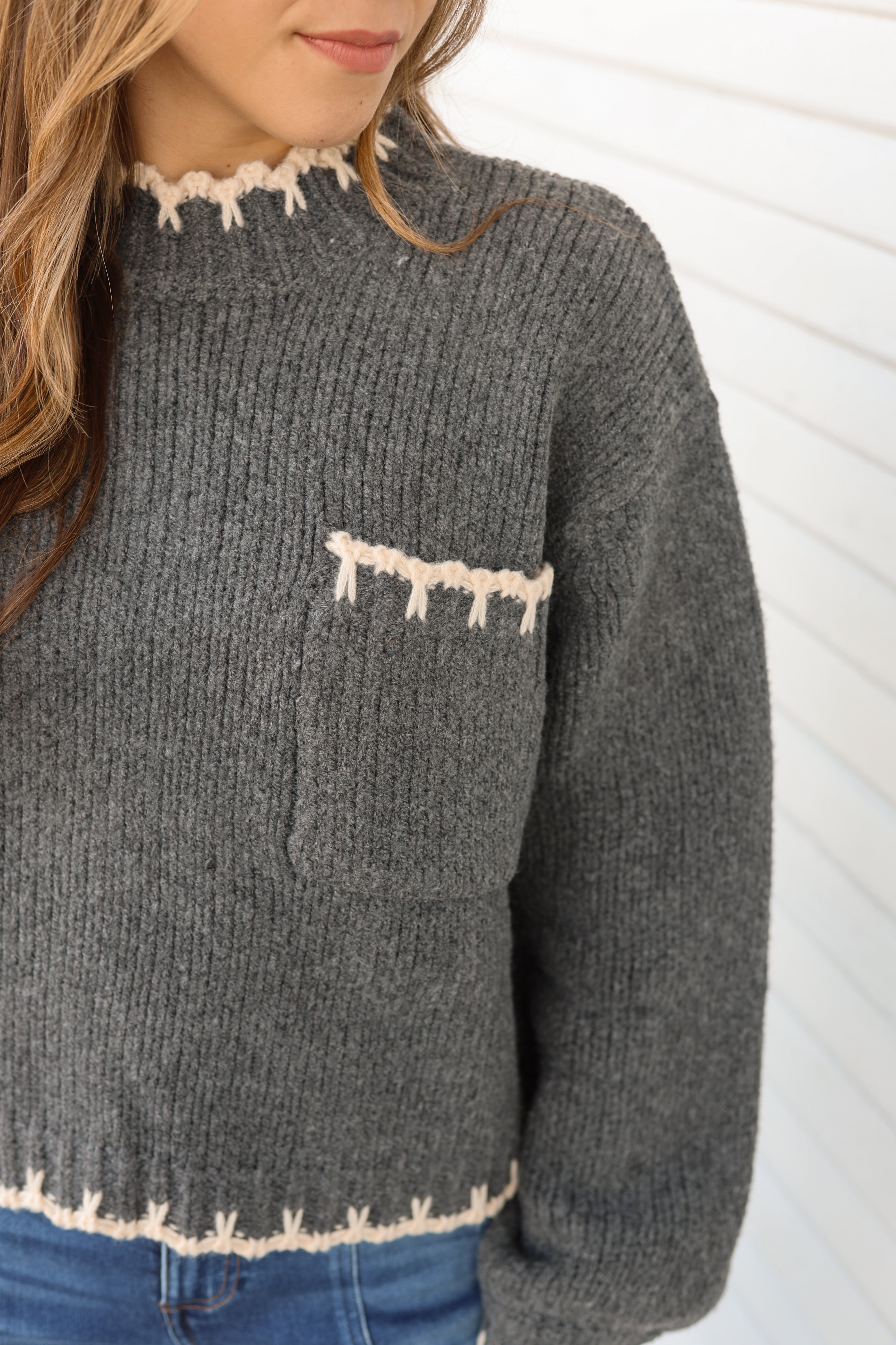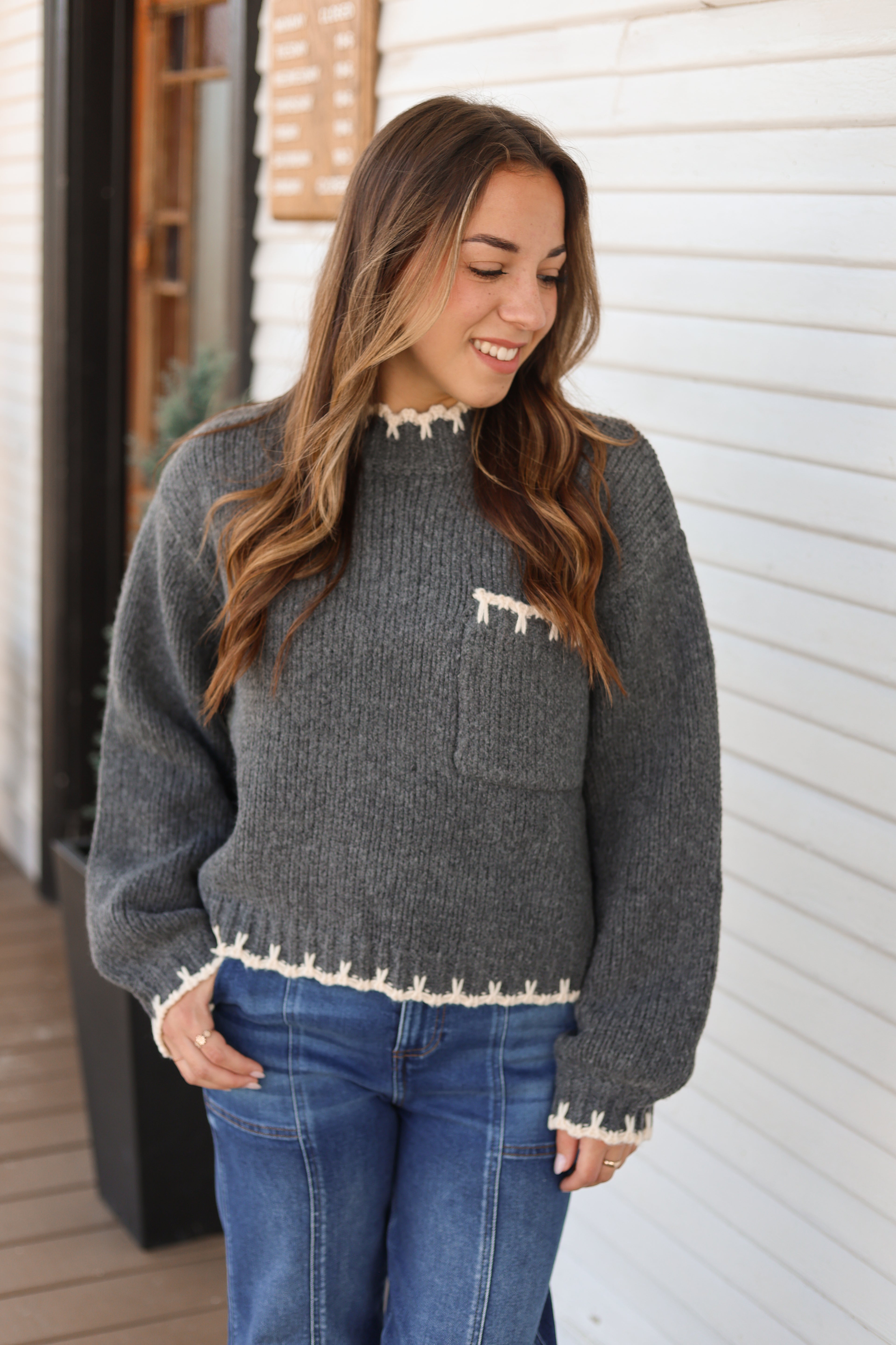 Meet your new favorite sweater! This charcoal beauty is all about that cozy, slouchy vibe with playful cream stitching outline details that make it totally unique. Toss in a functional front pocket, and you've got yourself a sweater that's as practical as it is adorable. Perfect for those days when you want to feel wrapped up in comfort without sacrificing style. Layer it, lounge in it, love it!