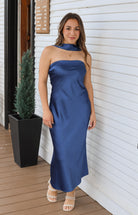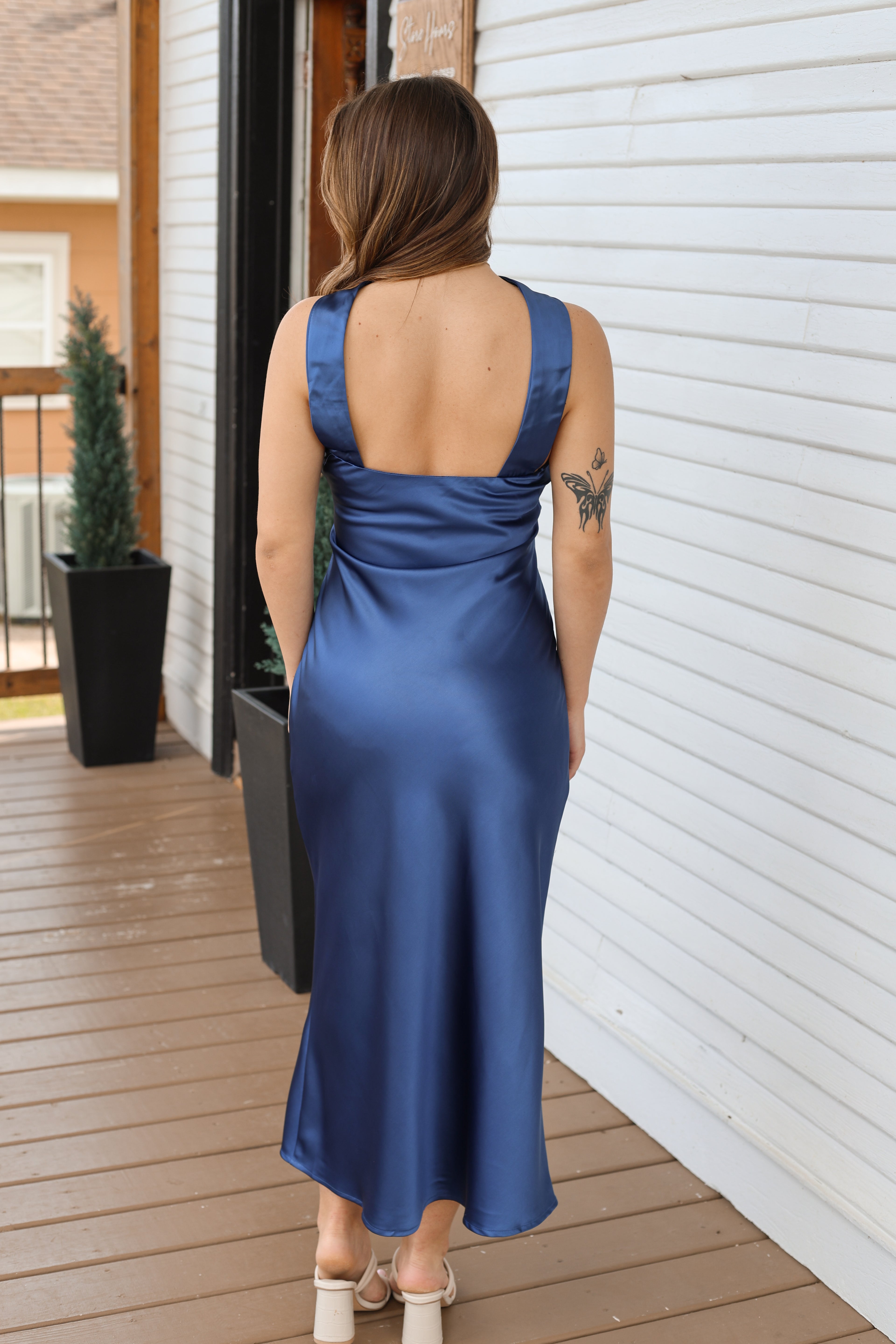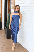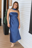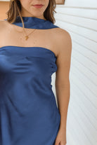 Slip into effortless elegance with this stunning strapless satin midi dress in deep blue. The graceful scarf detail adds a touch of sophistication and movement, making it the perfect choice for wedding celebrations and special occasions. The luxurious satin fabric drapes beautifully, creating a polished silhouette that feels both comfortable and refined. Whether you're attending a ceremony or reception, this dress delivers timeless style with modern flair. You'll feel absolutely gorgeous from the moment you put it on!