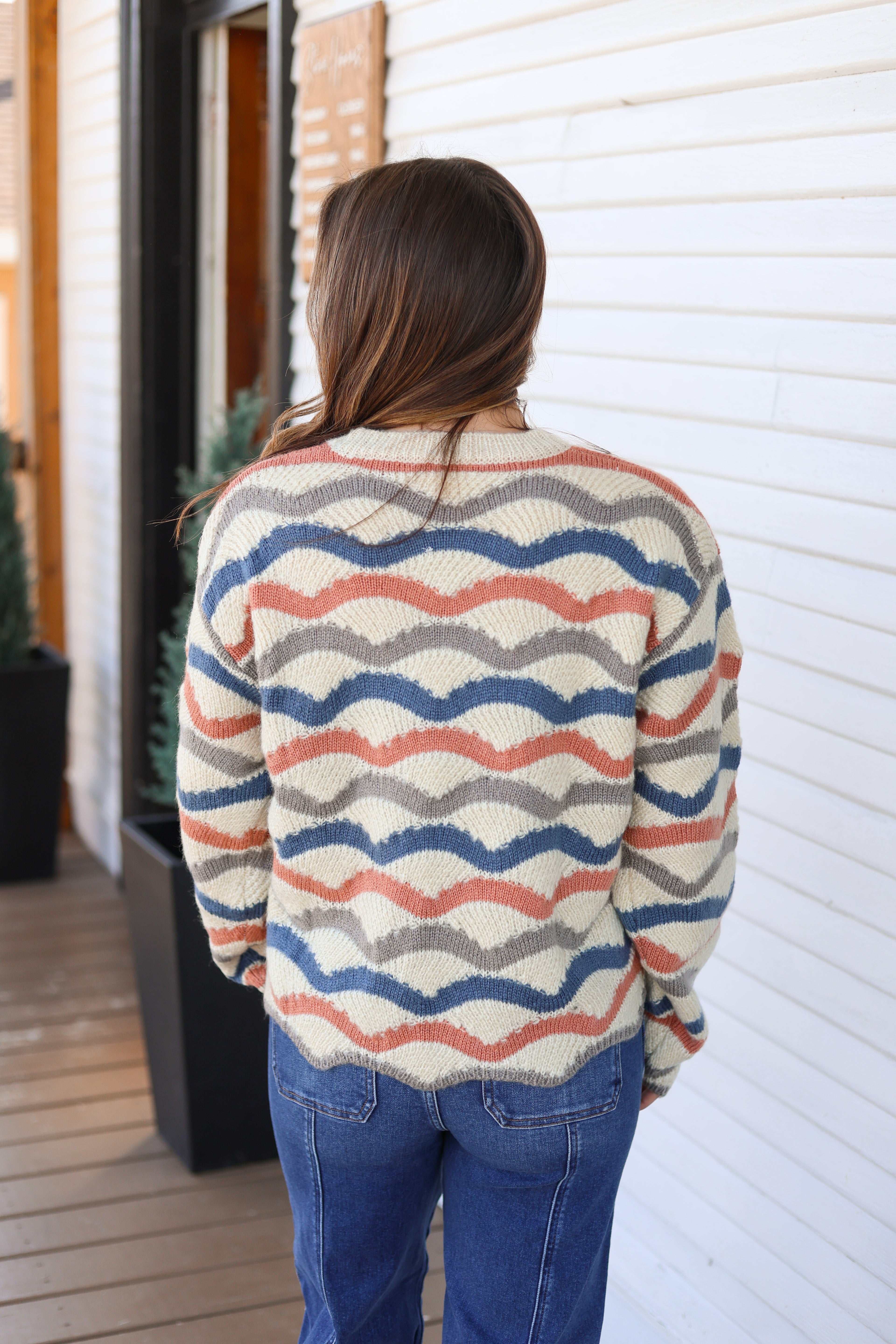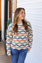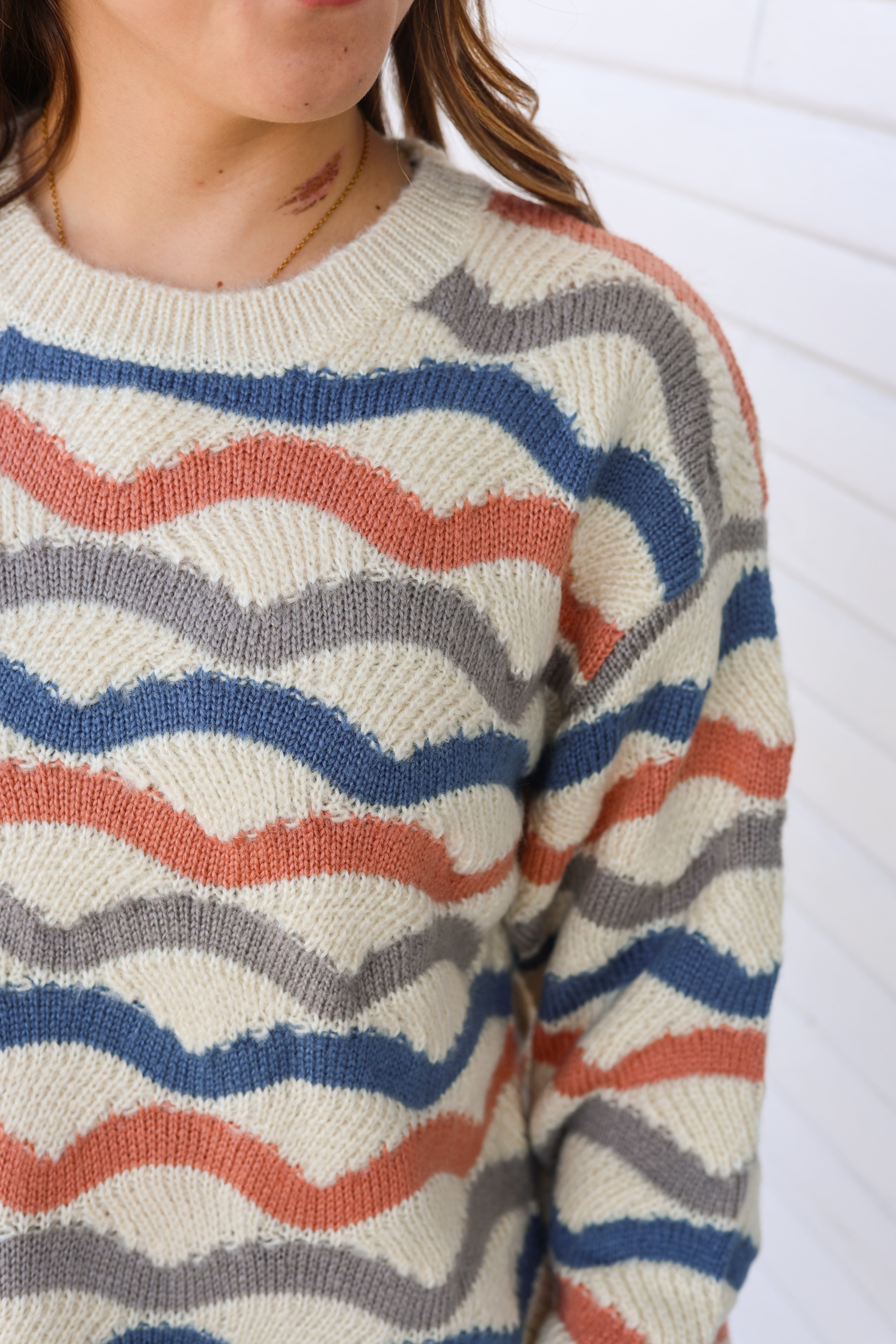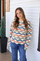 Wrap yourself in comfort with this dreamy cream knit sweater that's anything but ordinary. Featuring playful wavy details in dusty blue, rust, and charcoal that dance across the fabric, this long-sleeve beauty brings movement and personality to your everyday wardrobe. The wavy hem adds an extra touch of whimsy to the cozy silhouette. Perfect for those moments when you want to feel snug, stylish, and just a little bit fun. Layer it, love it, live in it.