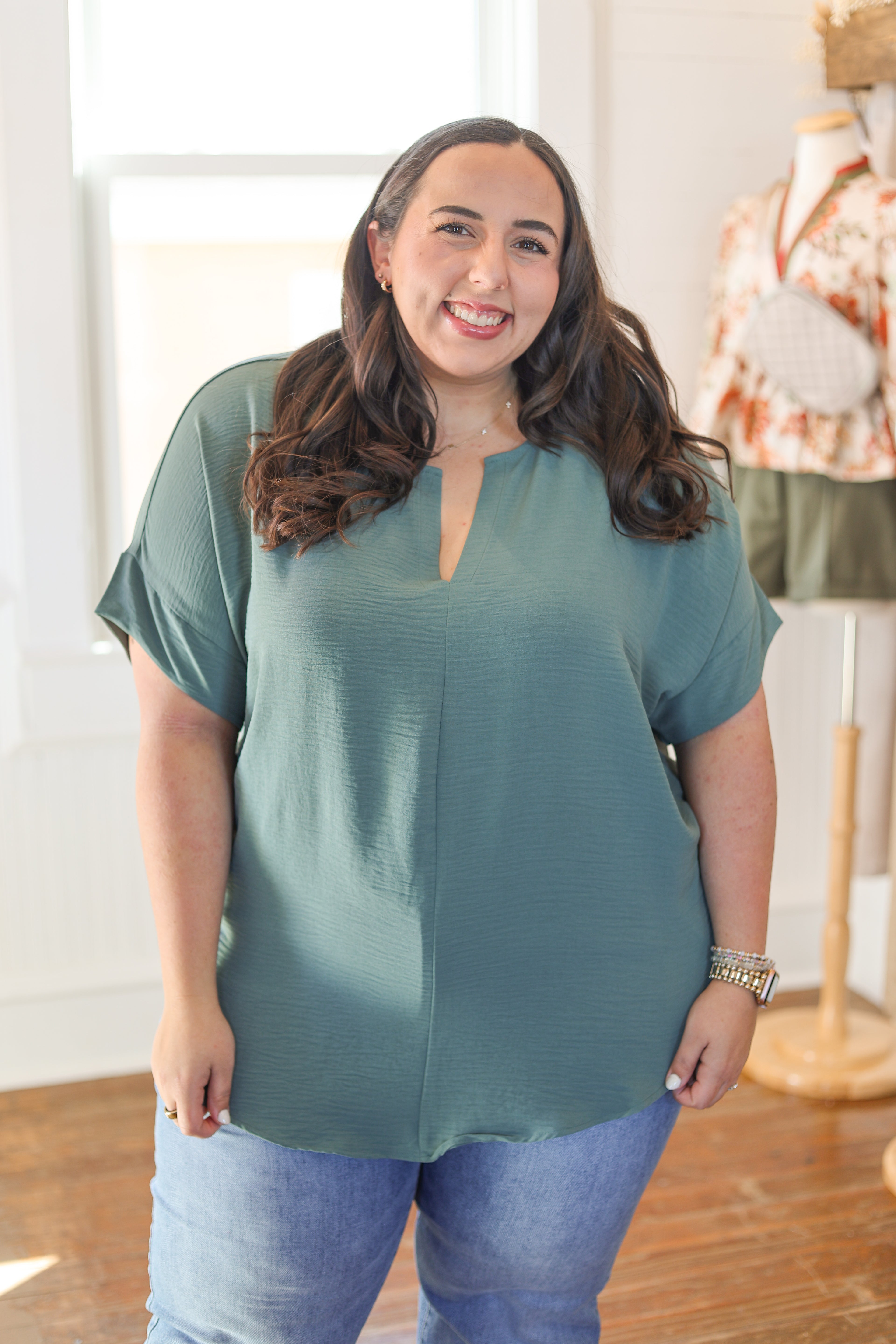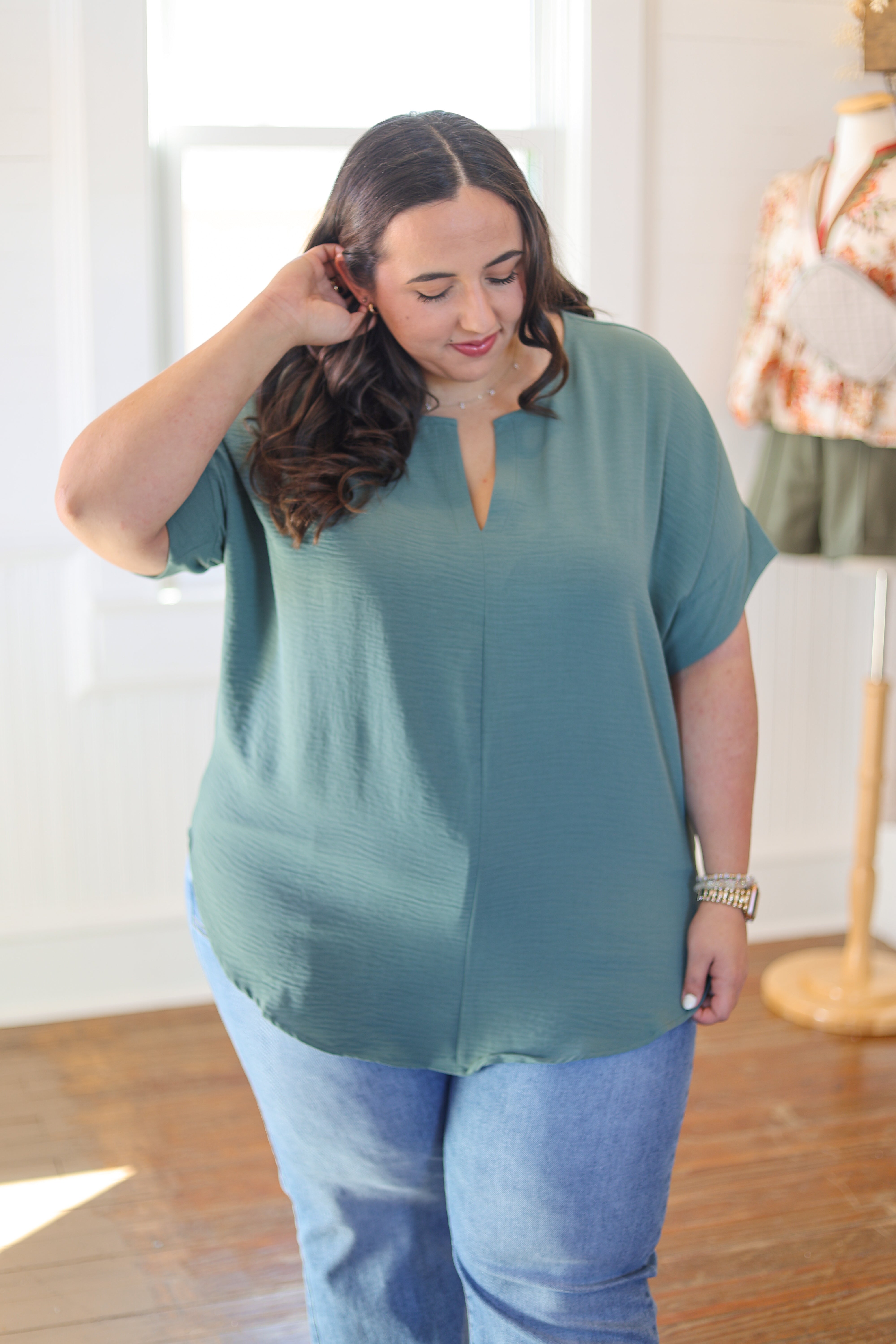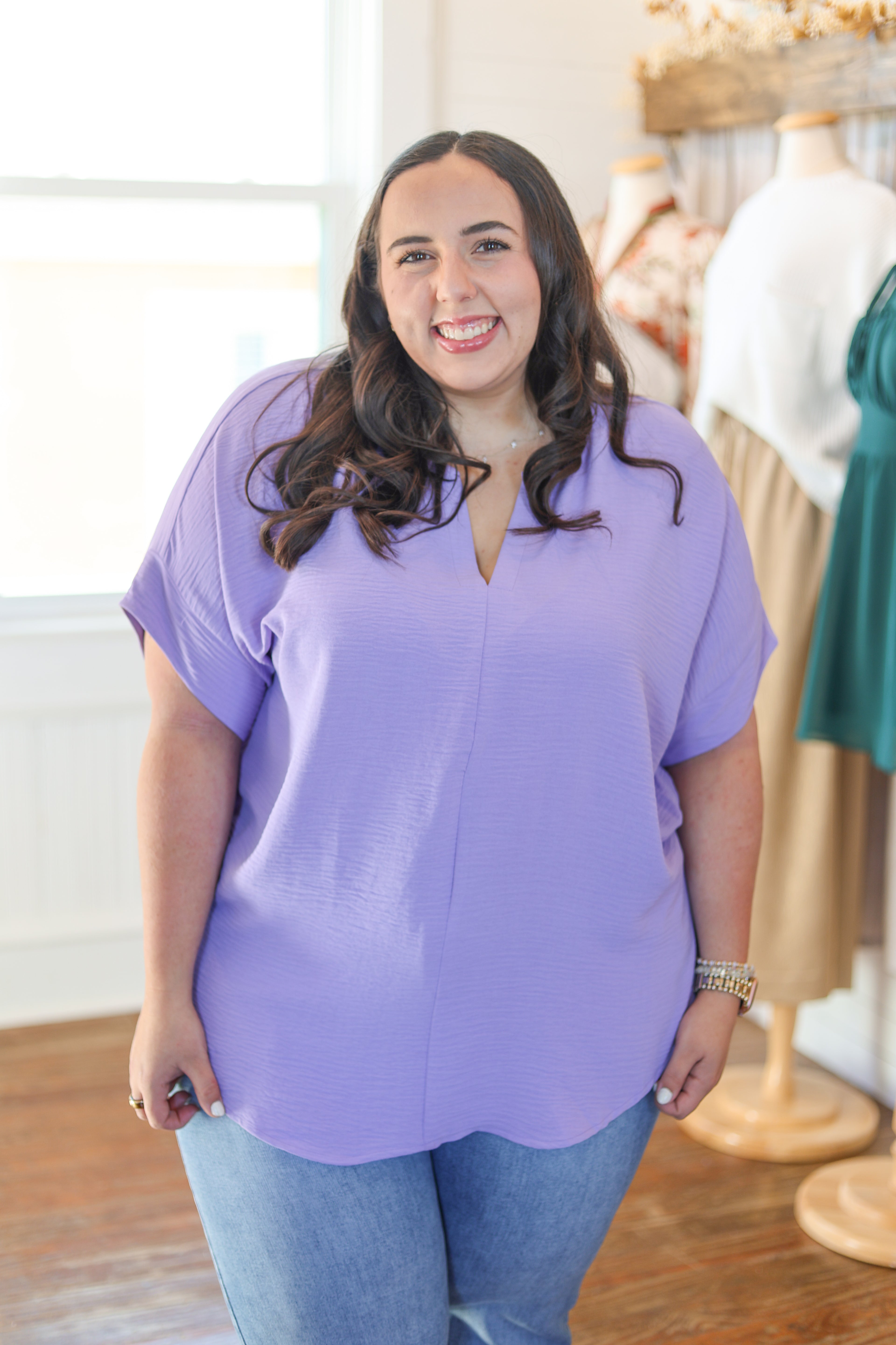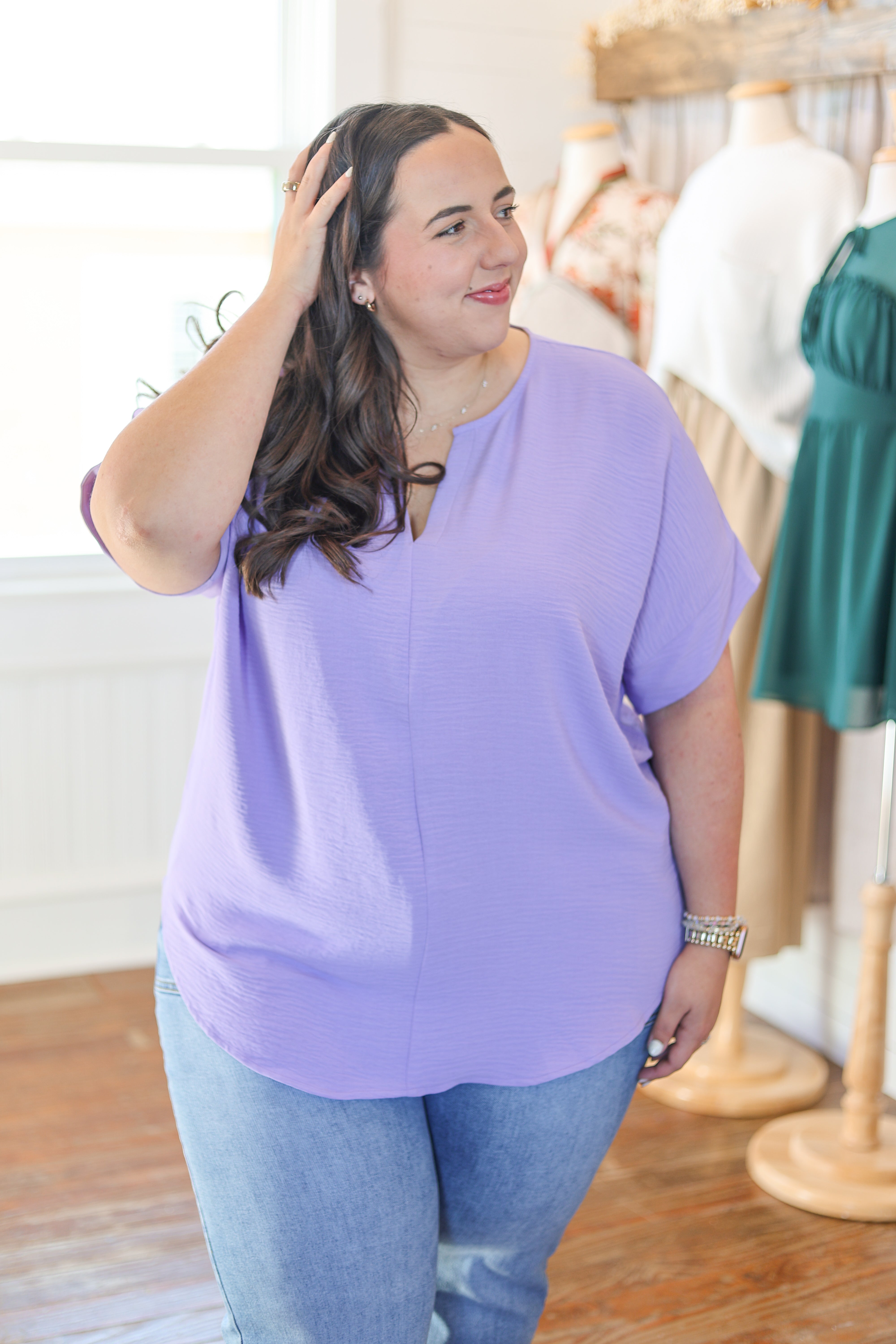 Hanna is pictured in a size large in all items. She wears a size 29 in denim!