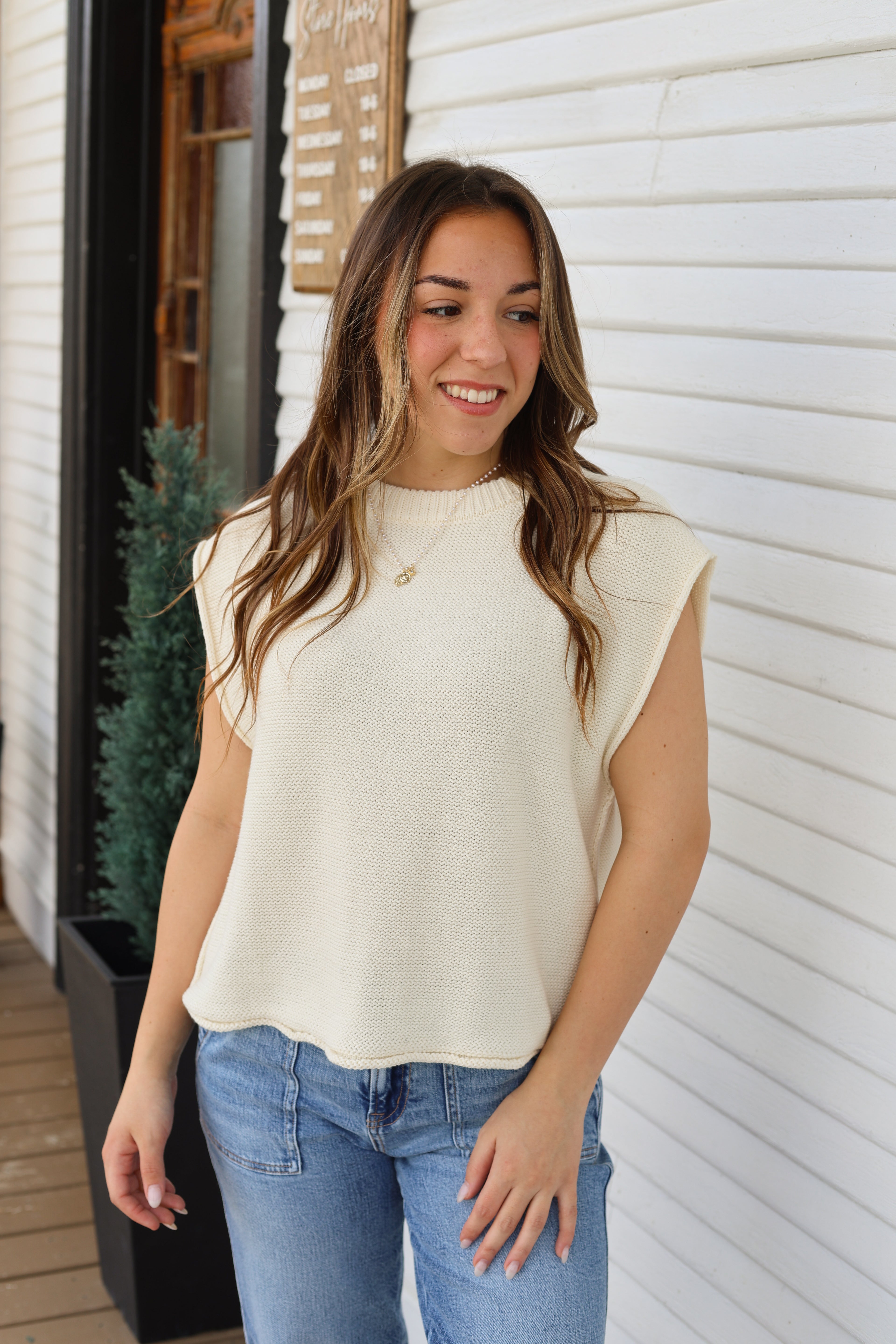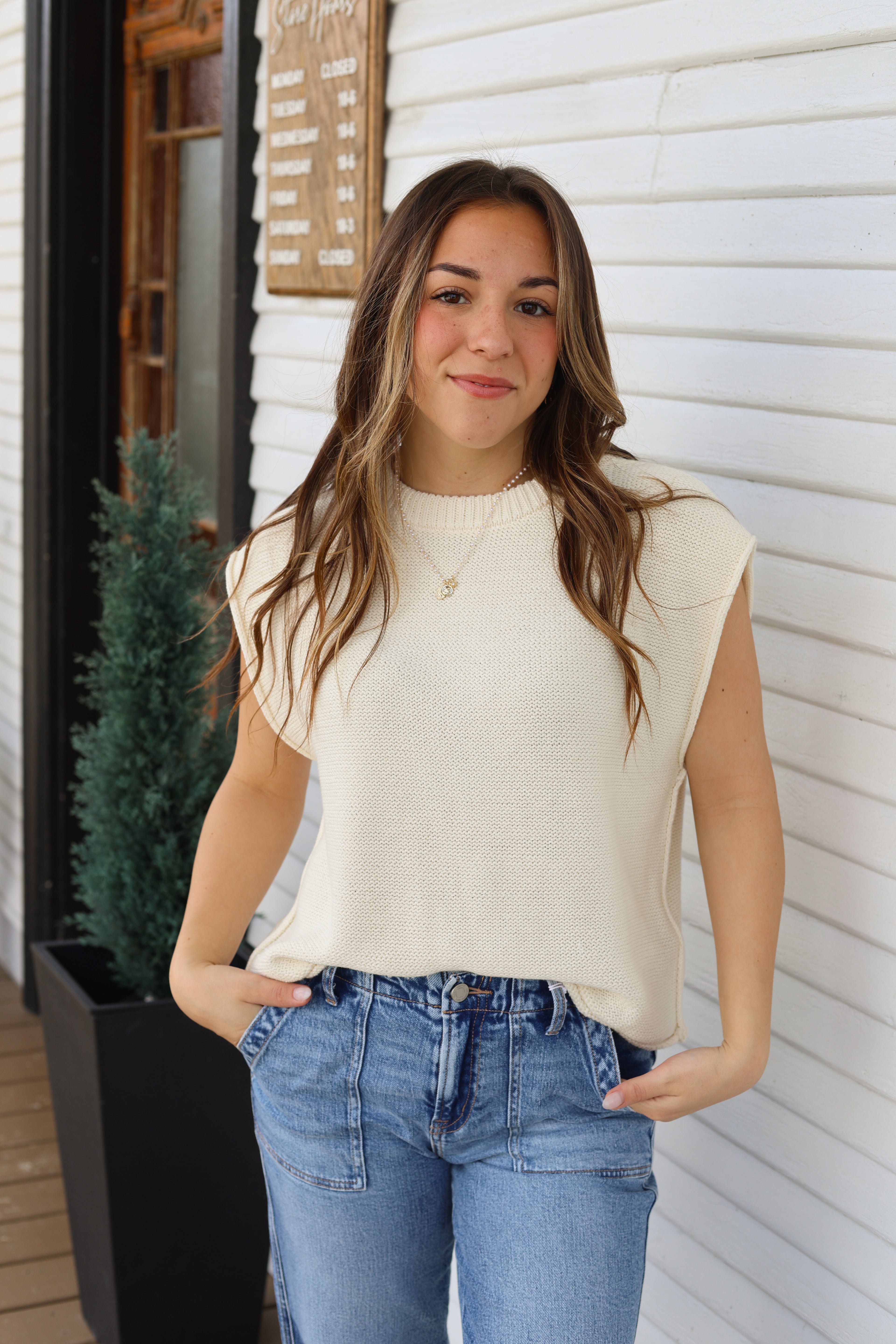 Hanna is pictured in a size large in all items. She wears a size 29 in denim!