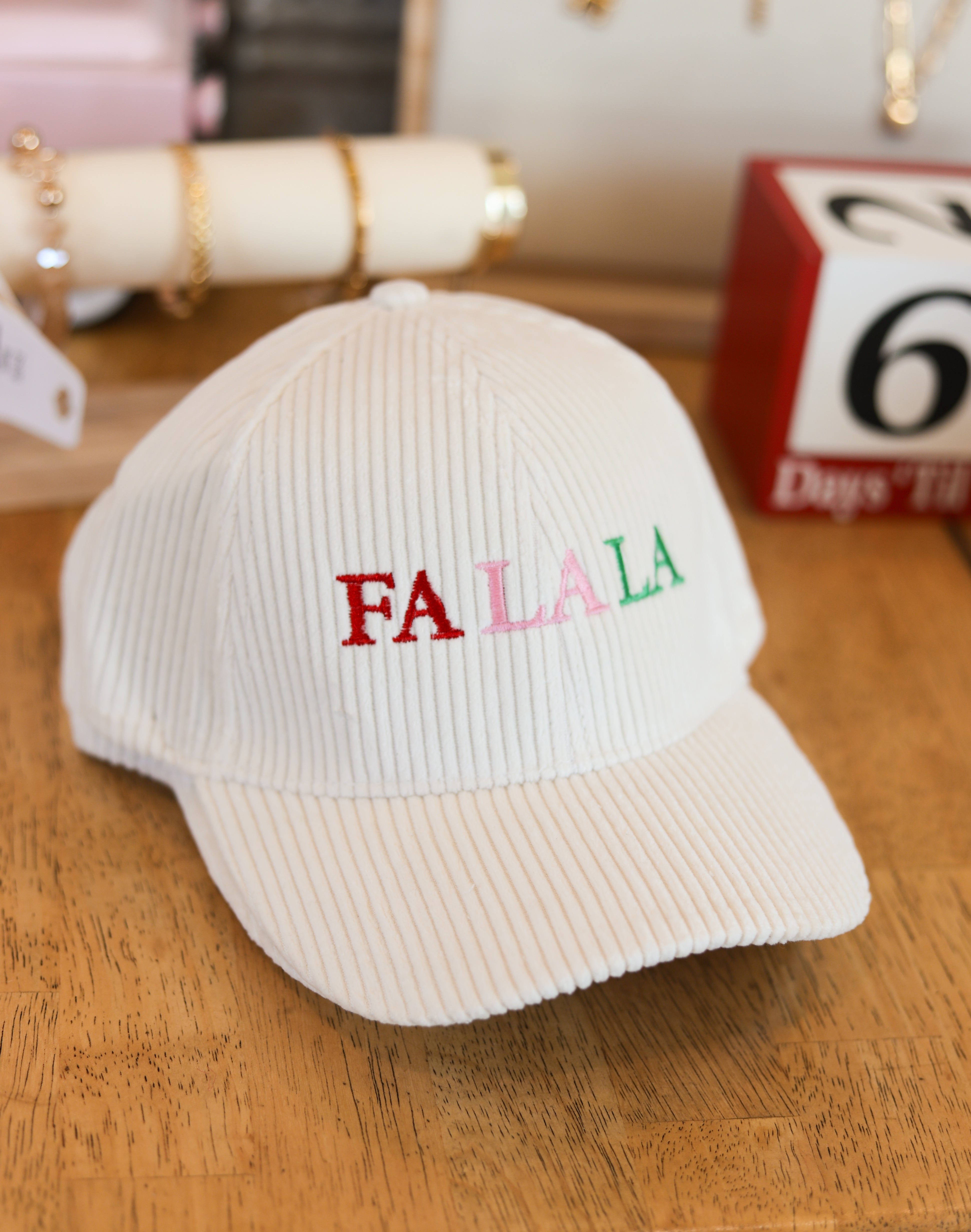 Add some festive cheer to your everyday look with this Fa La La embroidered baseball cap. Crafted from cozy corduroy, it’s both stylish and comfortable for all-day wear. Perfect for holiday outings or casual days, this cap adds a fun, seasonal touch to your outfit while keeping it relaxed and cool.