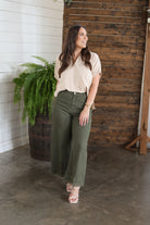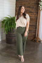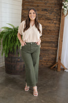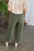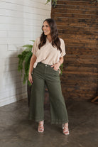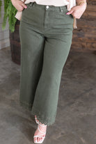 These high-waist, ankle-length pants in a versatile olive shade are your new year-round favorite. Featuring a delicate eyelet floral embroidered border hem, they add a charming touch to any outfit. Classic button fly-front zipper closure and timeless jean pockets bring casual ease and comfort, making them perfect for everyday wear with a fun, stylish twist.
