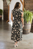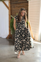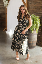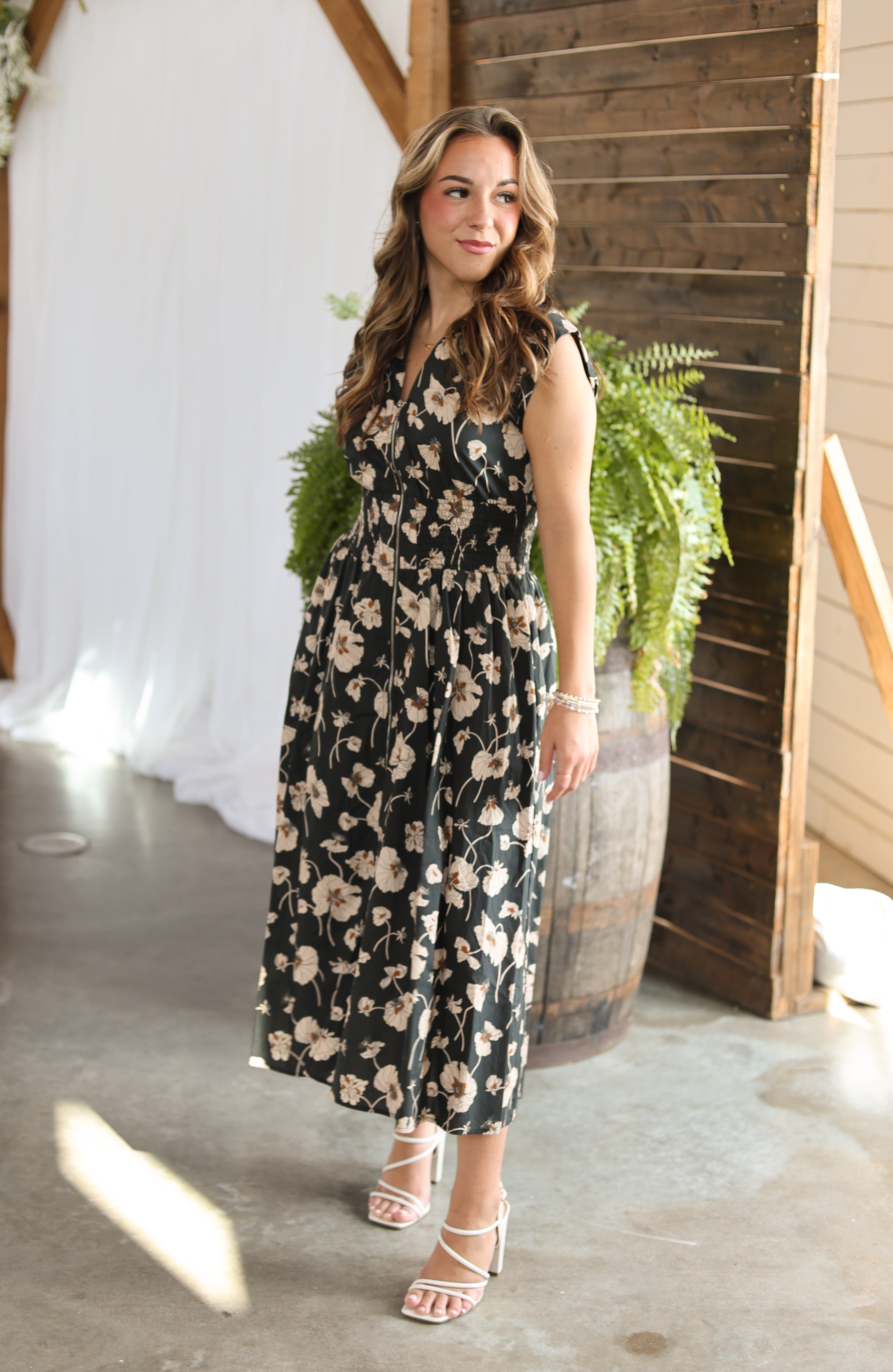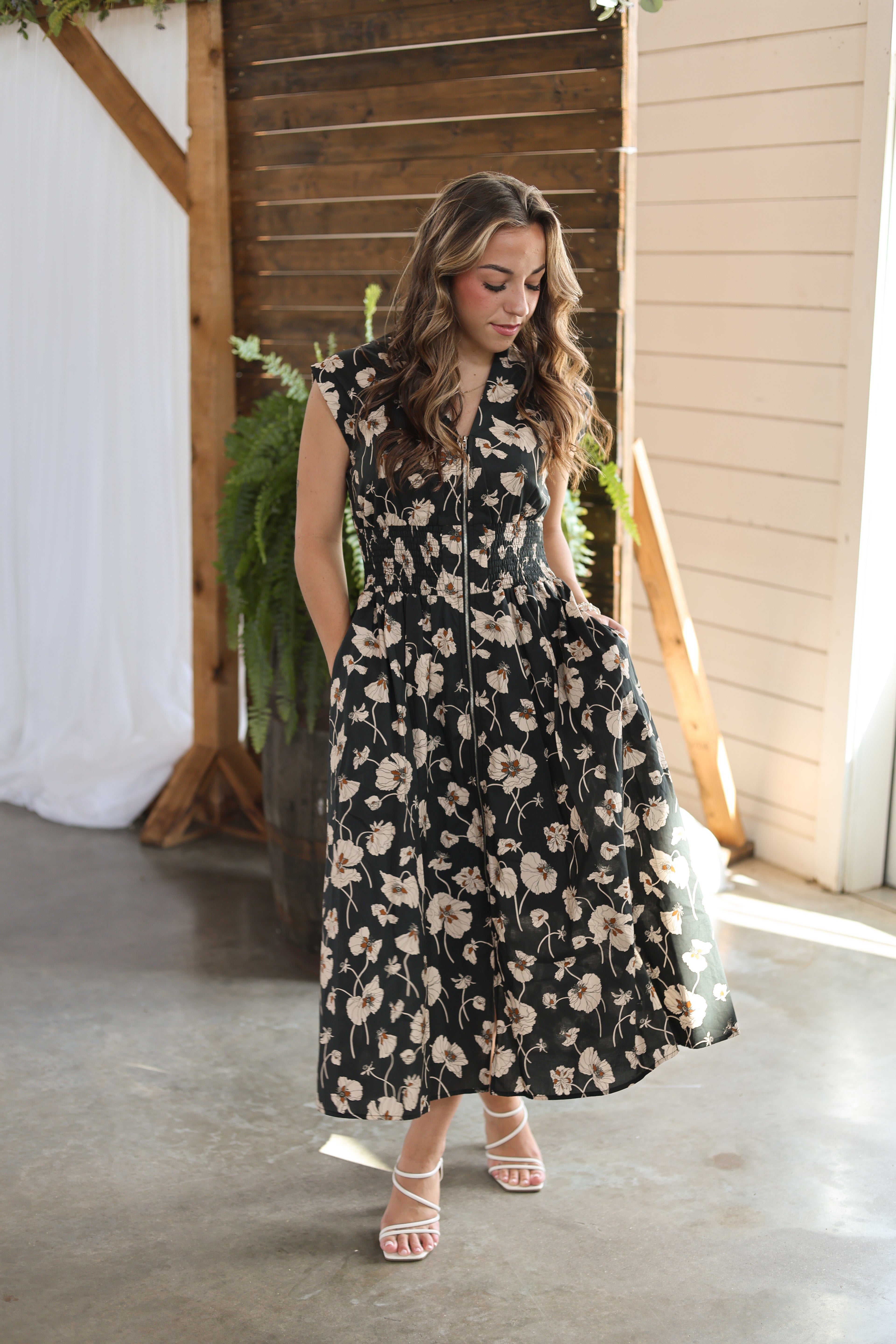 The Mena Midi Dress is a charming fall essential featuring a sleeveless design and a flattering smocked waistband for comfortable wear. Its black fabric is beautifully adorned with beige and tan floral patterns, adding a warm, seasonal touch. The front zip closure offers easy dressing, making it a versatile piece perfect for casual outings or layered looks. Embrace effortless style this season with the Mena Midi Dress! Mini length lining.