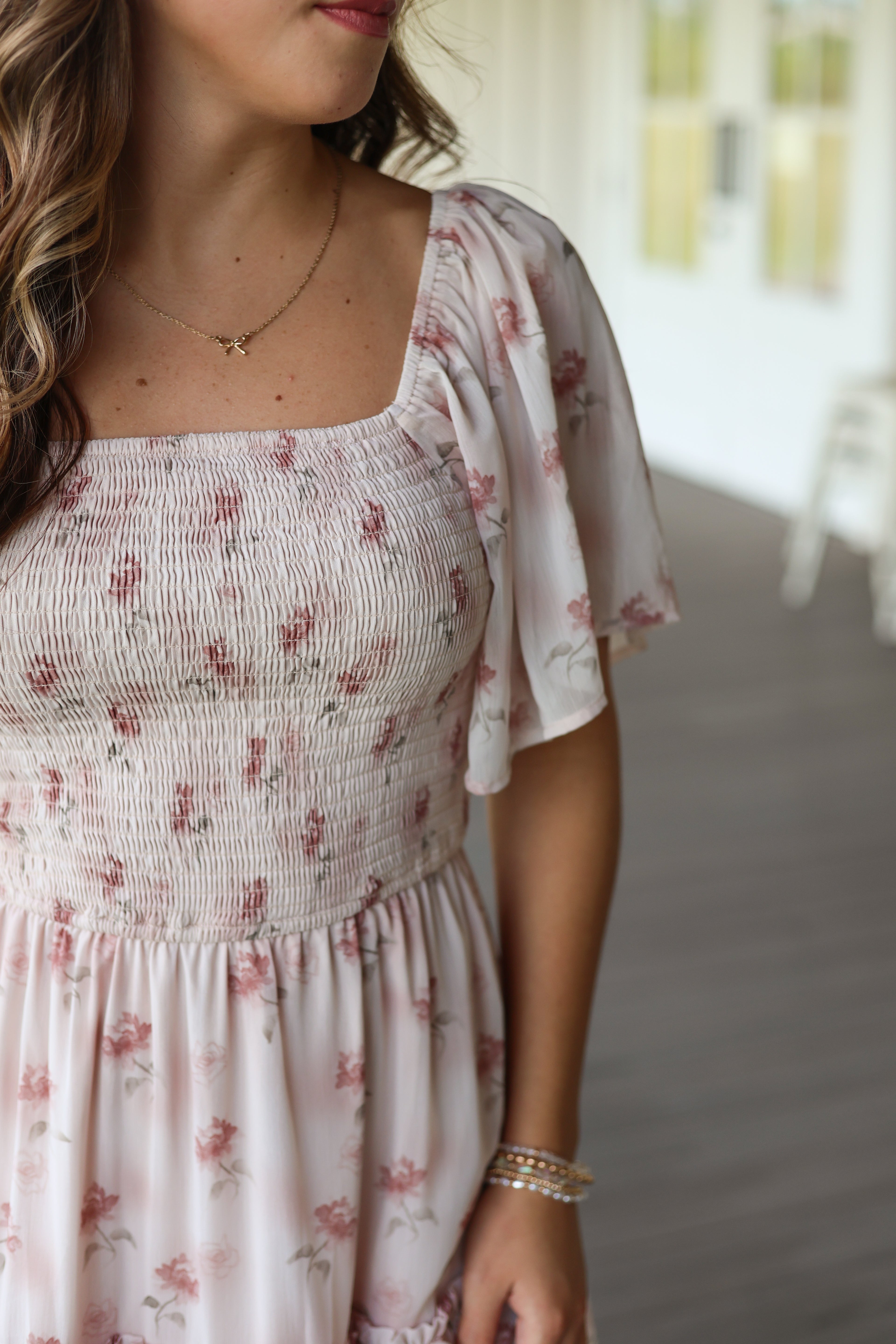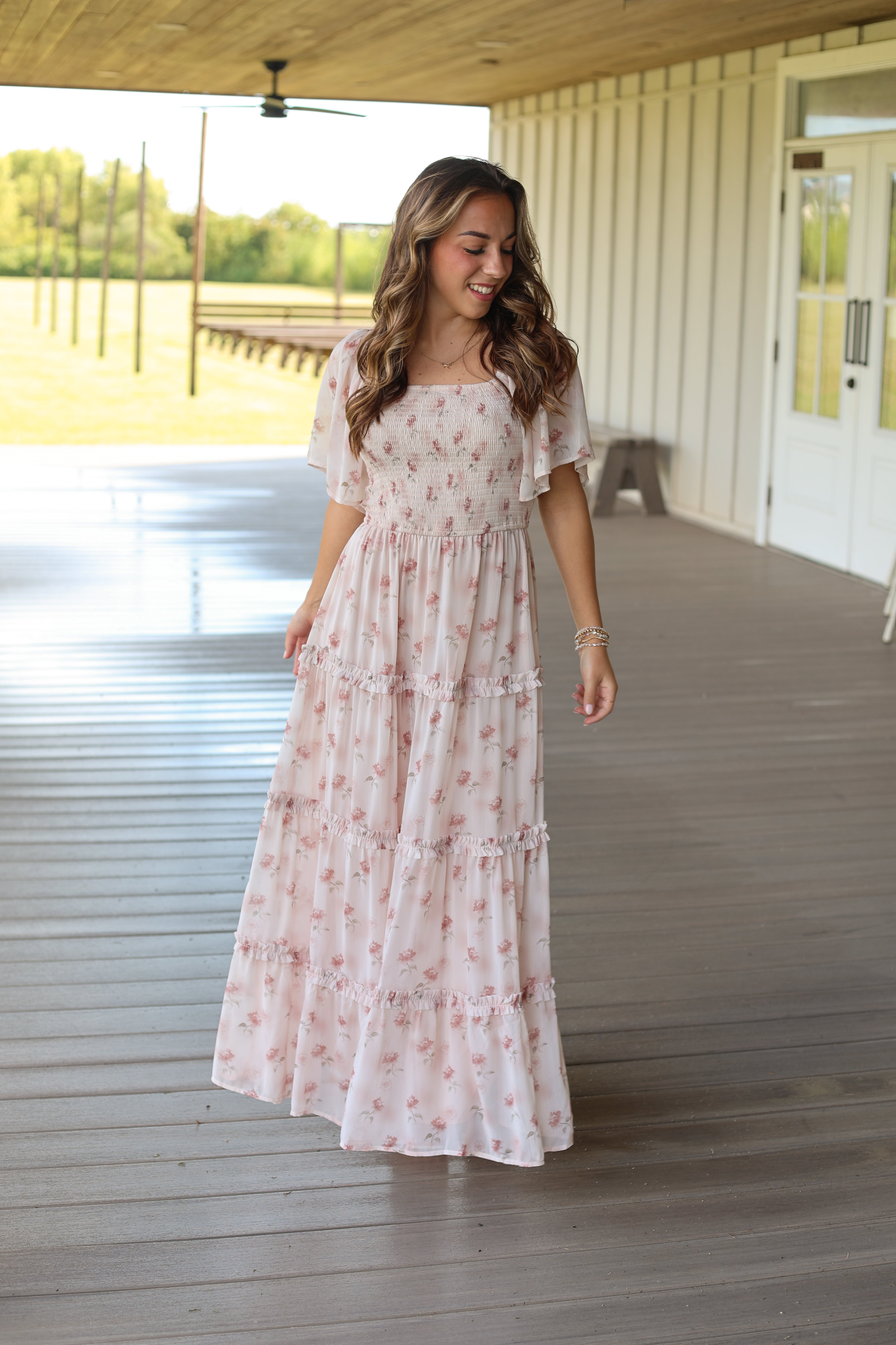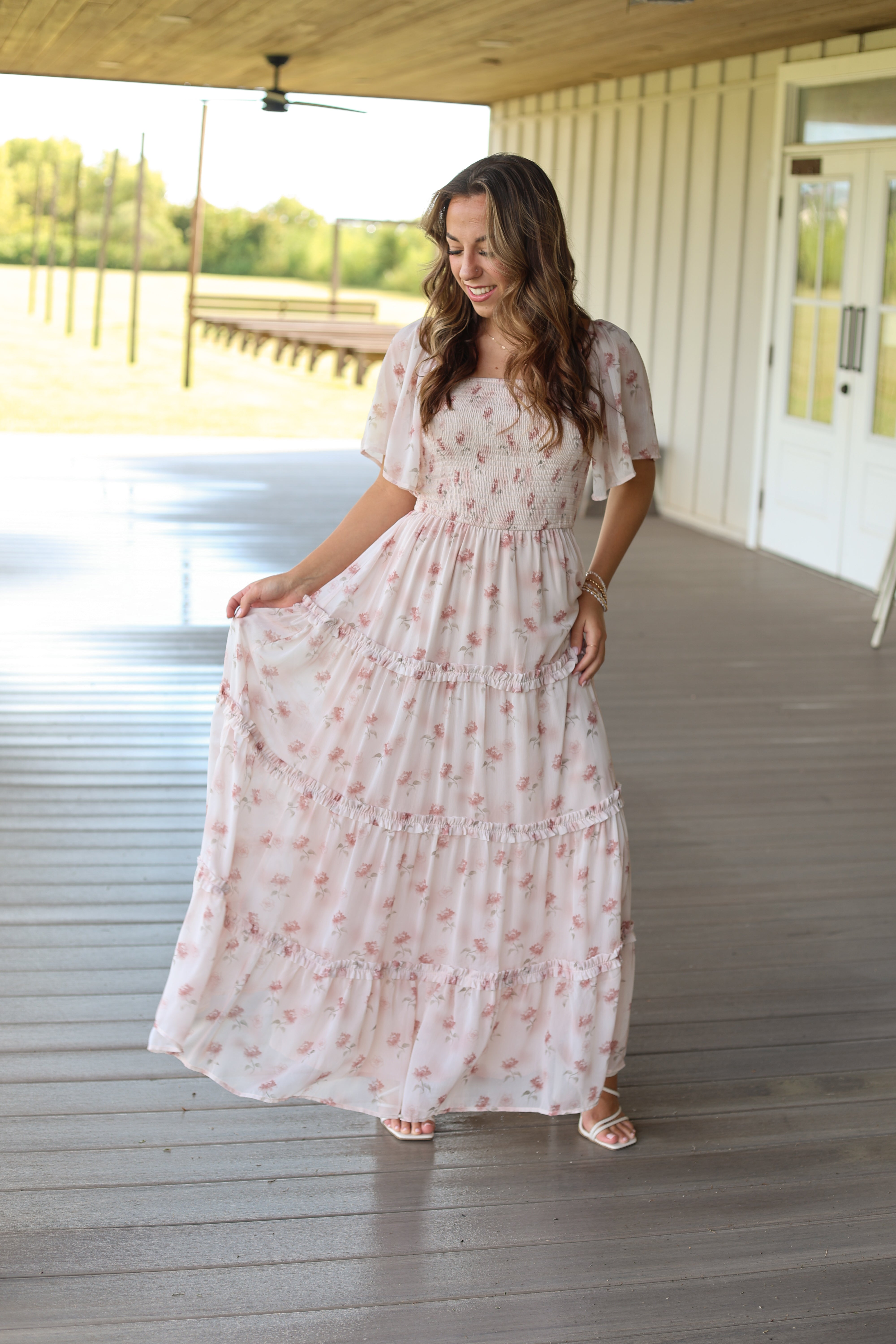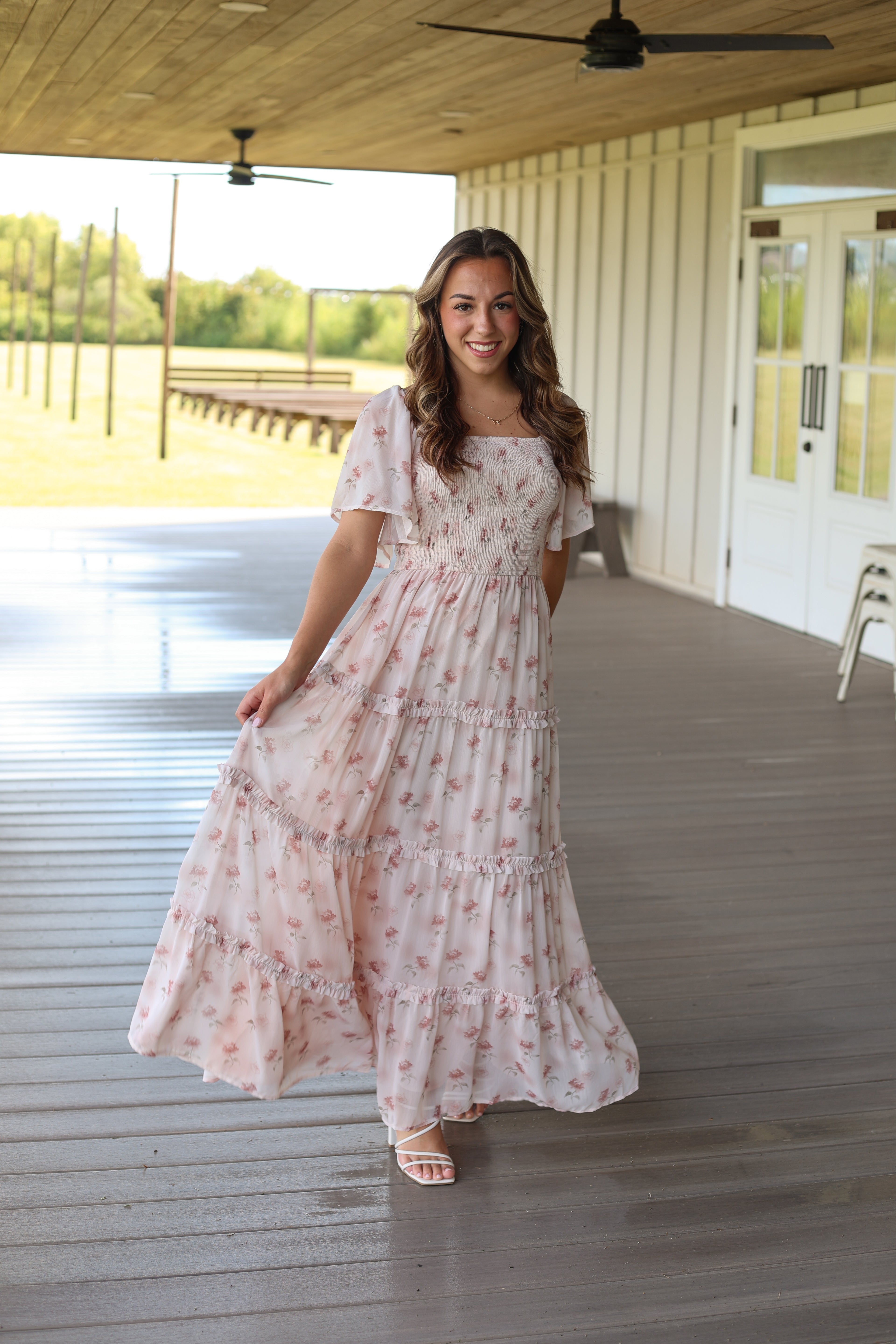 Embrace effortless romance in the Rosewood Maxi Dress, featuring a dreamy floral print and a smocked bodice that gently hugs your silhouette. The flowing maxi length and fluttering sleeves create a soft, whimsical movement perfect for sunny afternoons or evening strolls. This dress blends comfort with charm for a carefree, casual look that's sure to turn heads.