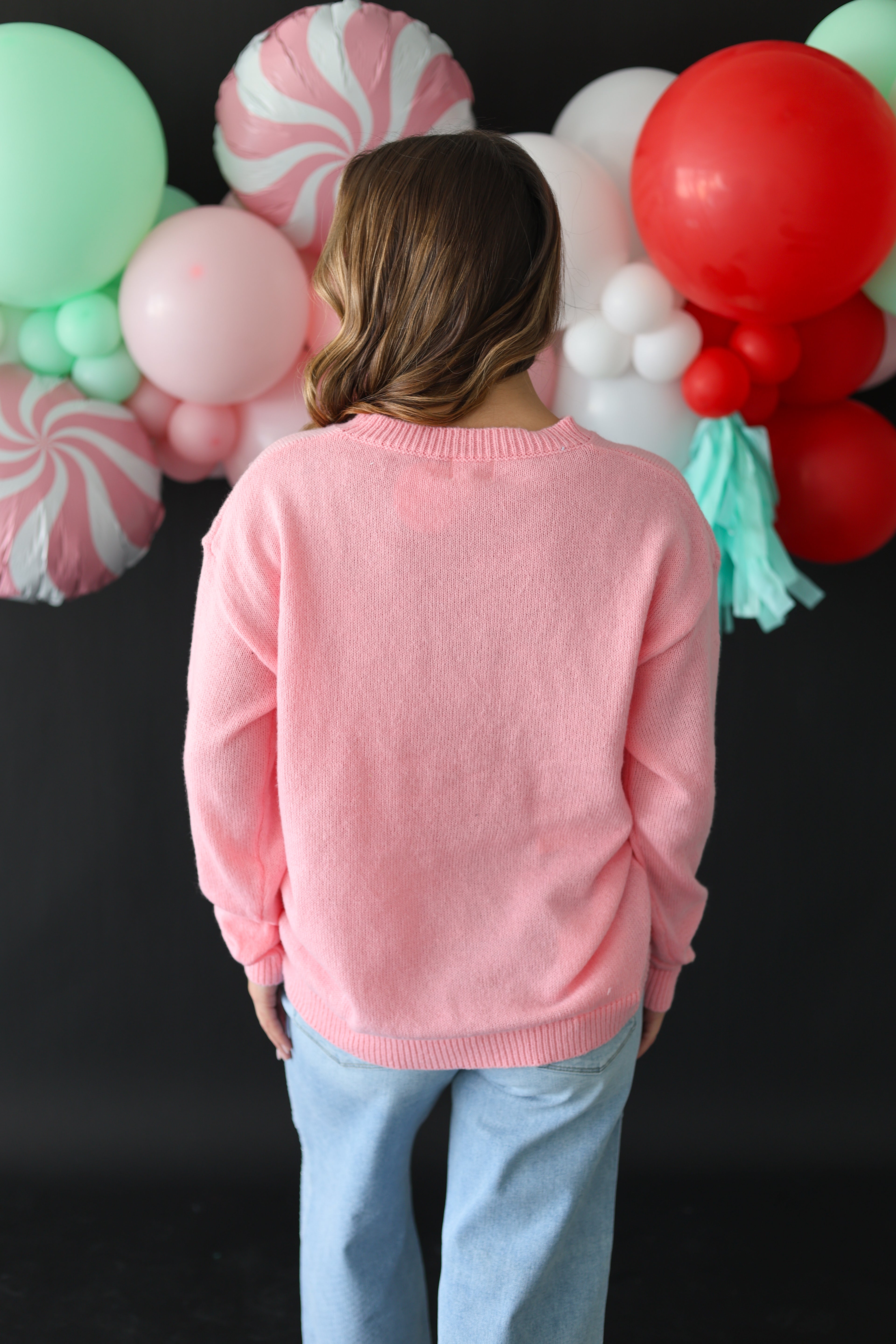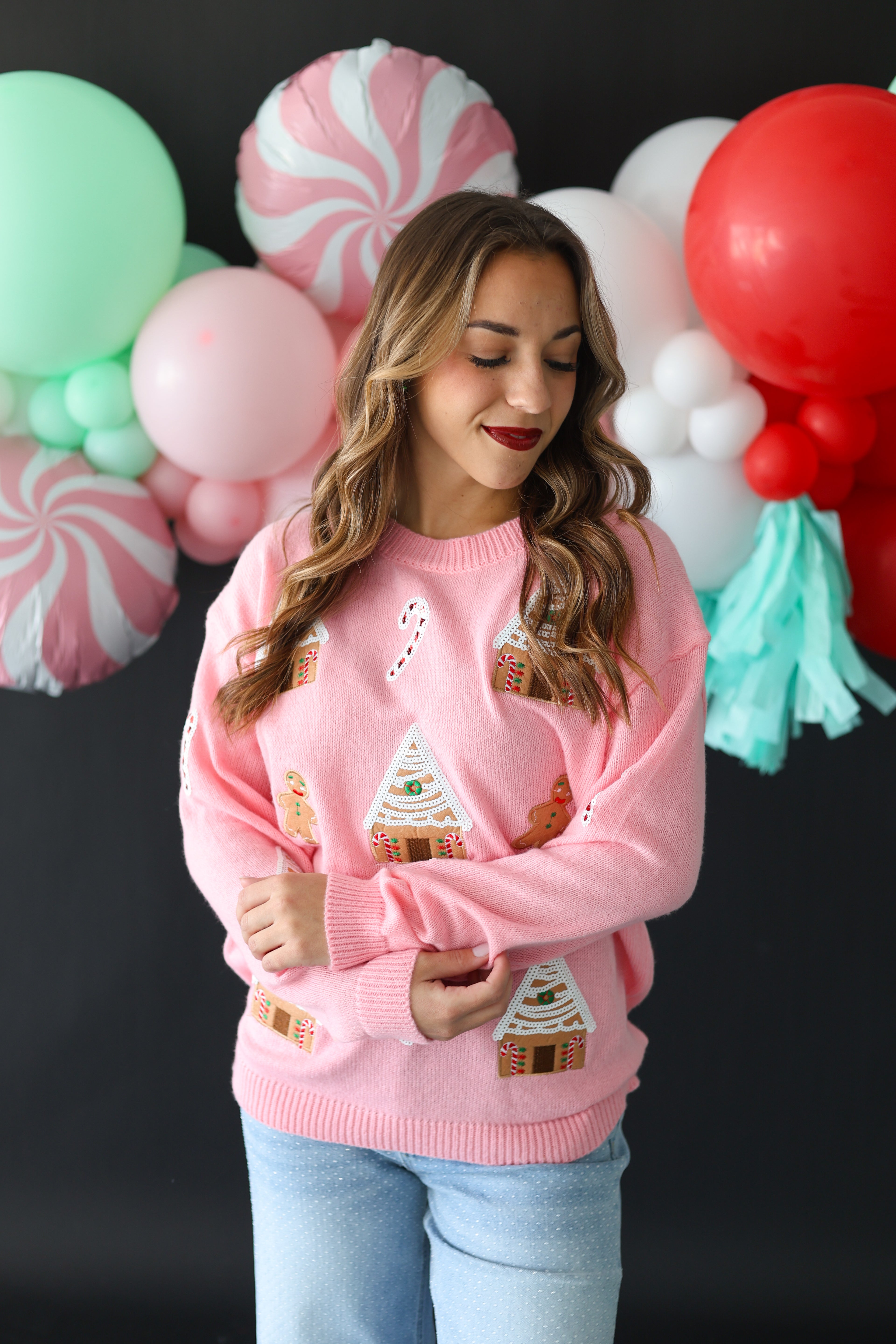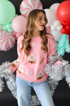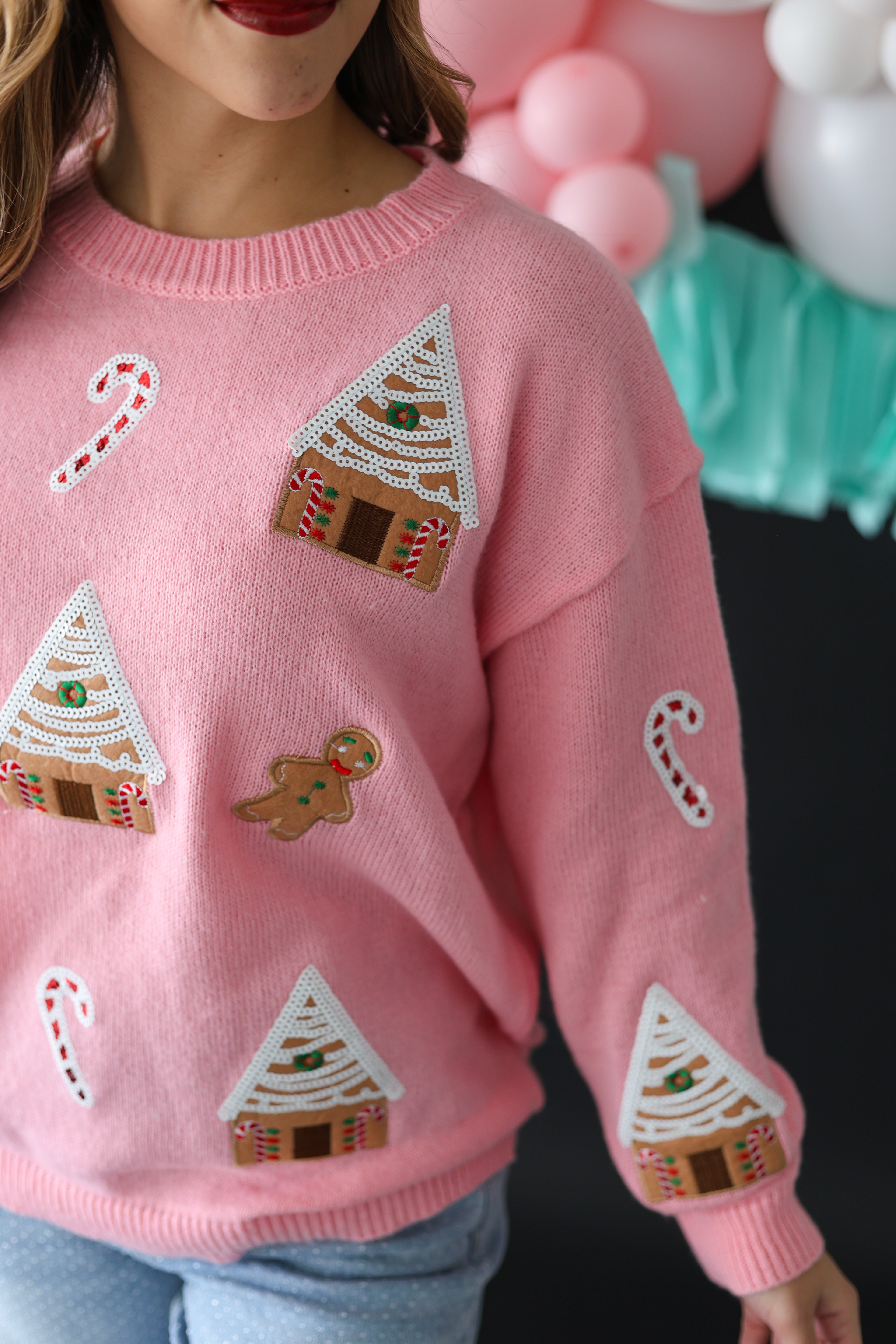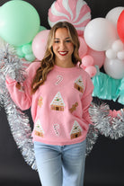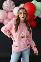 Celebrate the season in style with this fun festive pink sweater featuring adorable gingerbread patches and sparkling sequin details. Perfect for holiday parties or cozy winter days, this holiday sequin sweater adds a playful and cheerful touch to your wardrobe that everyone will love. Get ready to shine bright and spread holiday cheer wherever you go!