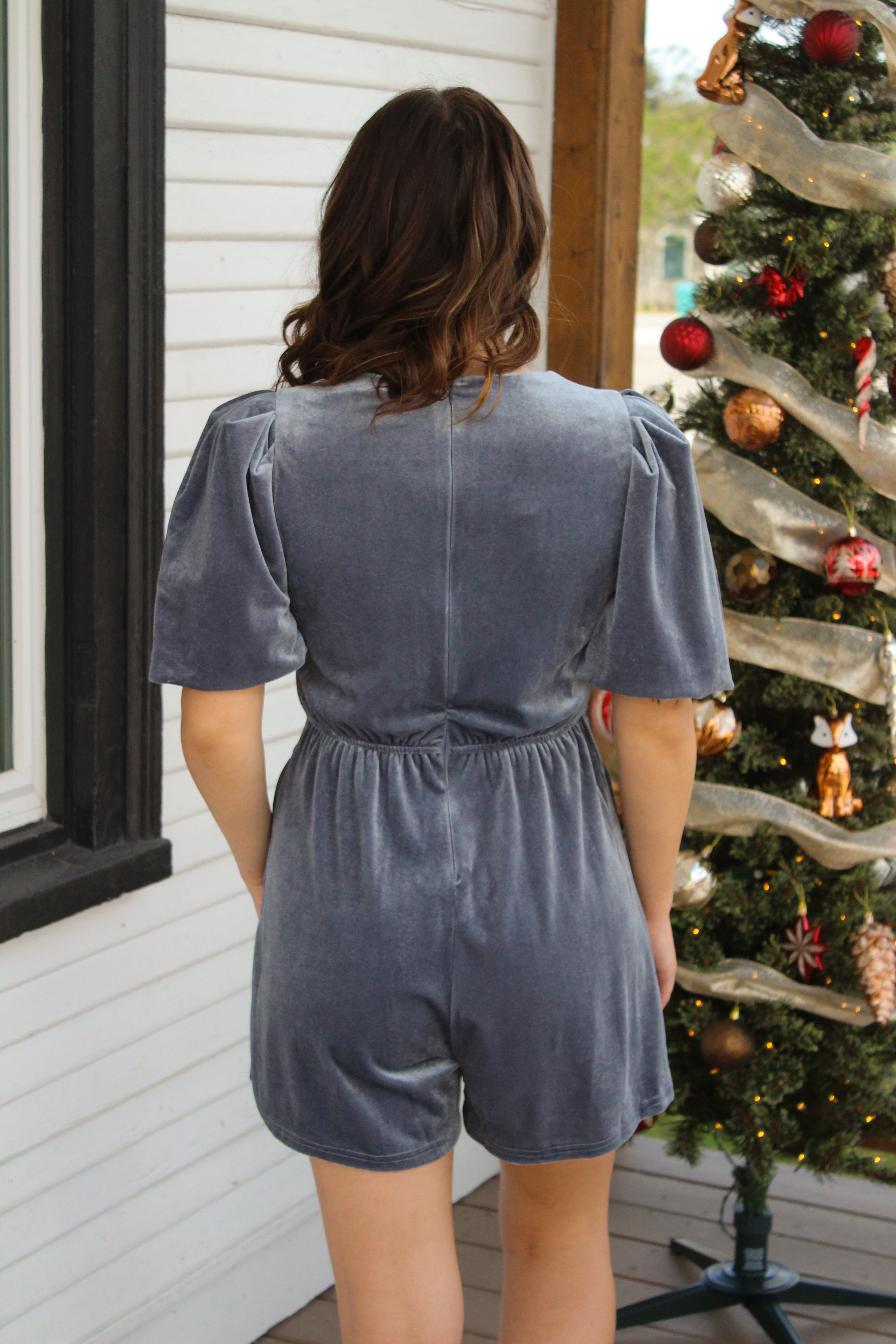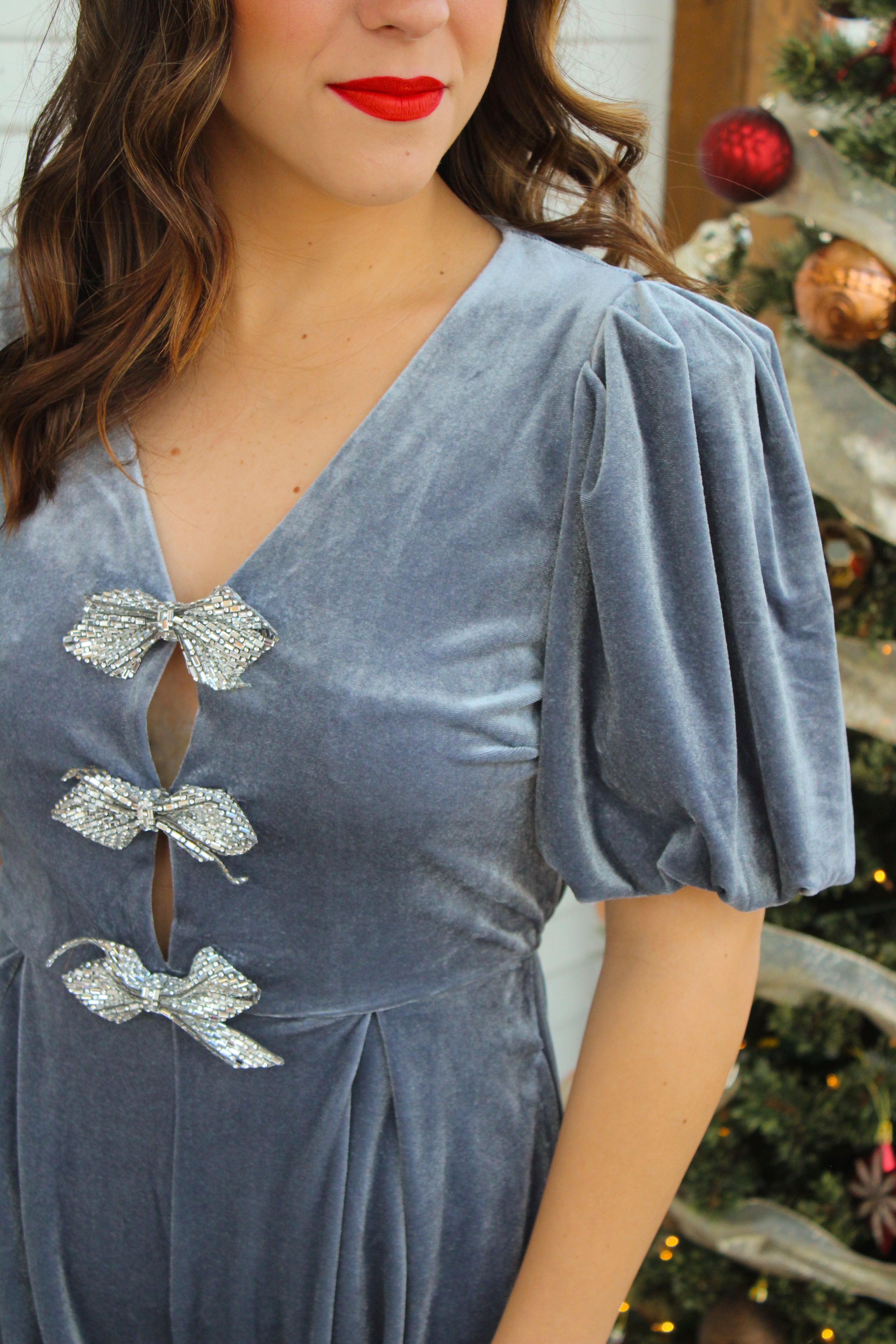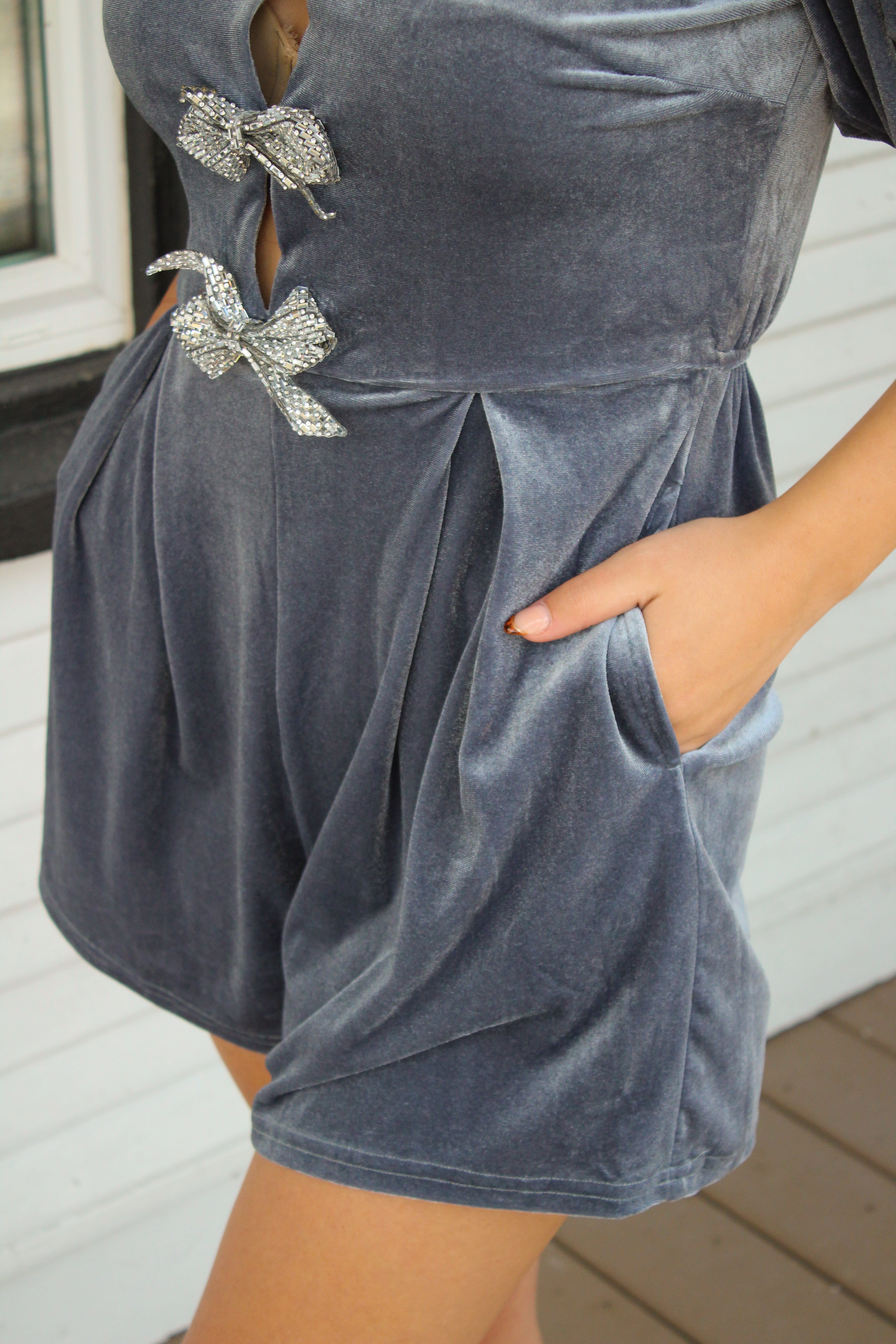 The Jewel Romper: a playful, dusty blue velvet romper with short puff sleeves, rhinestone bow trim, and pleated shorts. Lined for comfort and functionality, this romper also features pockets for convenience. Be the belle of the ball with this unique and stylish piece.