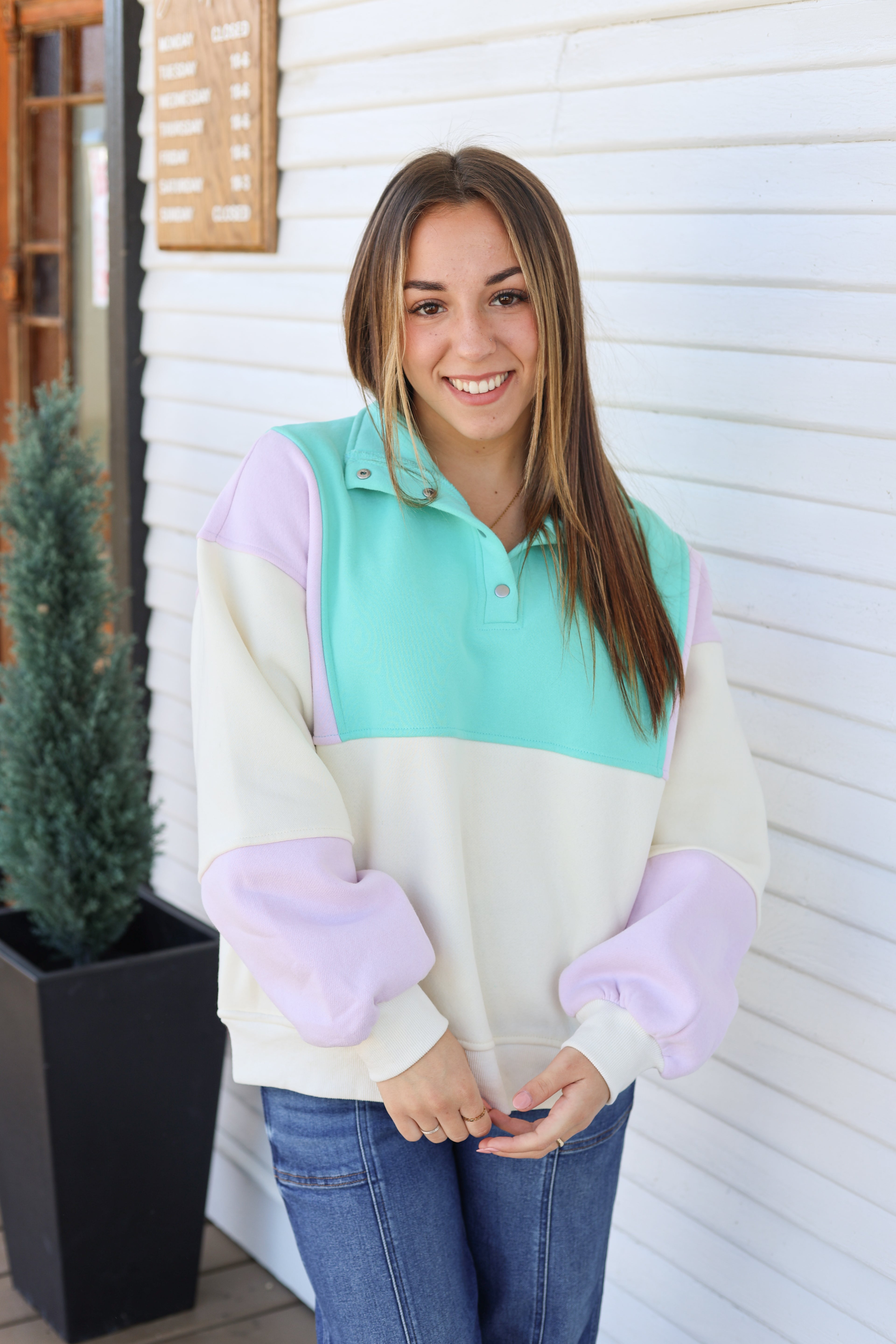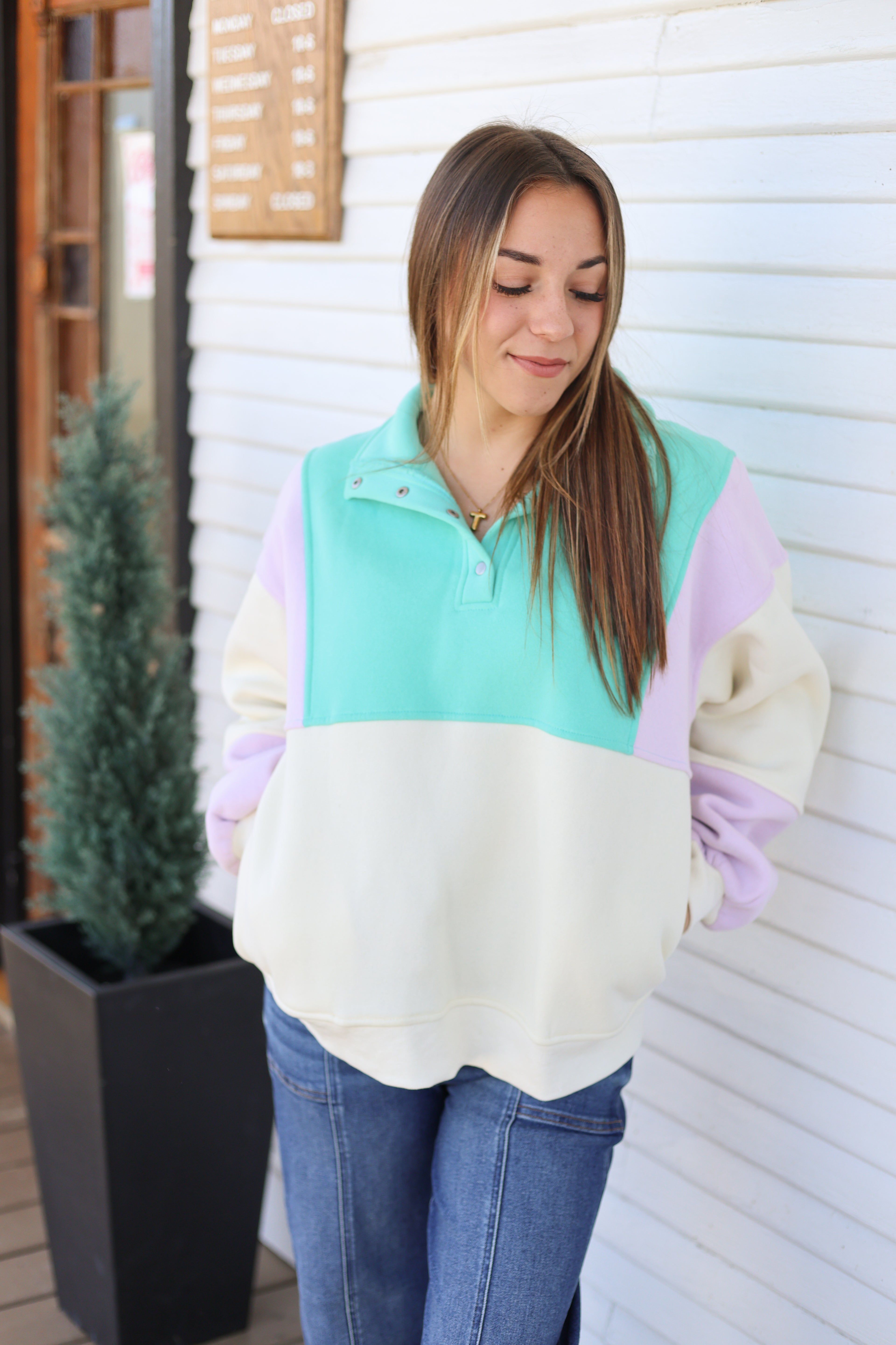 The Emily Pullover is your new go-to for effortless style! This casual pullover features a fun color block design that instantly elevates any outfit. Snap button closures make it super easy to slip on and off, while the classic collar adds a polished touch. Practical front pockets keep your essentials within reach. Designed for comfort, it pairs perfectly with jeans or leggings for a relaxed, put-together look that works from morning coffee runs to weekend hangouts.