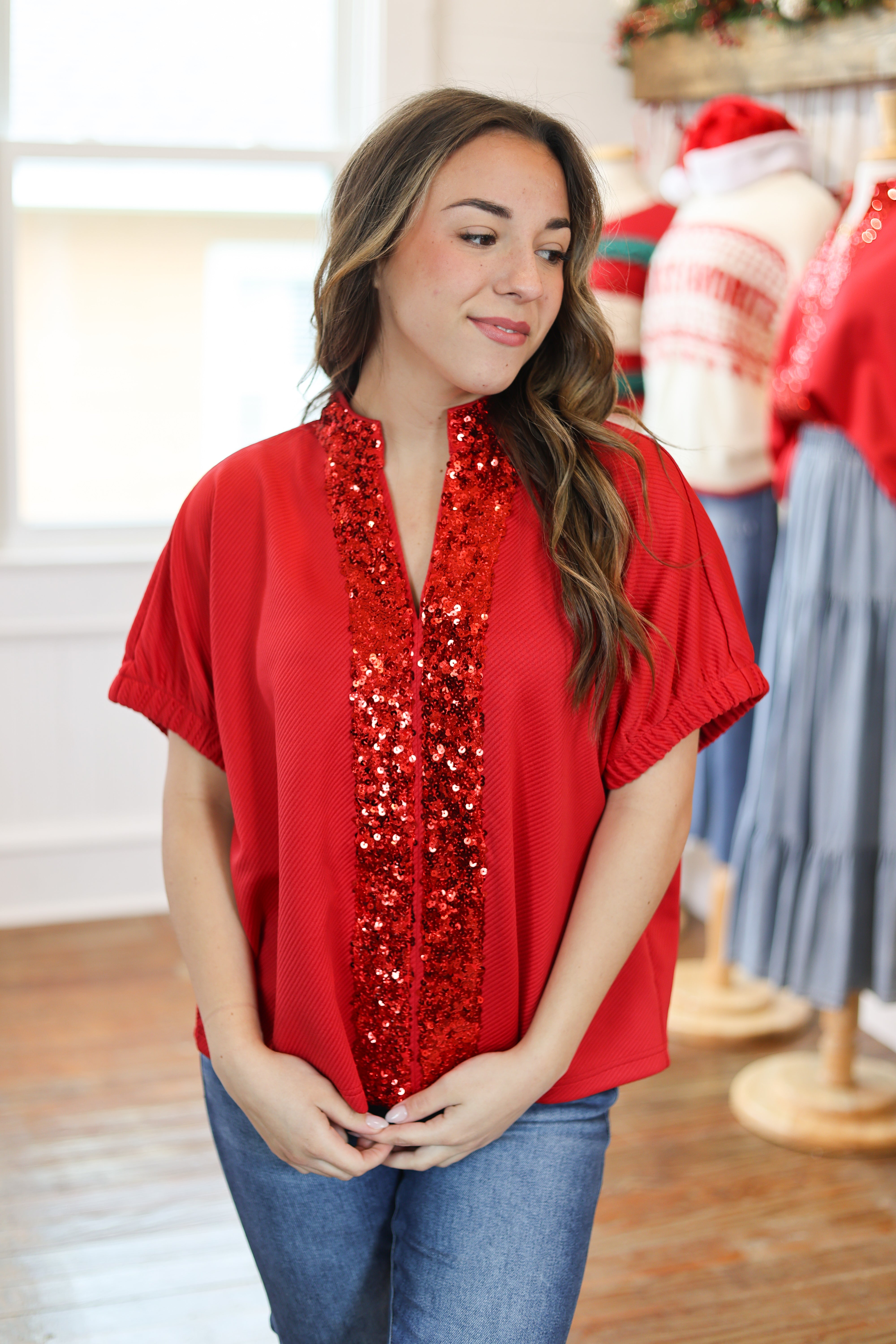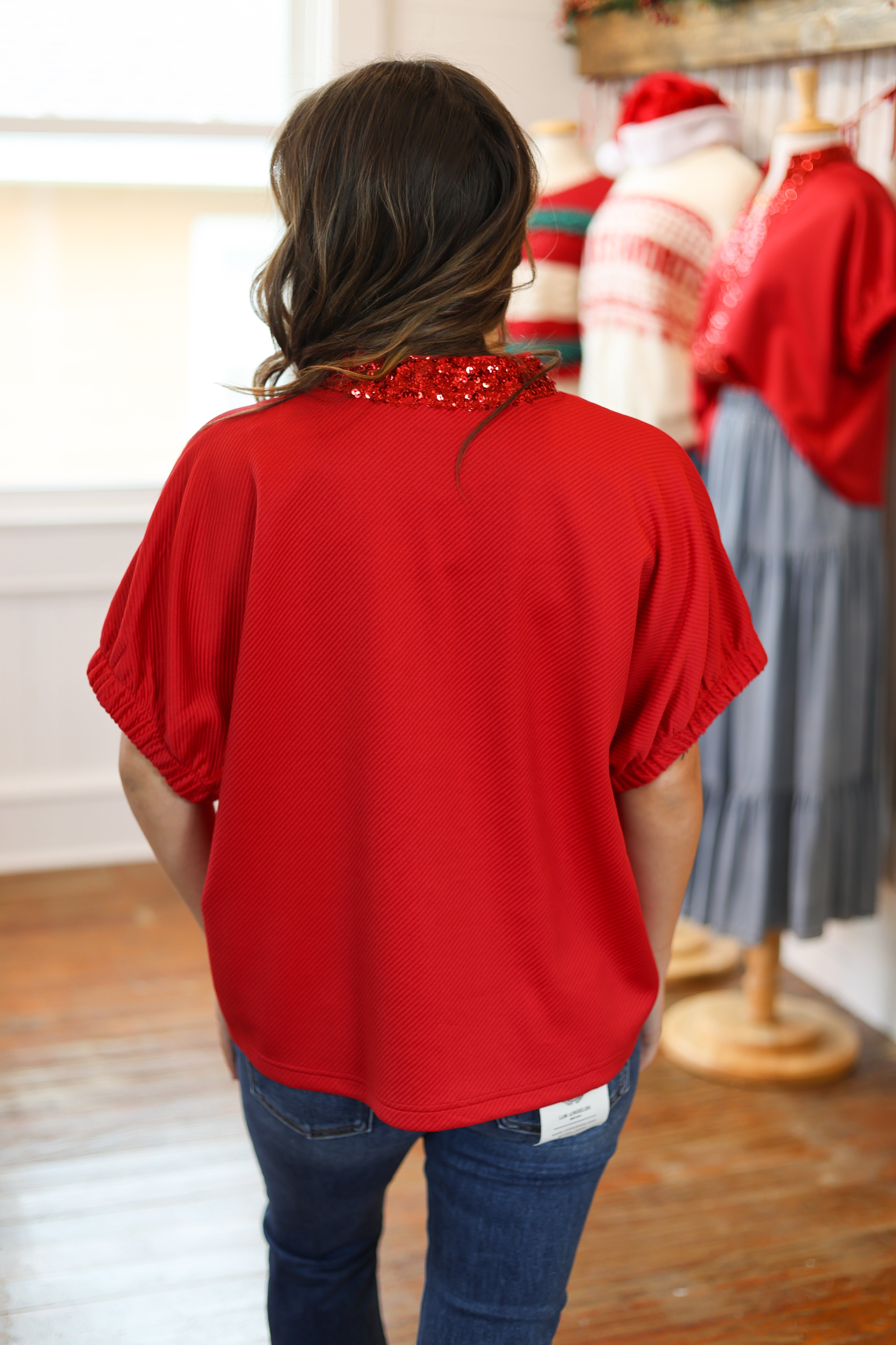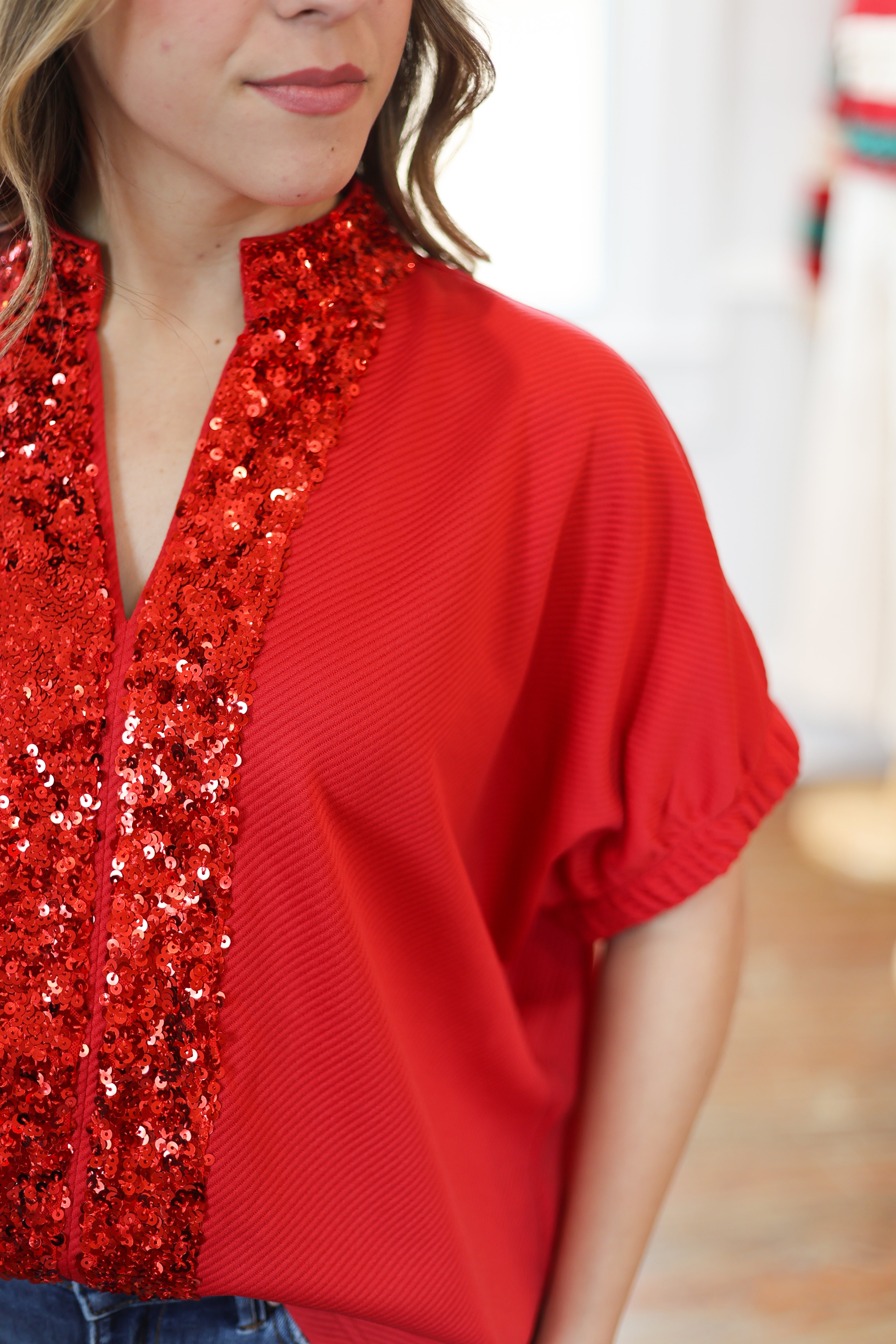 Get ready to sparkle this holiday season! This stunning red Christmas top features a chic split neckline and eye-catching sequined trim that catches the light beautifully. The short sleeves keep it comfortable and versatile, making it perfect for festive gatherings, holiday parties, or casual celebrations. Whether you're dressing up for a special occasion or adding some shimmer to your everyday look, this top brings the perfect amount of glam and holiday spirit. A must-have piece for anyone looking to shine bright!