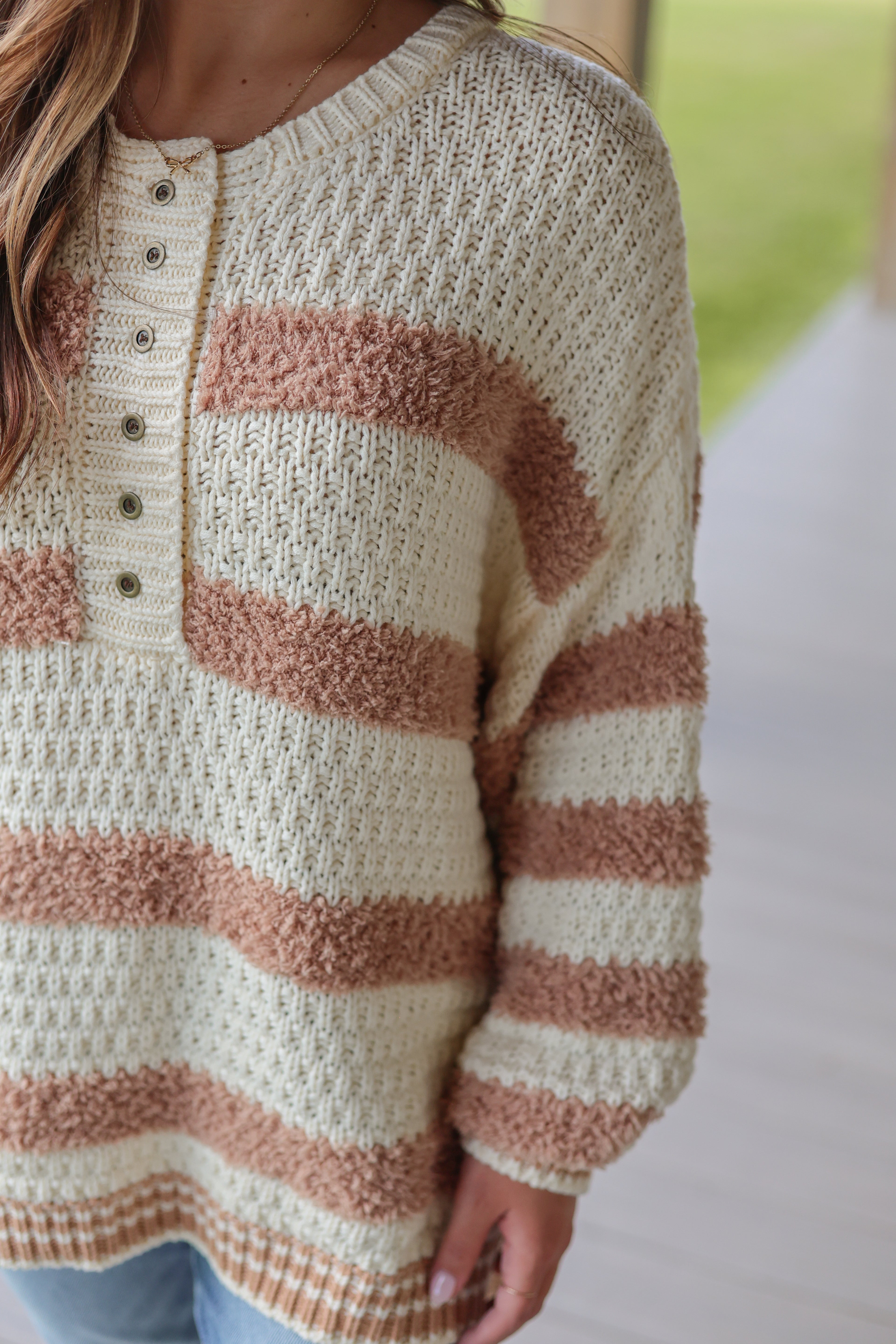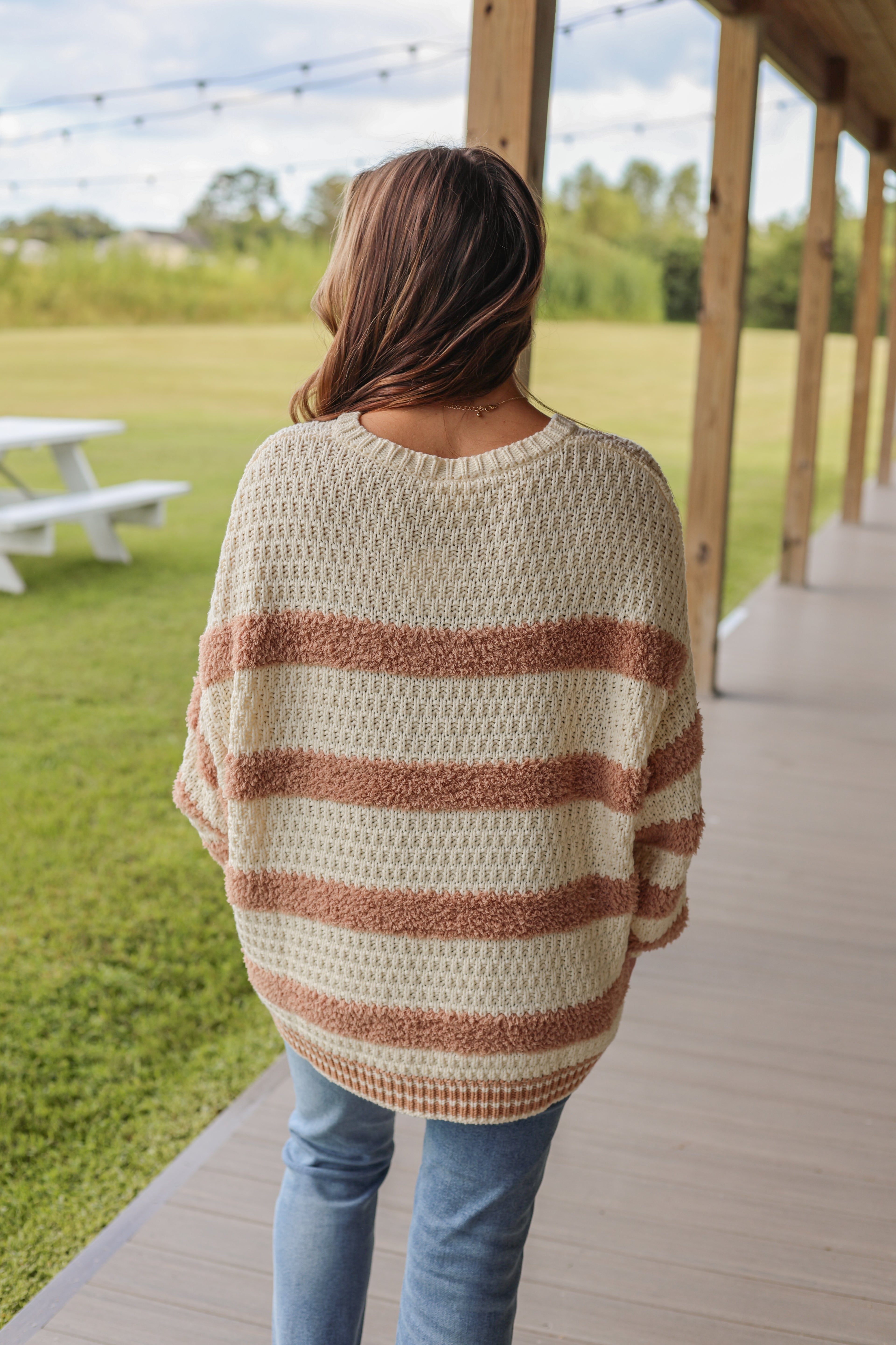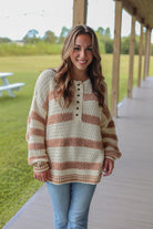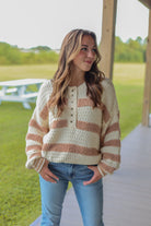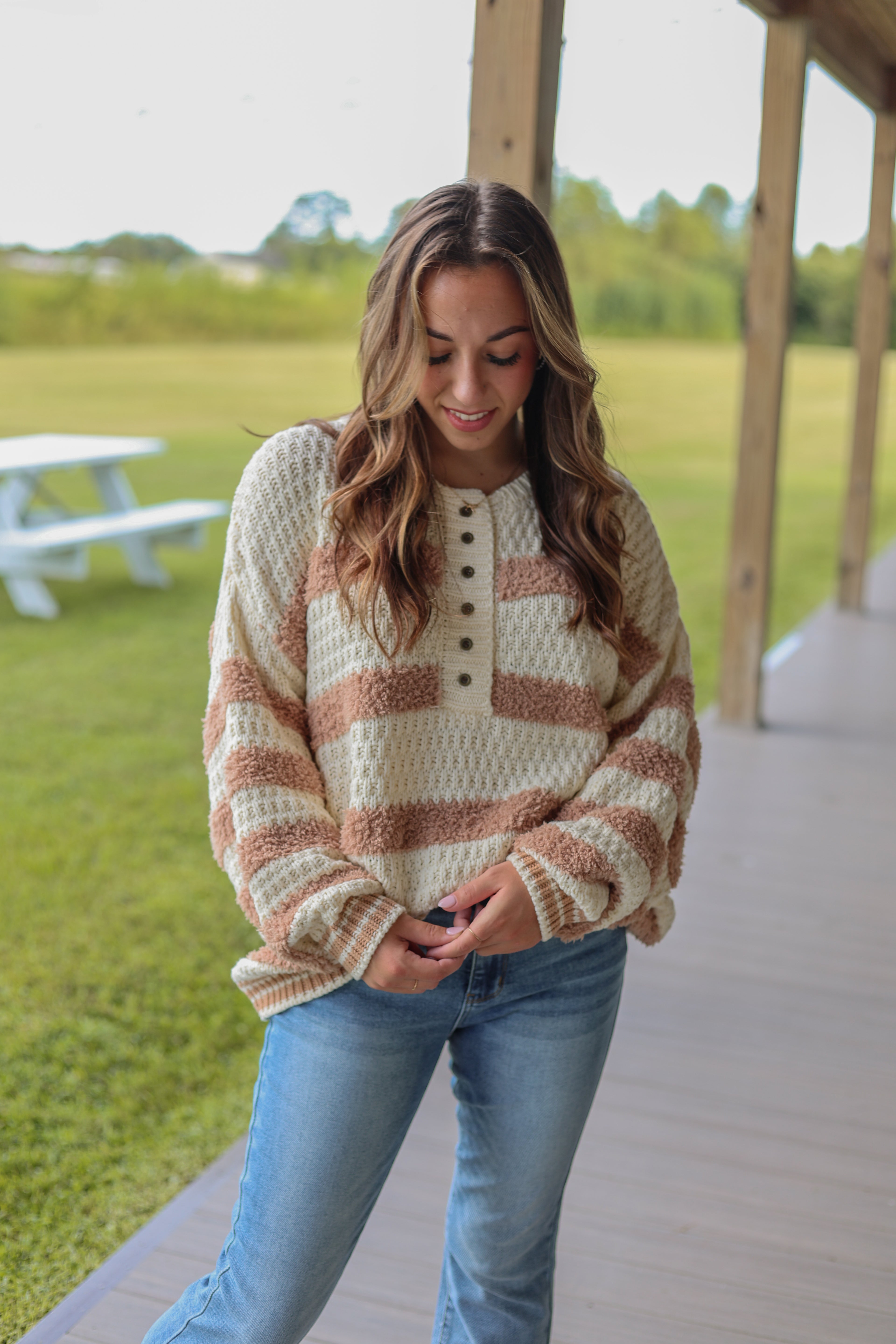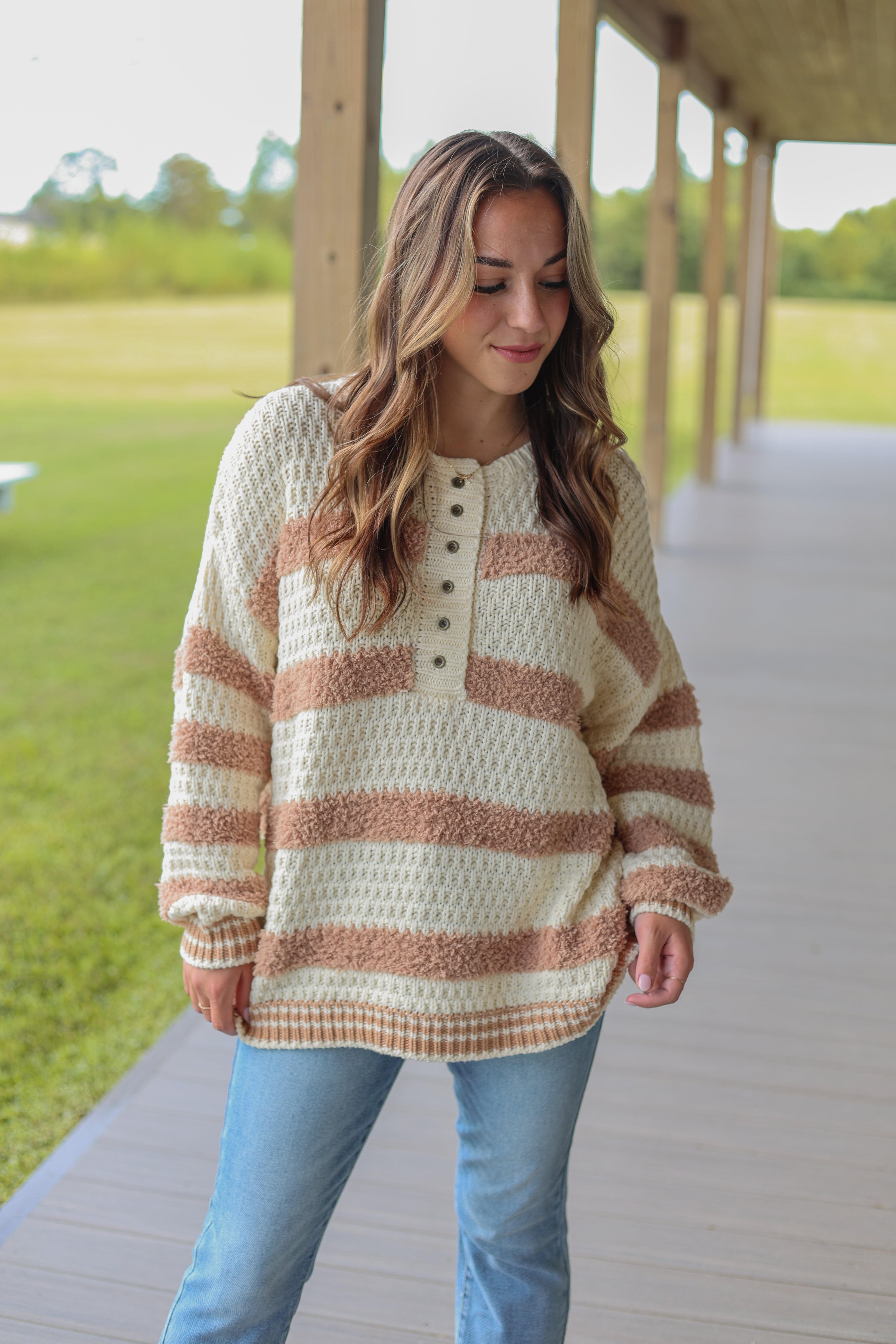 Stay effortlessly stylish and cozy this fall with the Lana Striped Sweater. Featuring a classic crew neck and charming placket detail, this long sleeve sweater offers a roomy, comfy fit perfect for layering. Its timeless stripe pattern makes it a go-to essential for crisp autumn days, keeping you warm without sacrificing comfort or style.
