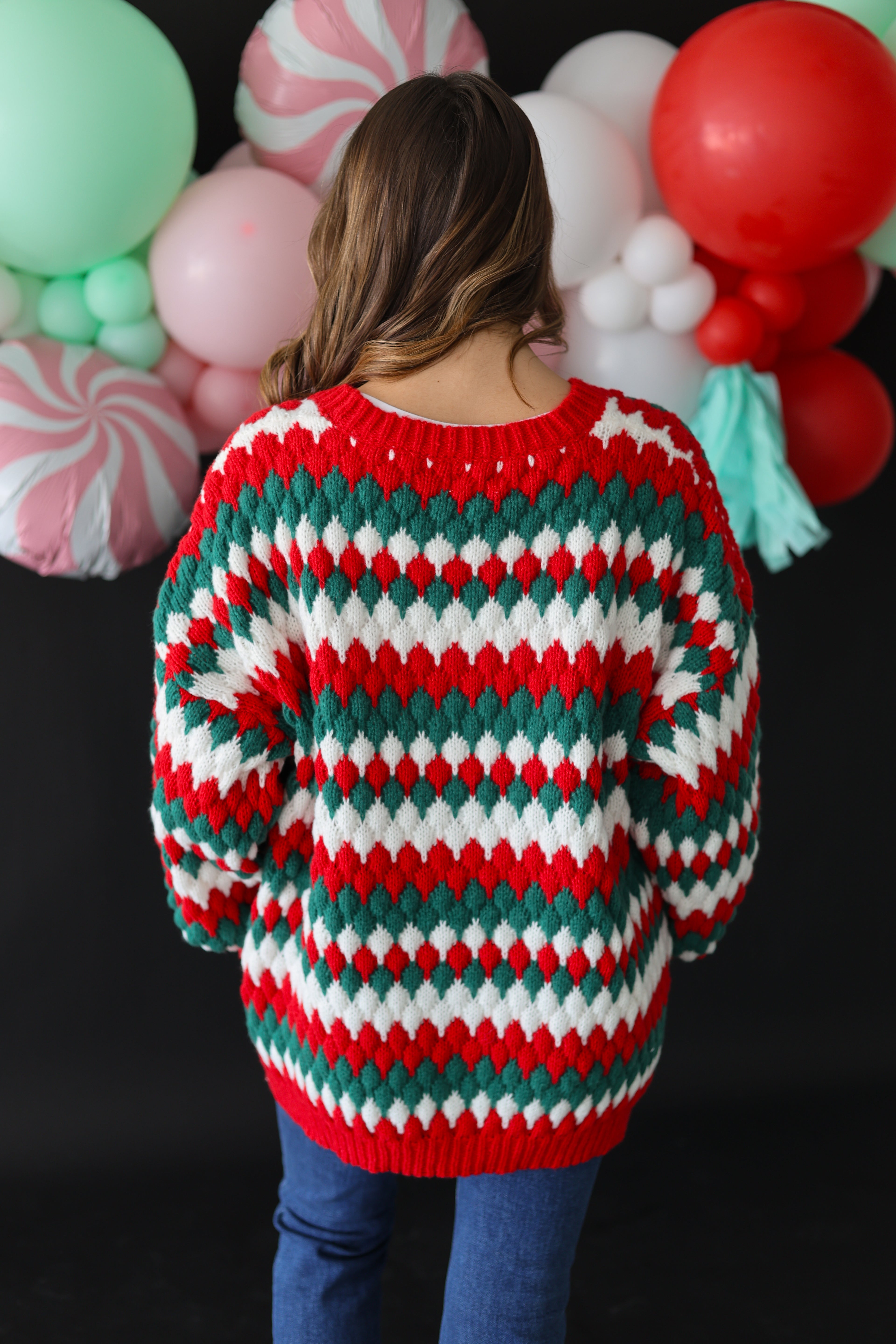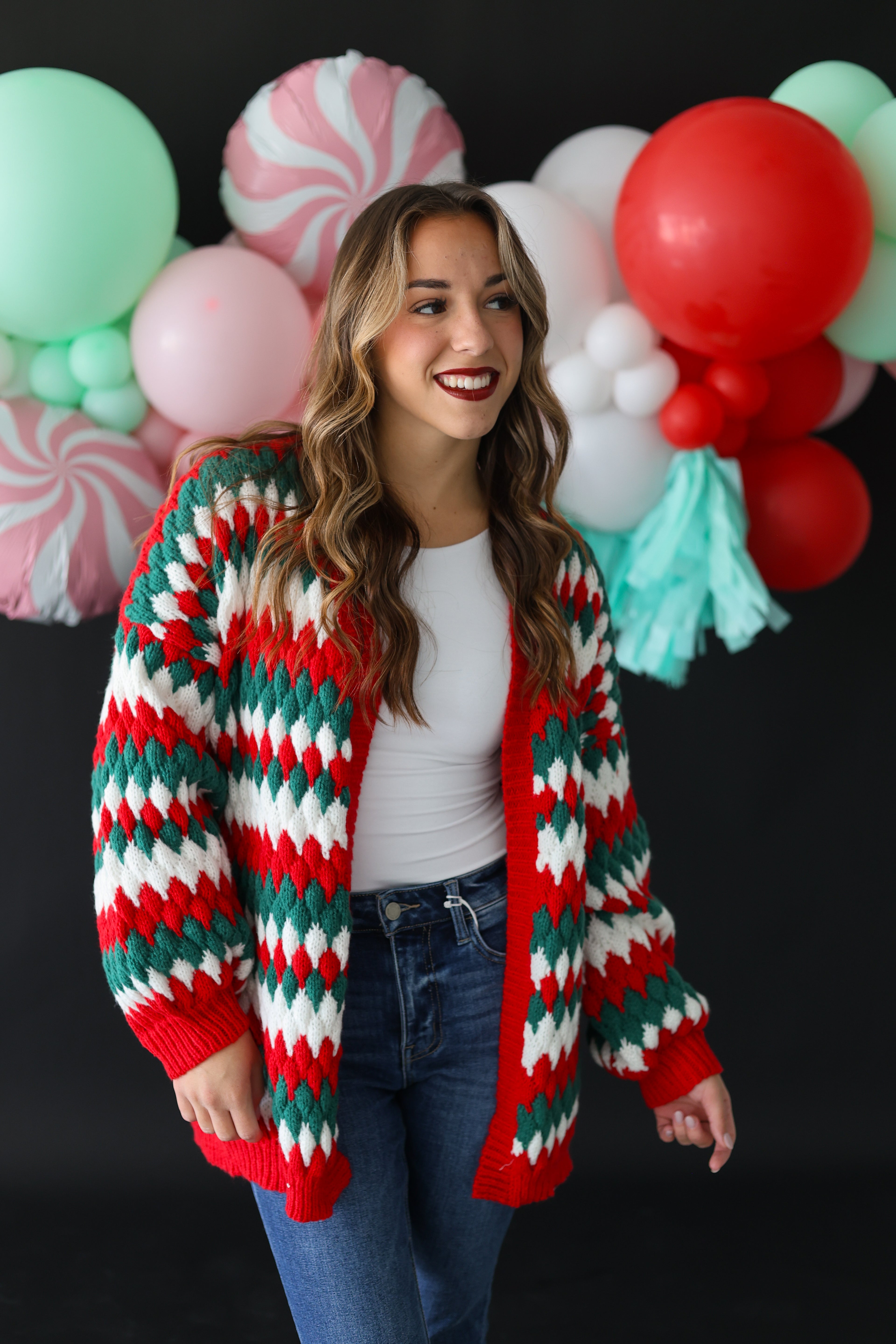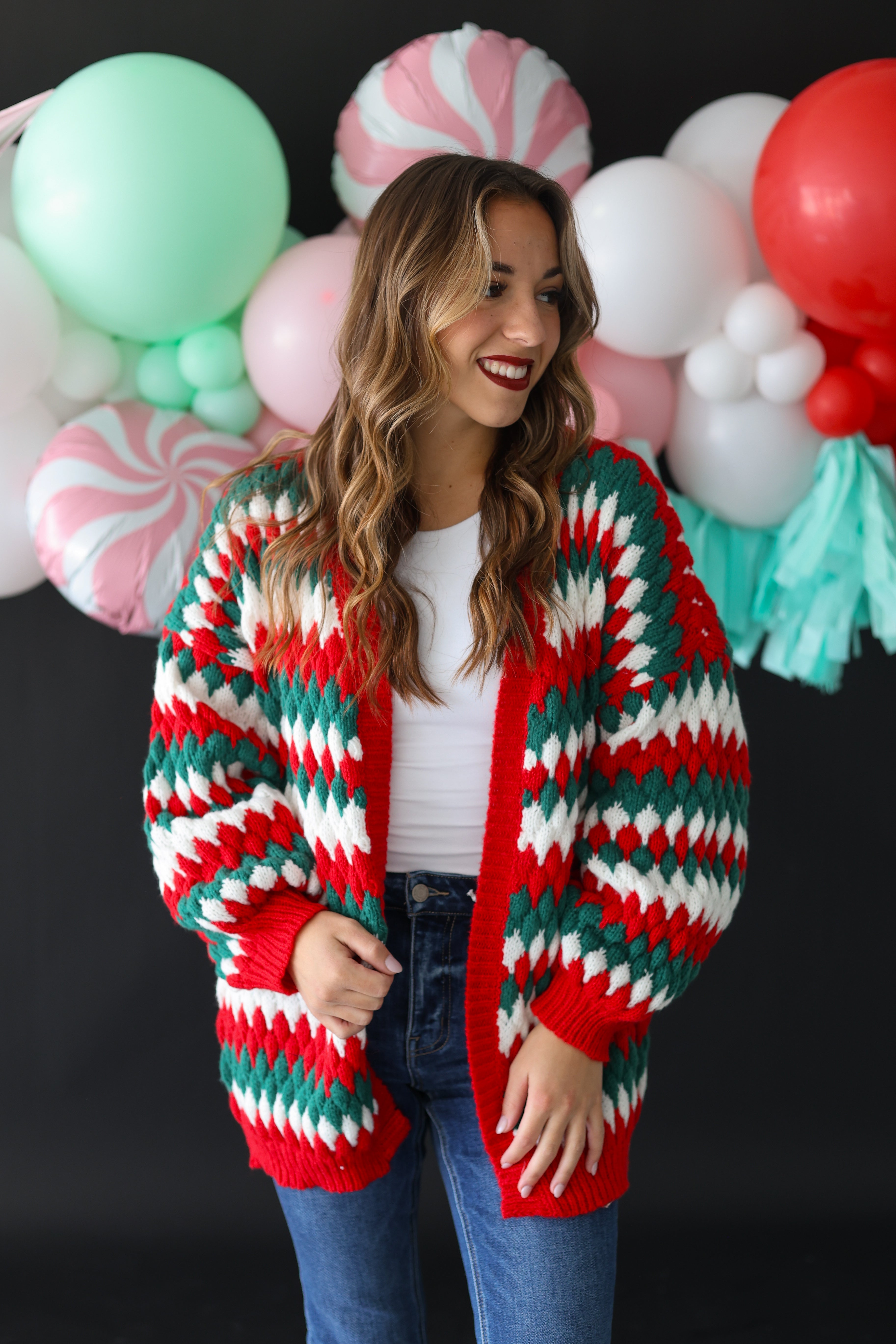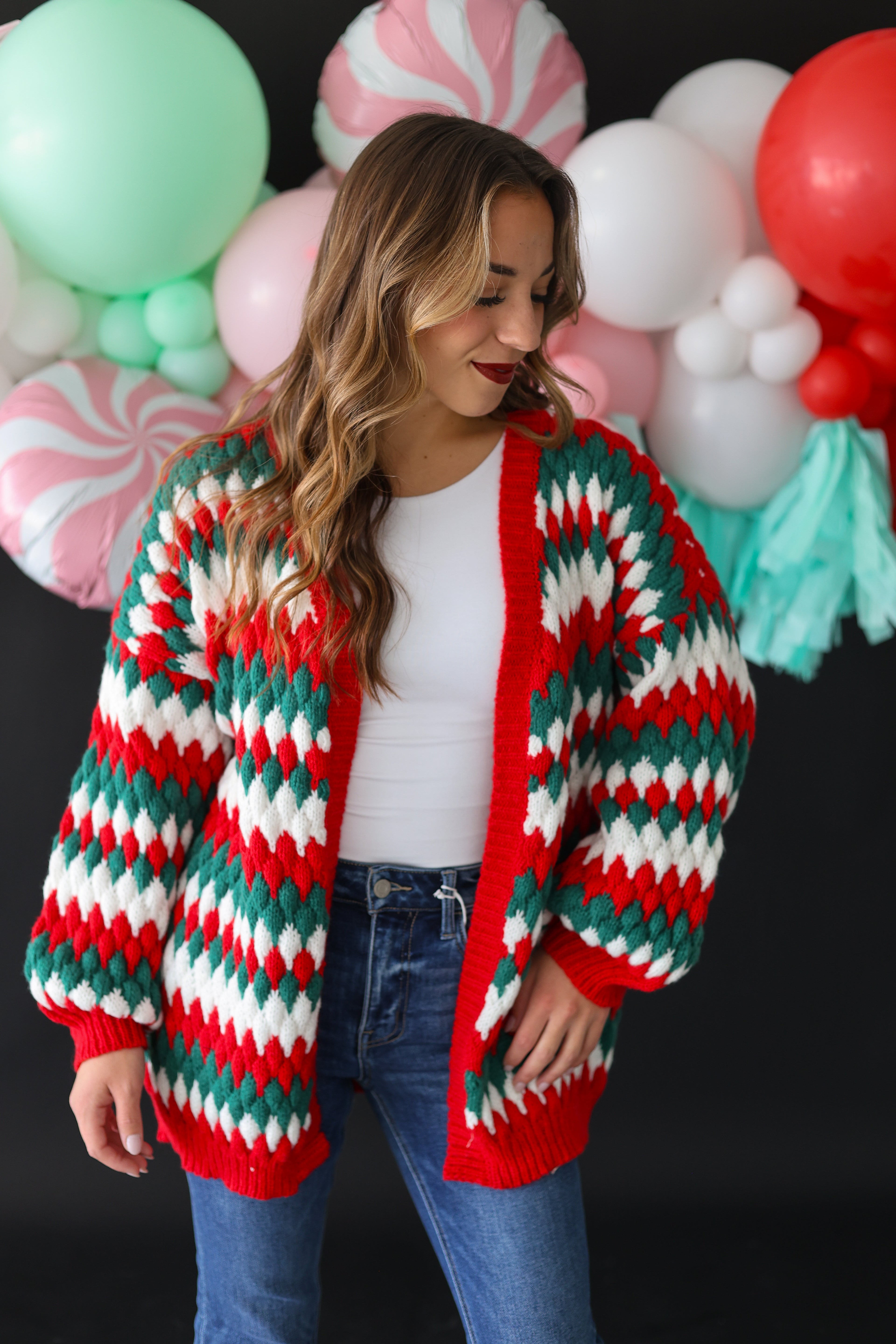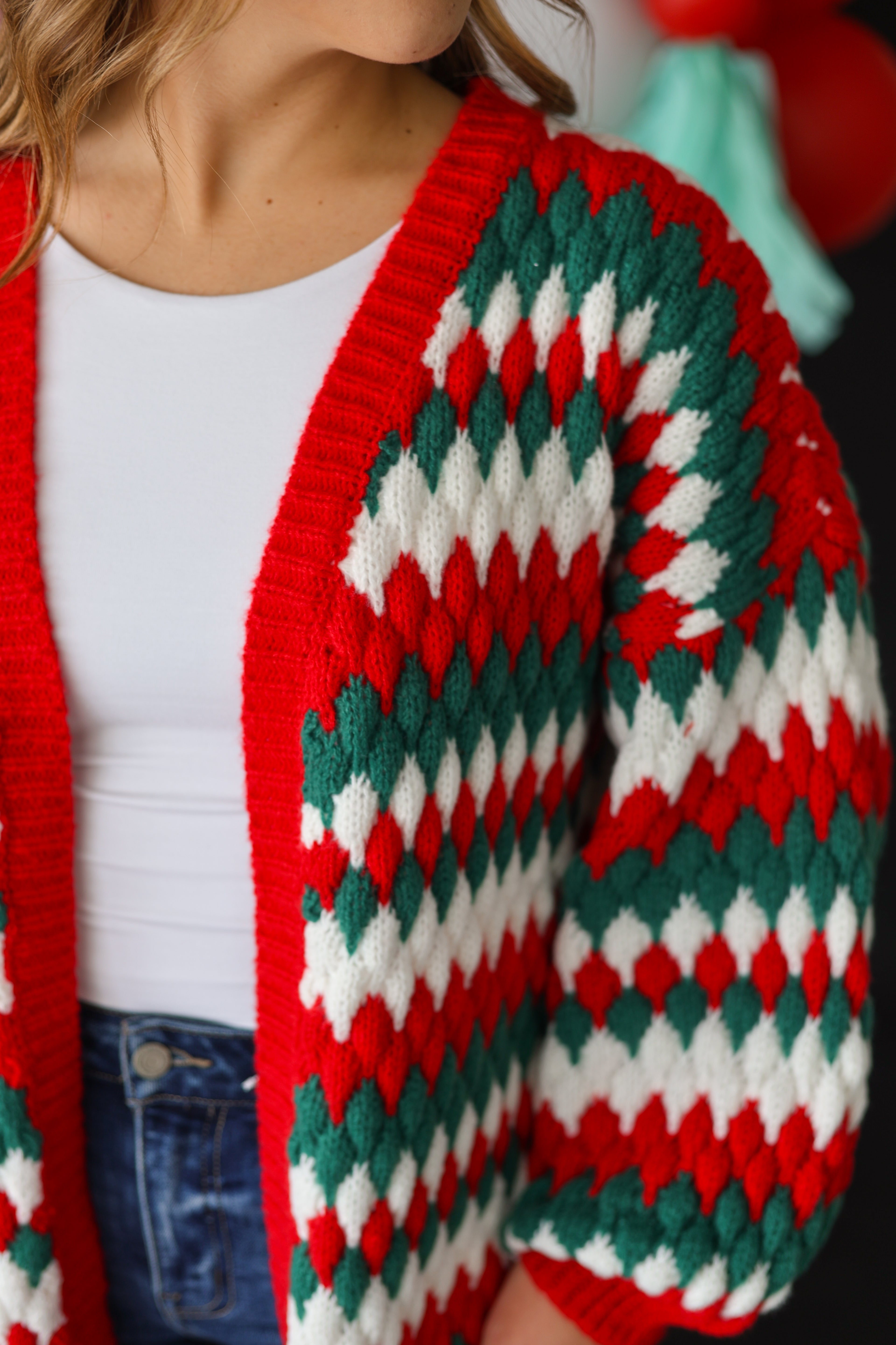 Celebrate the holiday season in cozy style with the Merry & Bright Cardigan. This textured sweater blends festive red, green, and white hues for a cheerful look that’s perfect for any Christmas gathering. Its soft fabric keeps you warm while the playful design spreads holiday joy wherever you go. Ideal for casual days, this cardigan adds a fun, spirited touch to your winter wardrobe.