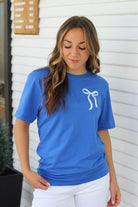 Celebrate game day in style with this casual tee featuring a playful bow on the front. The back proudly displays "On Gamedays we wear Blue," making it perfect to show your team spirit at every football game. Comfortable and fun, it’s your go-to shirt for cheering on your favorite team.