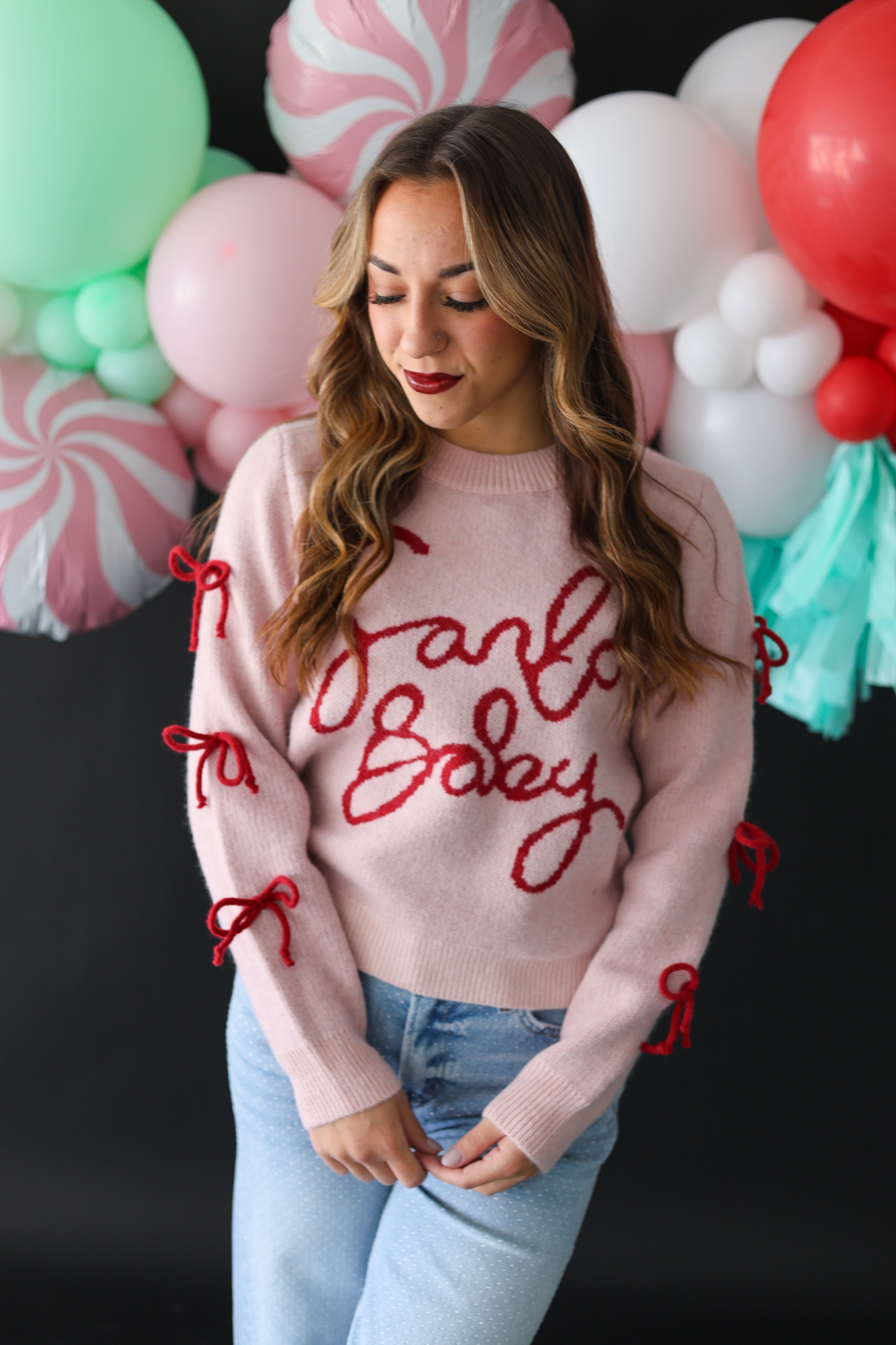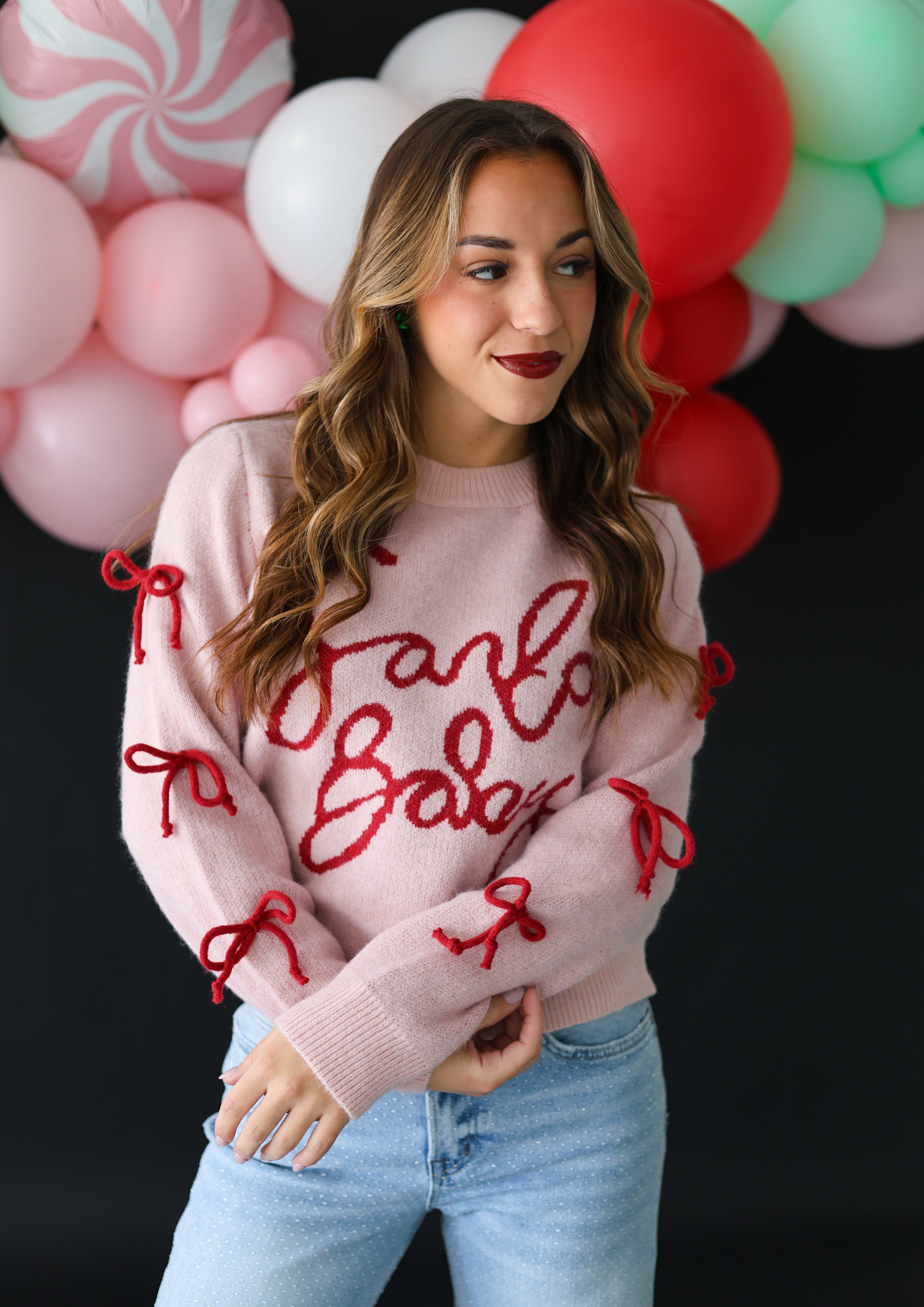 Get into the holiday spirit with this adorable pink sweater featuring bold red "Santa Baby" lettering and charming red bow accents. Perfectly girly and festive, it’s a fun way to celebrate Christmas and spread cheerful vibes all season long. Cozy up and shine bright at every holiday gathering!