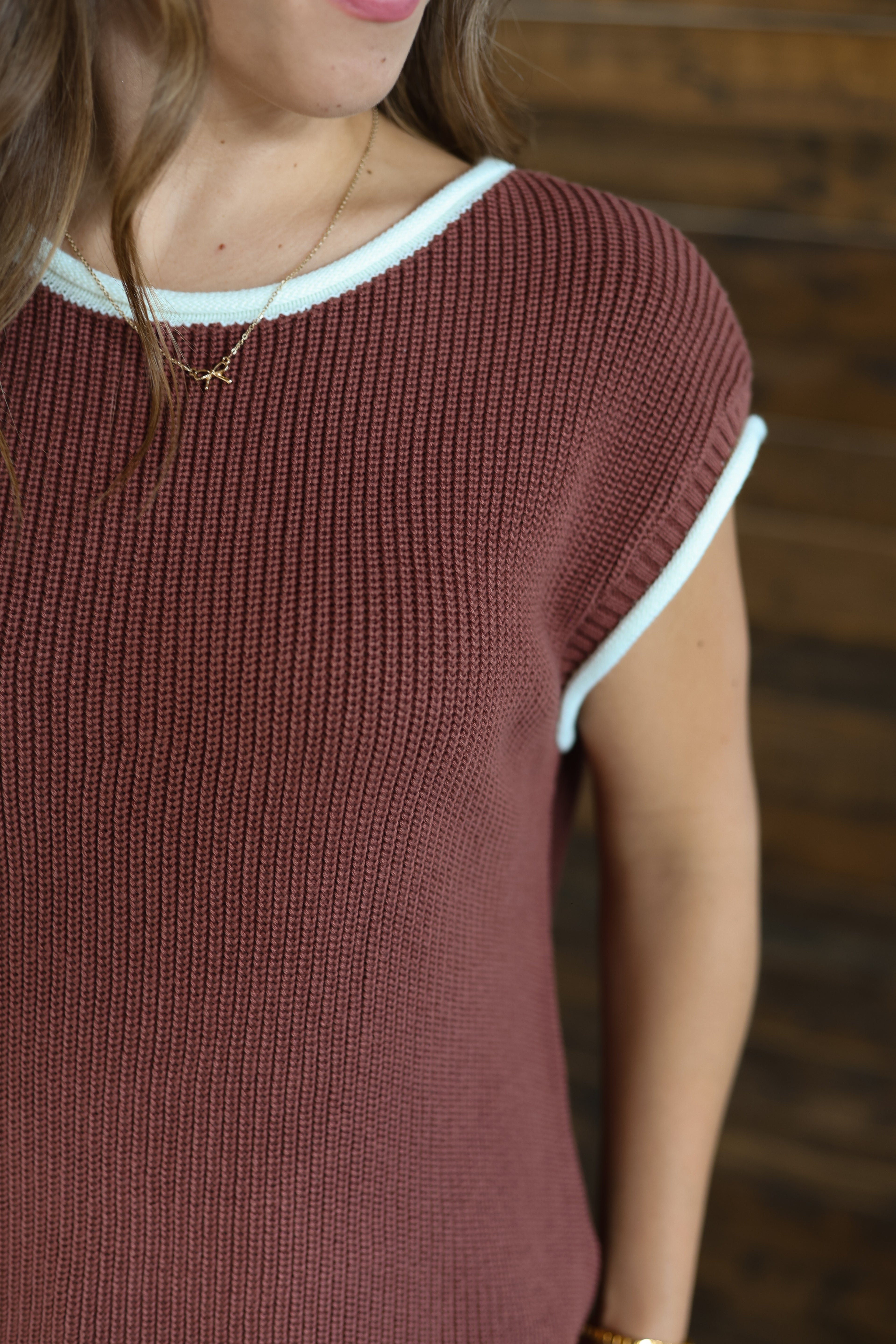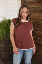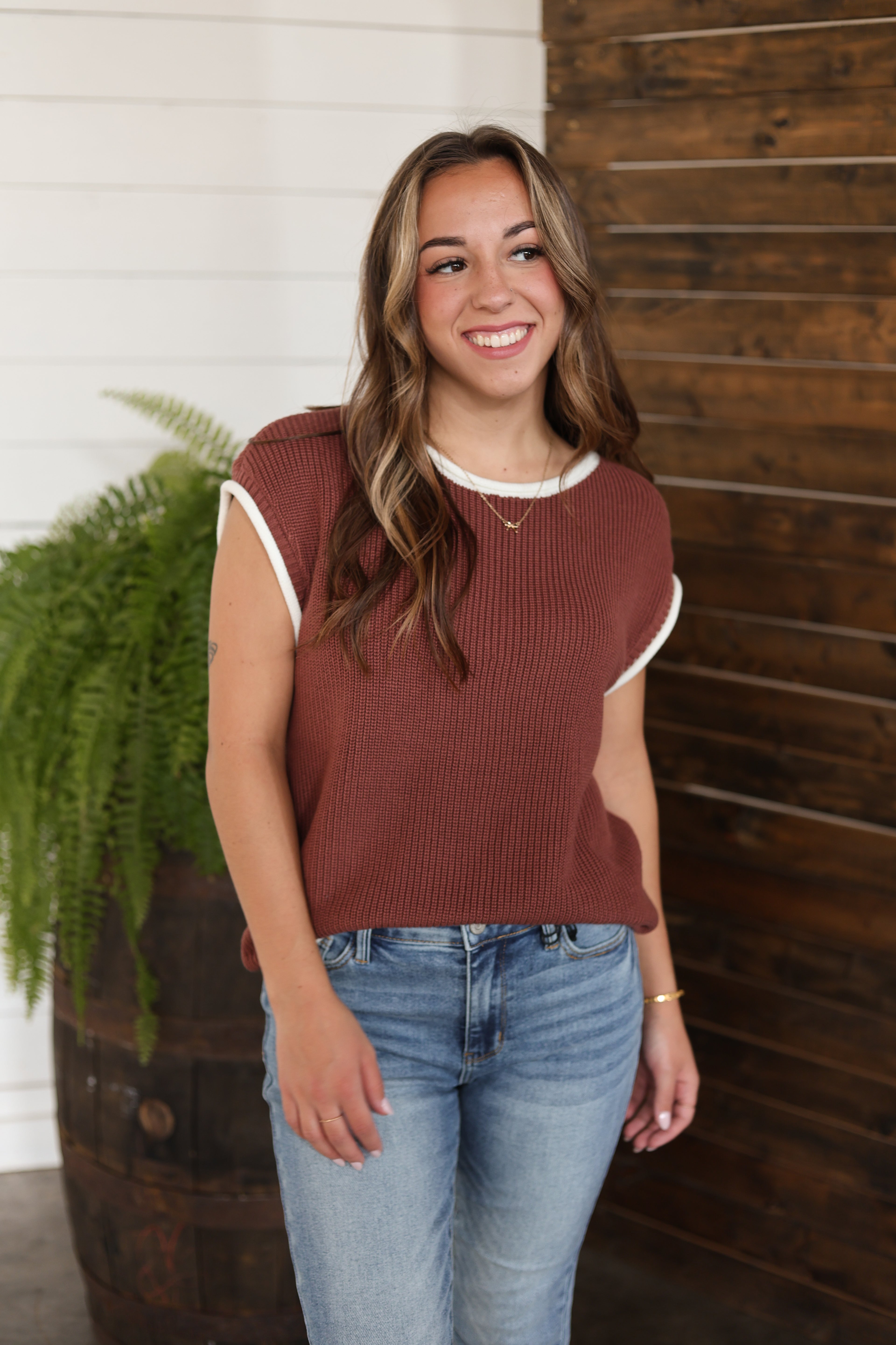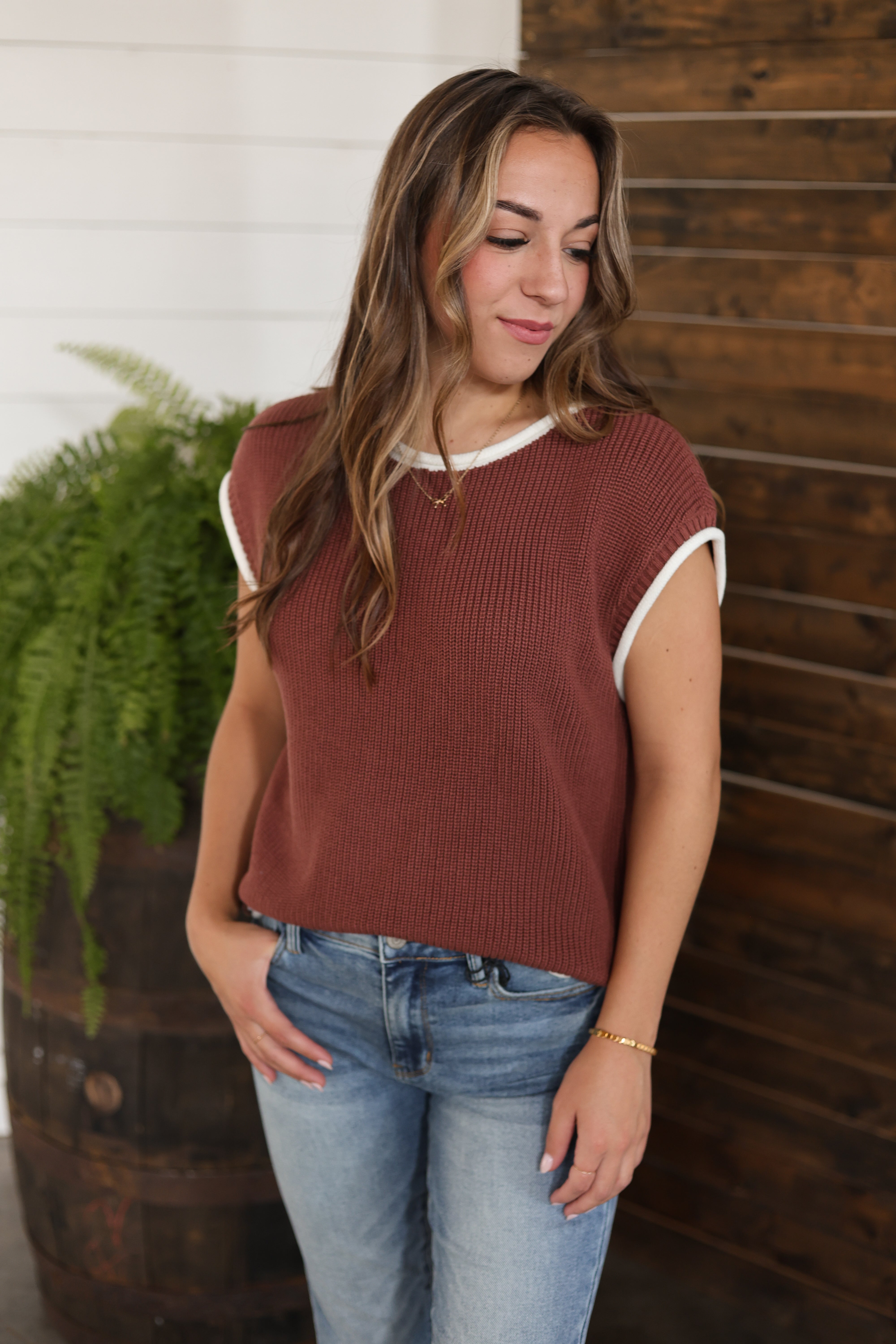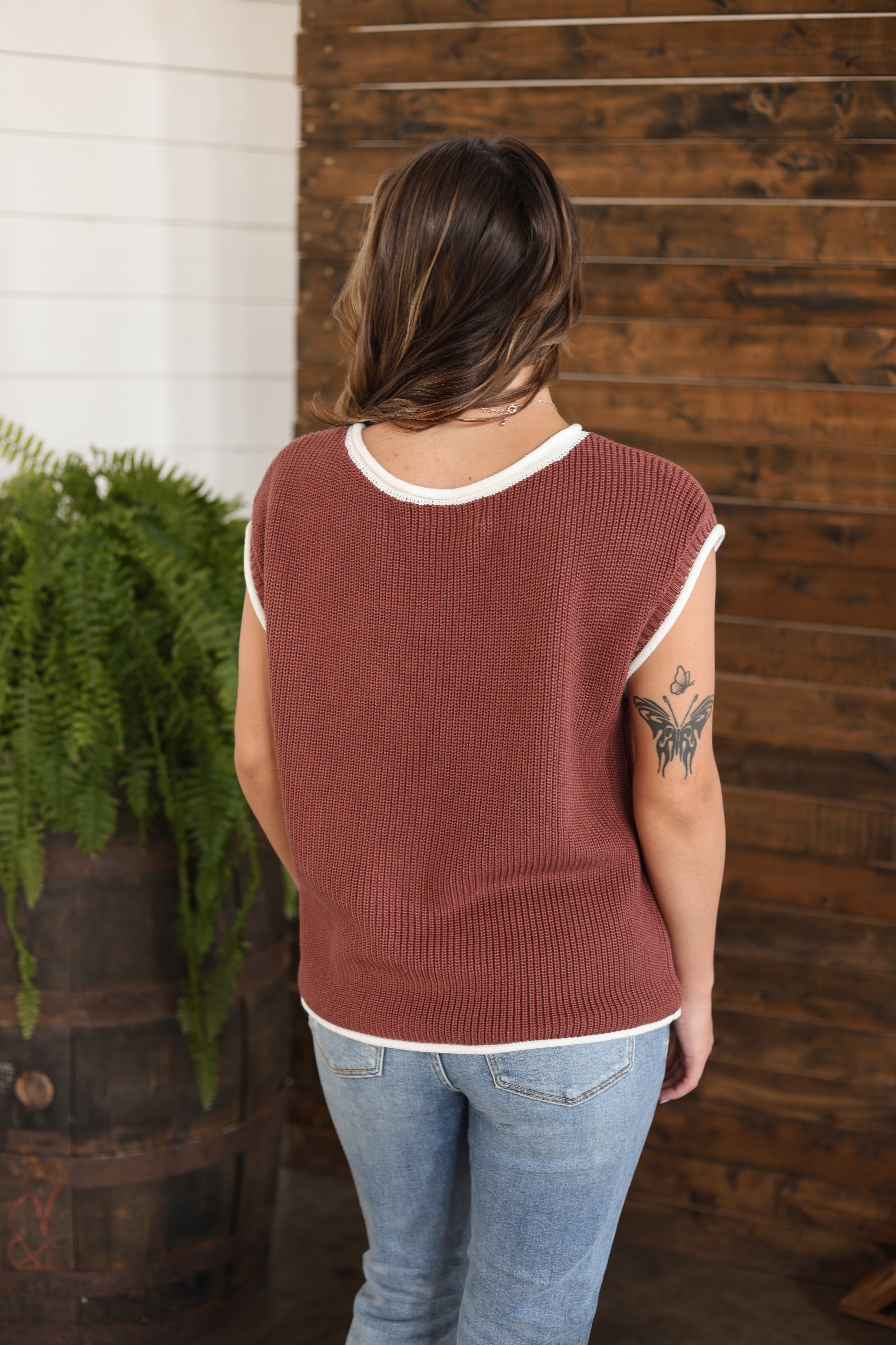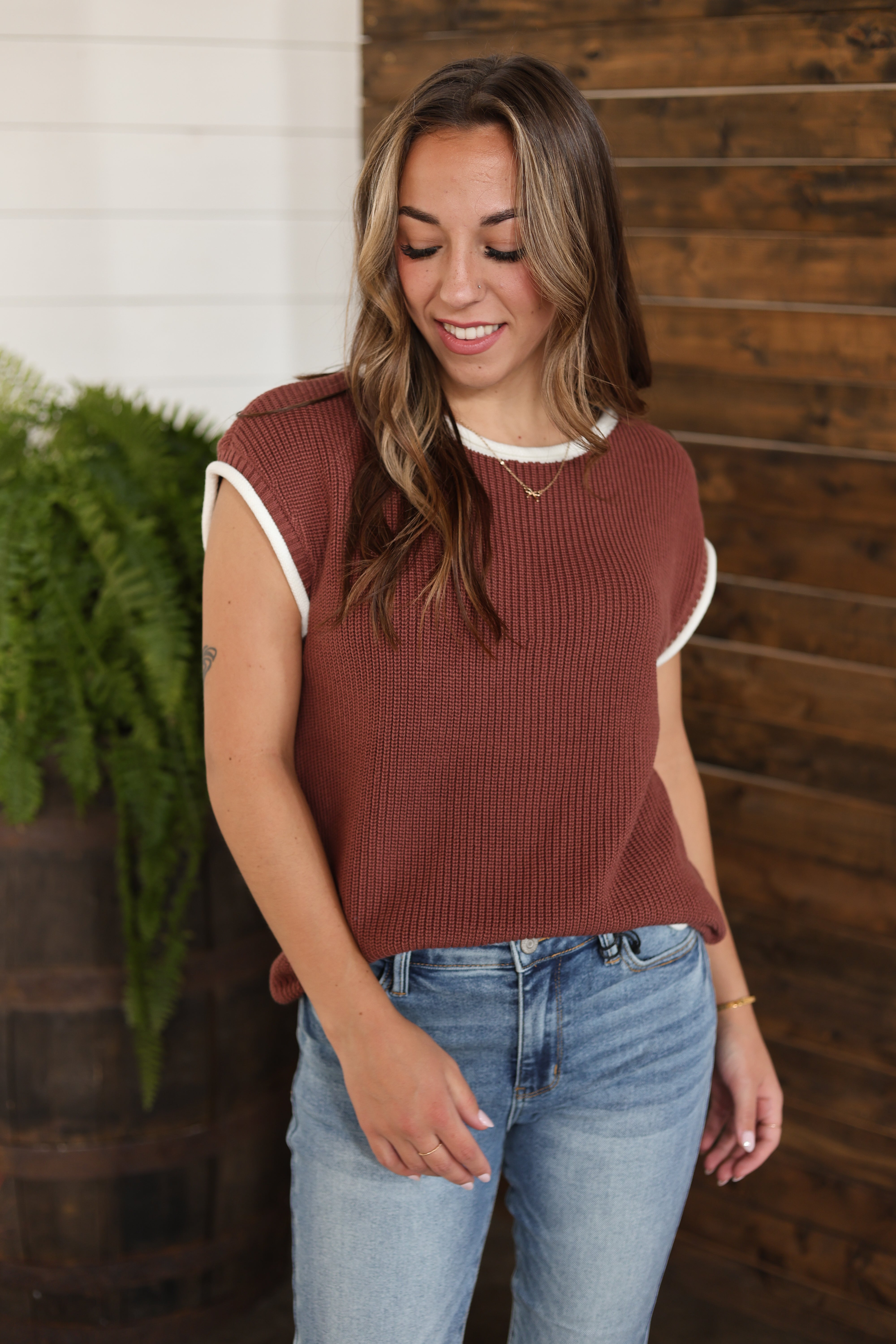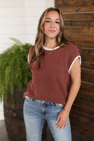 This cozy knitted sweater vest features a stylish rolled edge design that adds a unique touch to your casual wardrobe. The rich Irish coffee color is beautifully complemented by a cream contrast edge, making it easy to pair with your favorite outfits. Perfect for layering, this vest brings warmth and a fun pop of color to your everyday look.