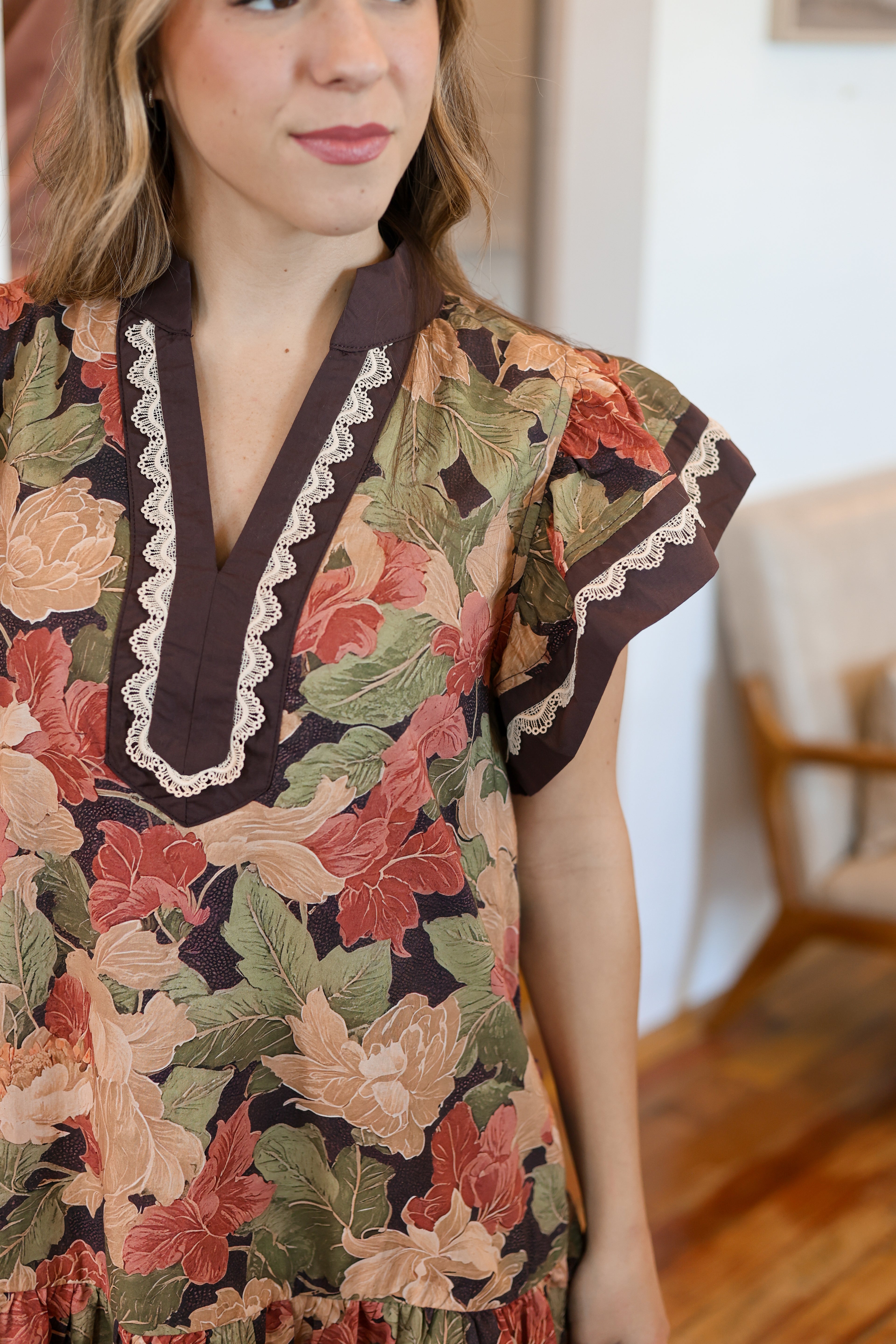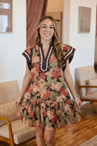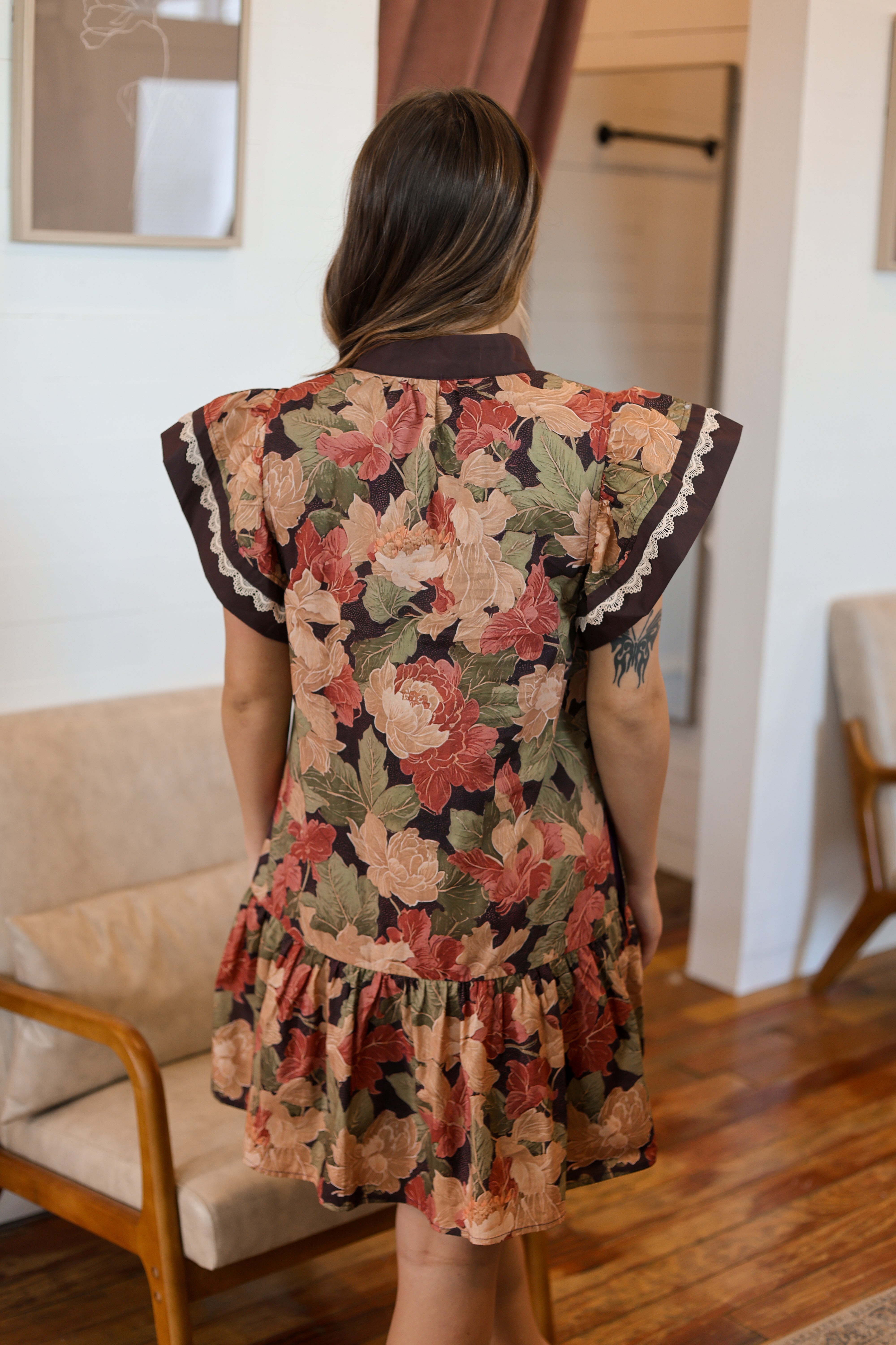 moody floral fall print, brown fall florals, trendy brown color aesthetic for fall, mini dress autumn, fall shower dress, wedding guest dress