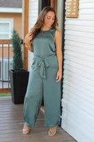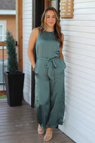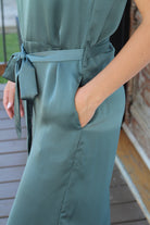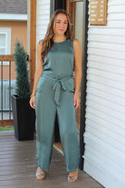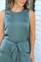 Step into effortless style with the Anastasia Jumpsuit. This dusty green satin piece features a sleeveless design and a chic back keyhole detail, perfect for turning heads at weddings or fall photo outings. The waist tie flatters your silhouette while adding a playful touch. Ideal for anyone looking to blend comfort with a touch of elegance for any special occasion.