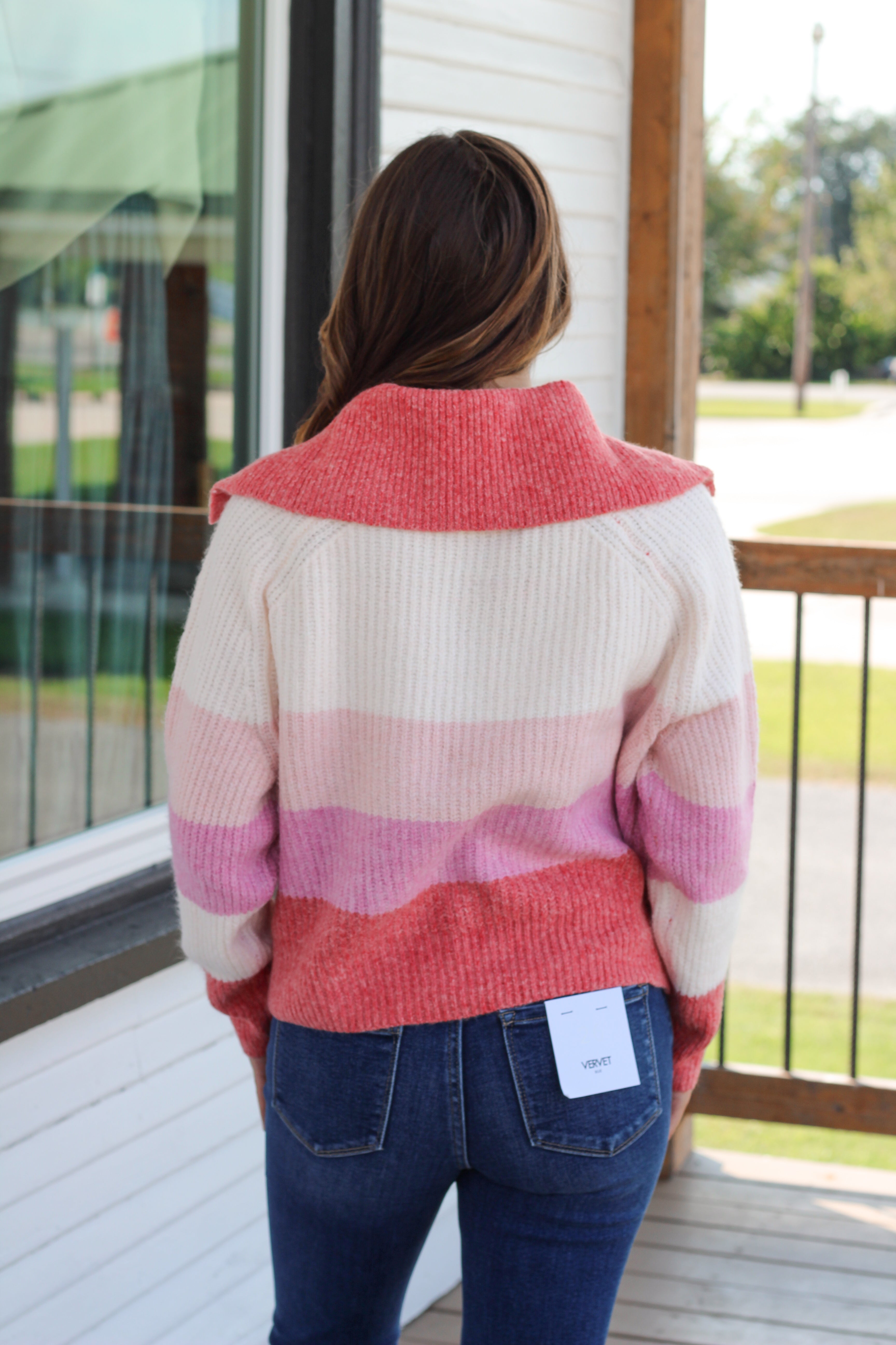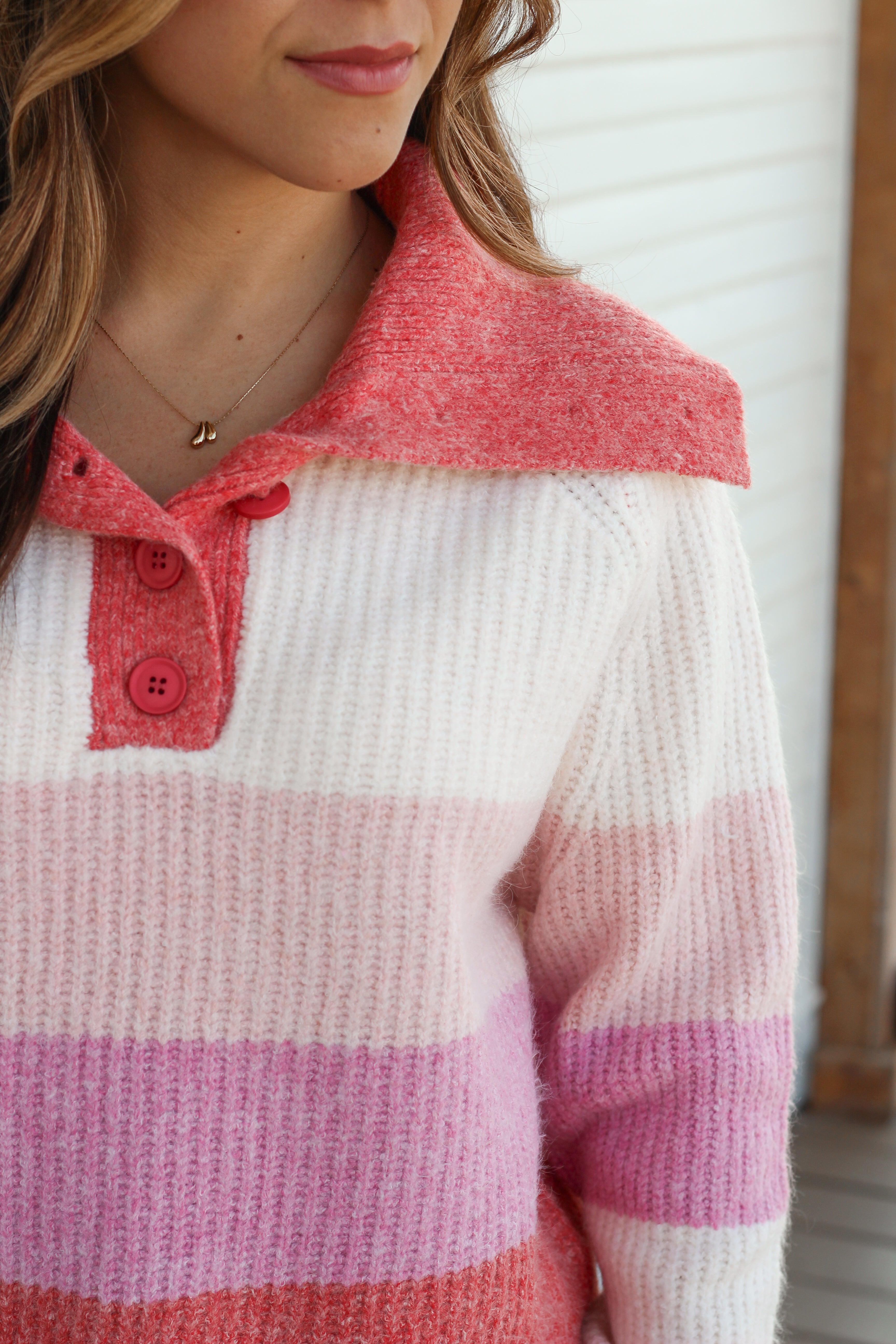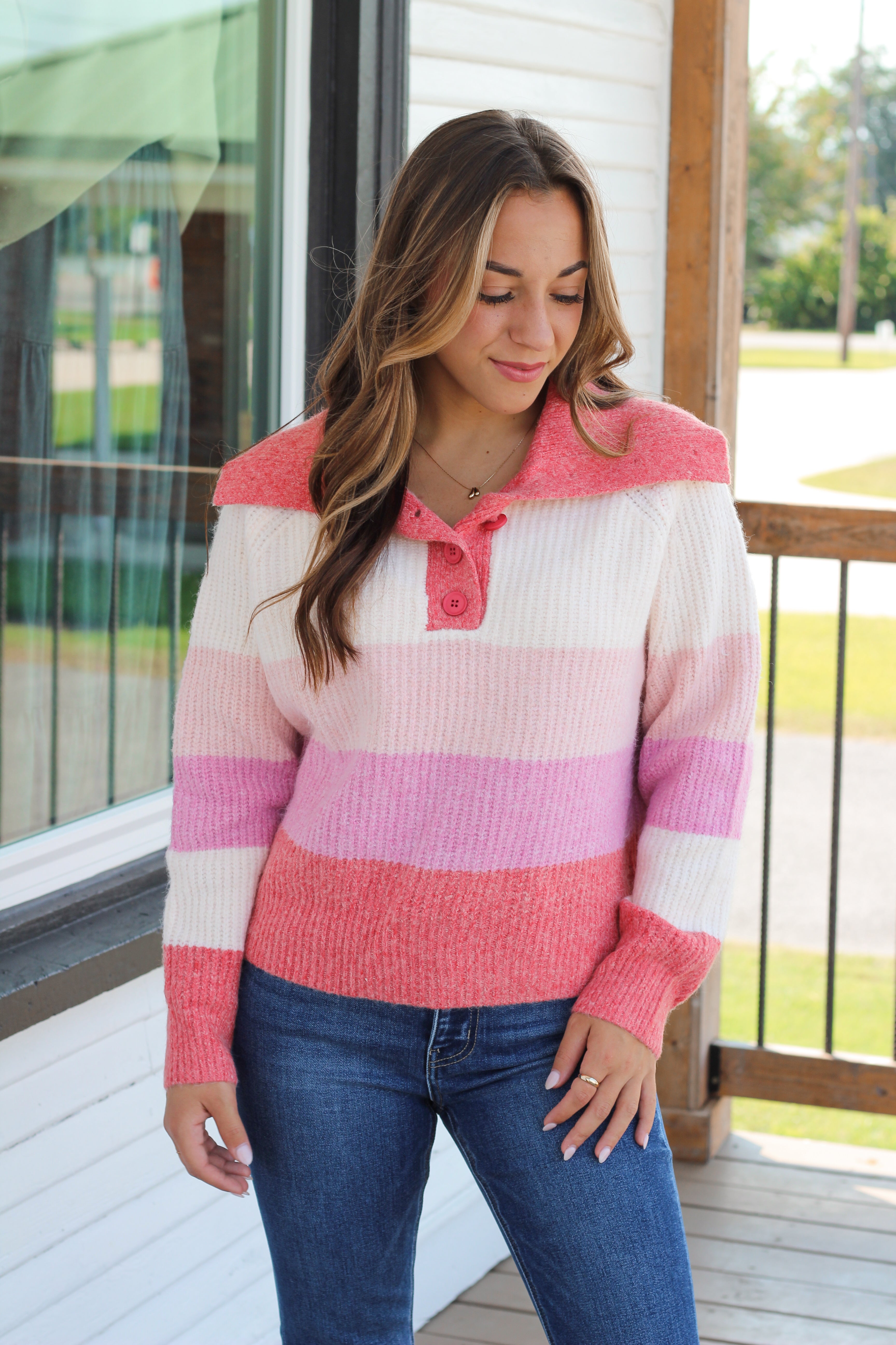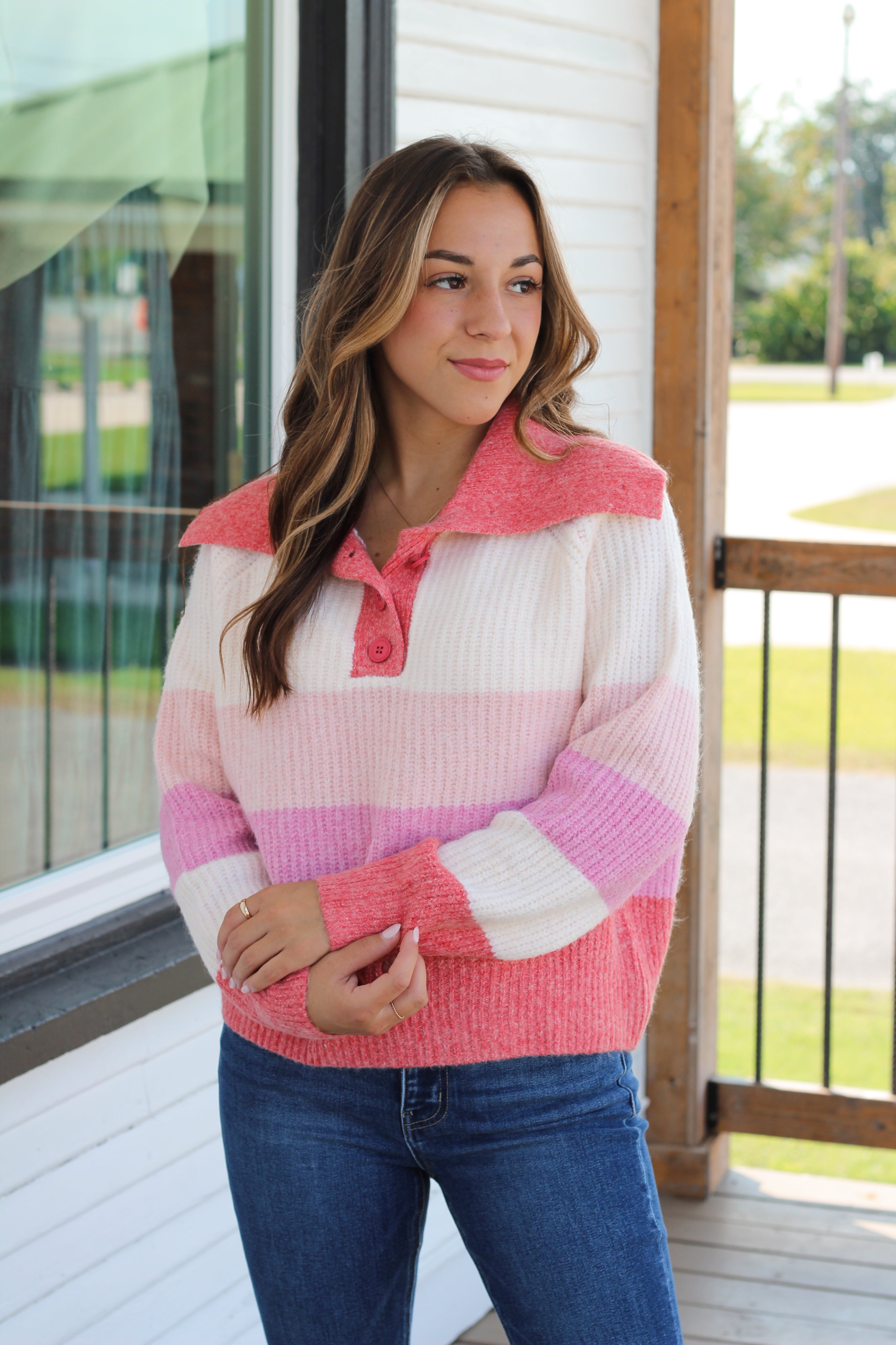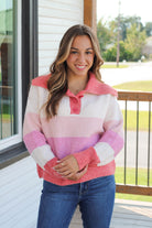 The Ashlyn Striped Sweater features a charming collar detail and three front buttons for a stylish touch. Its long sleeves and cozy fabric make it perfect for crisp fall days. With color block stripes in delightful shades of pink and cream, this sweater brings a comfortable, casual vibe to your autumn wardrobe. Stay warm and effortlessly chic all season long!