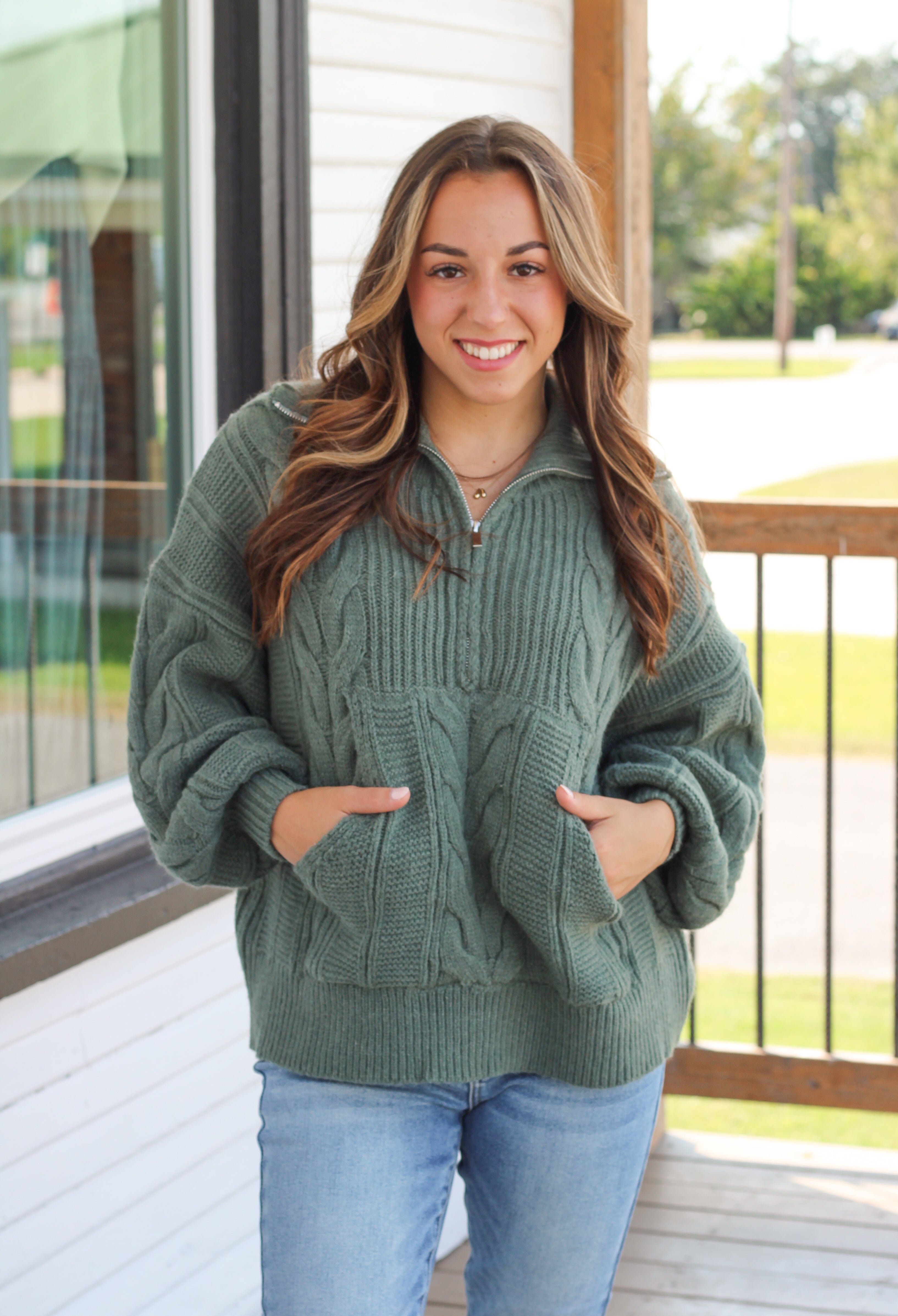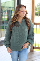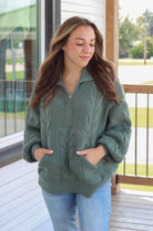 Get cozy in the Ashton Sweater, crafted in a rich dark sage chunky cable knit. This half-zip pullover features kangaroo pockets for added comfort and practicality. Made with amazing quality materials, it’s your new go-to sweater for everything from lazy weekends to casual outings. Stay warm and stylish effortlessly!