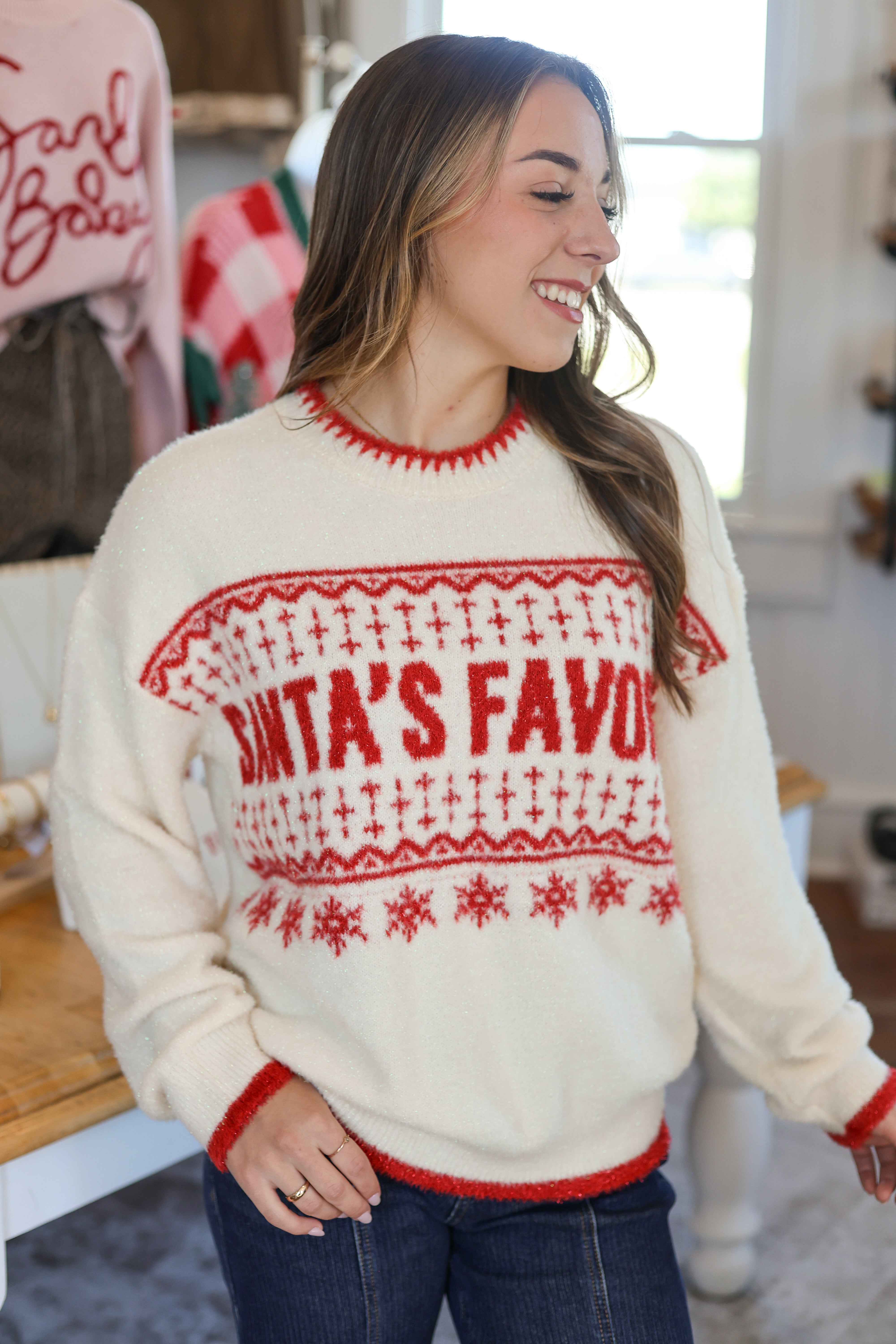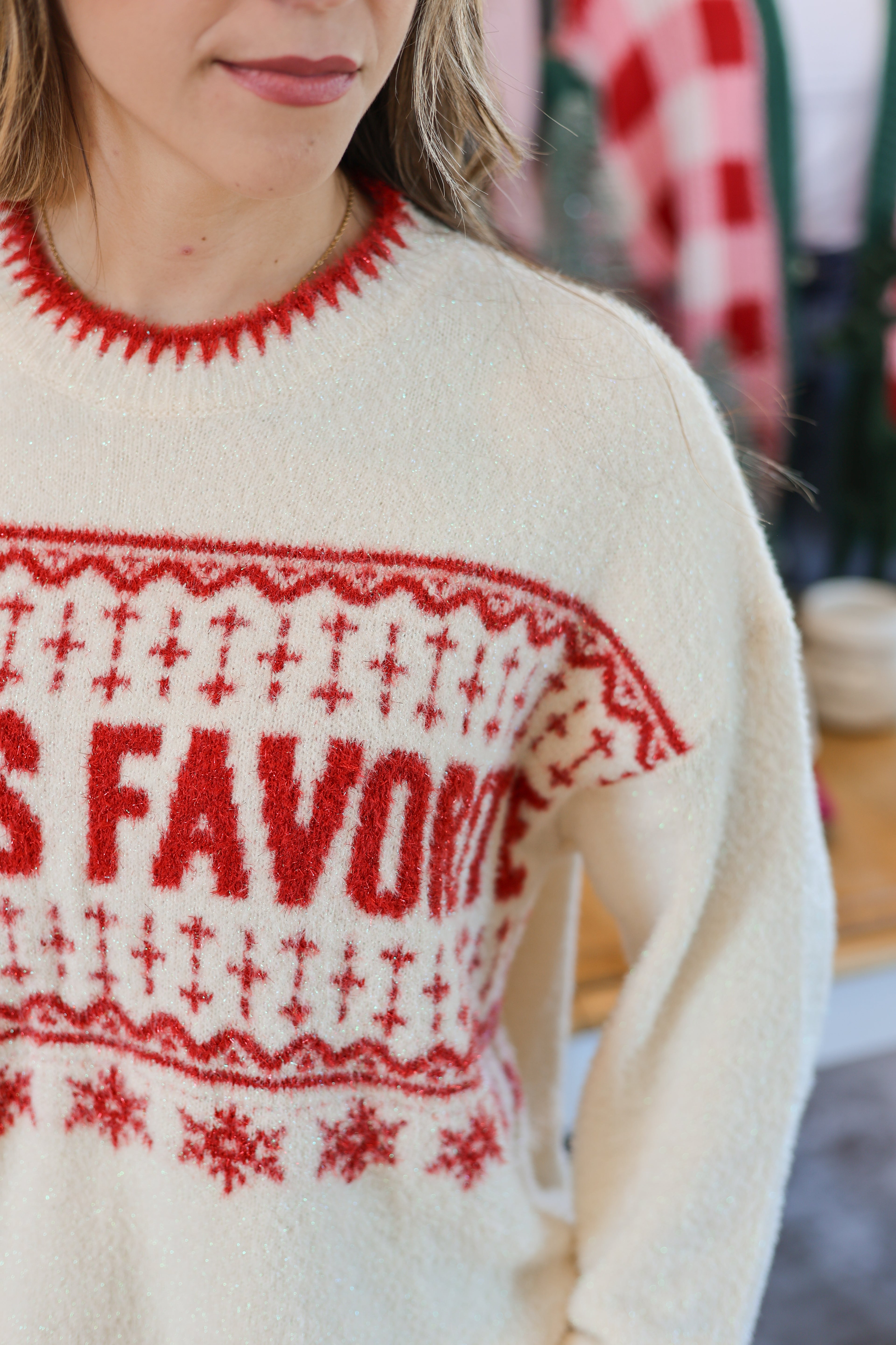 Get cozy and festive with this adorable "Santa's Favorite" sweater! Made from sparkly cream knit material with charming red trim details, it's the perfect way to shine at every holiday gathering. Cute, comfortable, and full of Christmas cheer, this sweater will quickly become your season’s favorite.