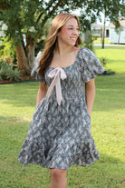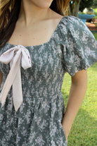 The Terri Dress is a charming dark green piece adorned with a delicate floral print that brings a fresh, natural vibe. Featuring a smocked chest and short puff sleeves, it offers a comfortable yet stylish fit. The front satin champagne bow adds a touch of elegance, while practical pockets make it perfect for everyday wear. With tiered details and a fully lined design, this dress combines beauty and comfort effortlessly. Get ready to turn heads in this gorgeous favorite!