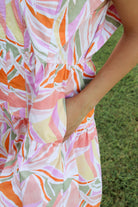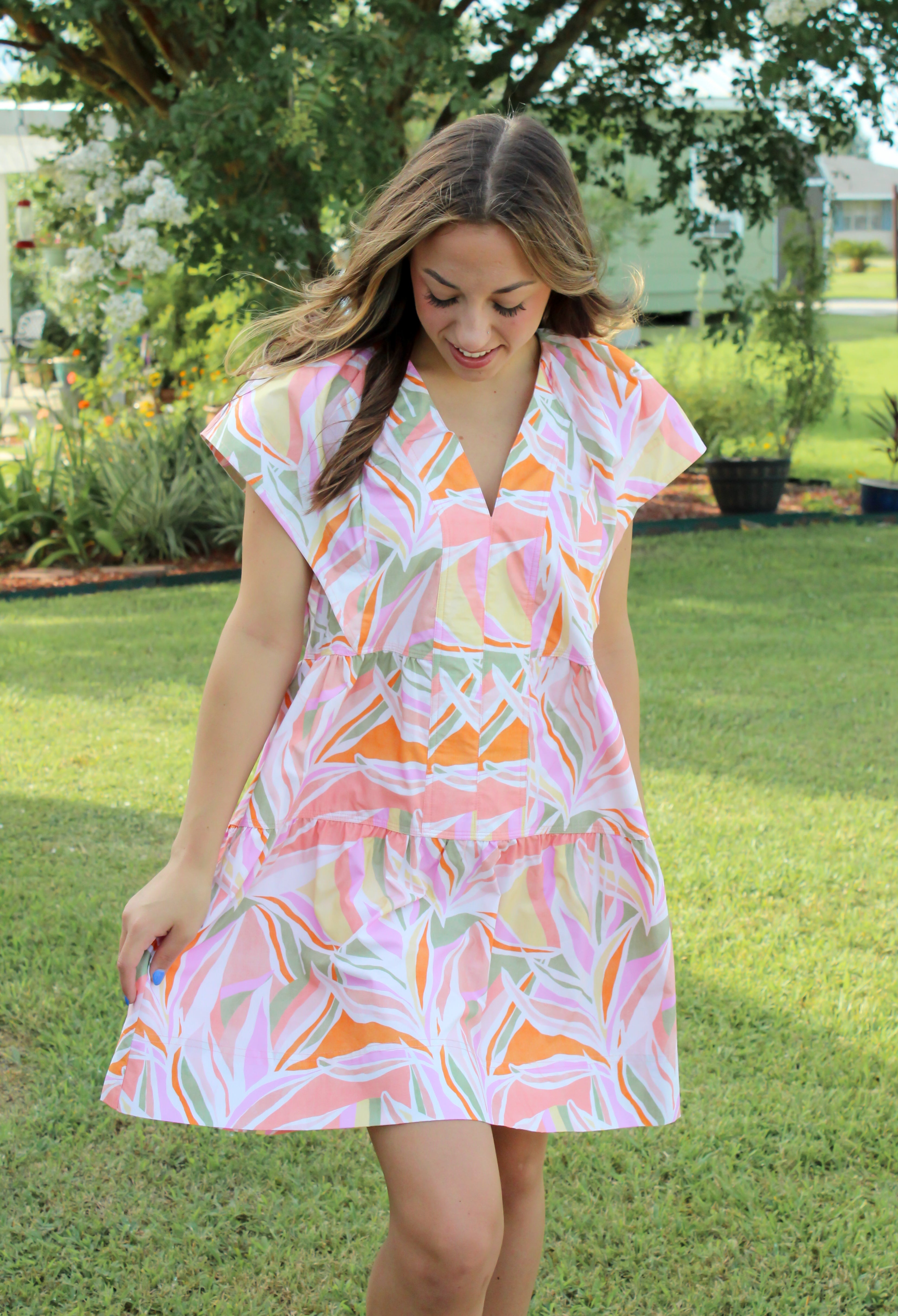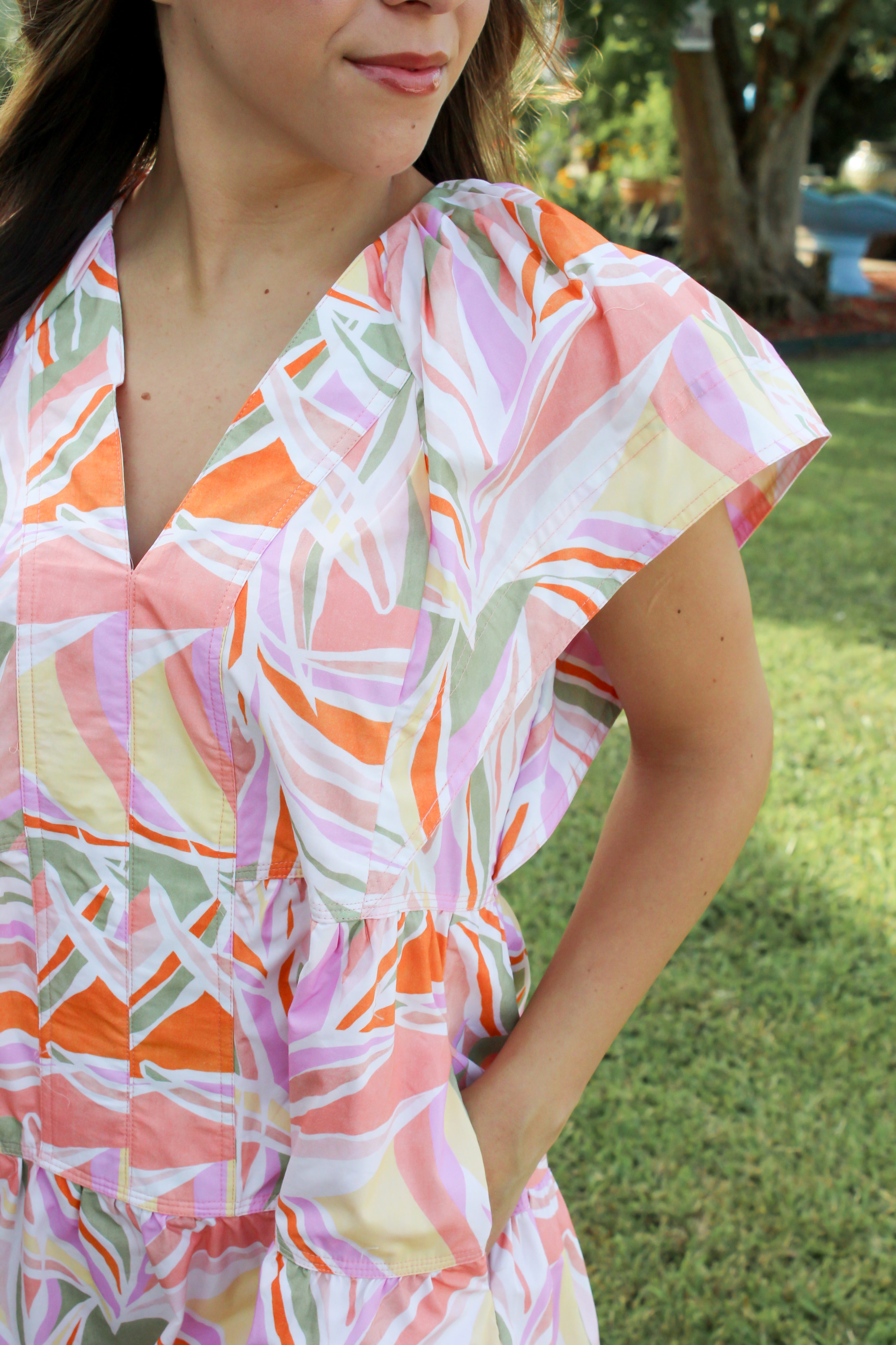 This statement sleeve Tropics Mini Dress features a vibrant tropical print on lightweight poplin fabric, making it the perfect colorful choice for summer days. Its playful tiers add movement and flair, creating a fun and breezy look that’s ideal for warm weather adventures!