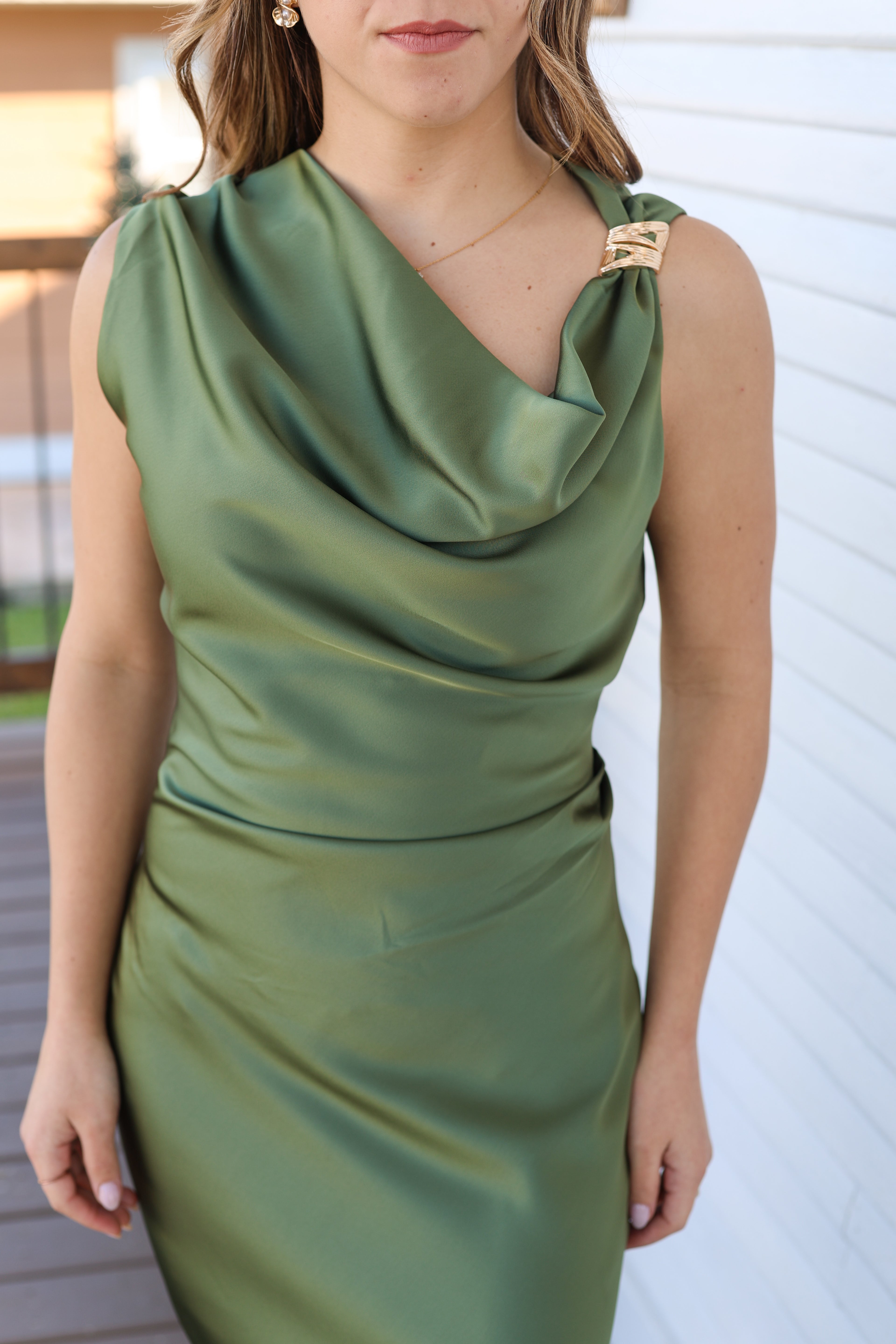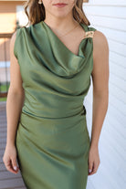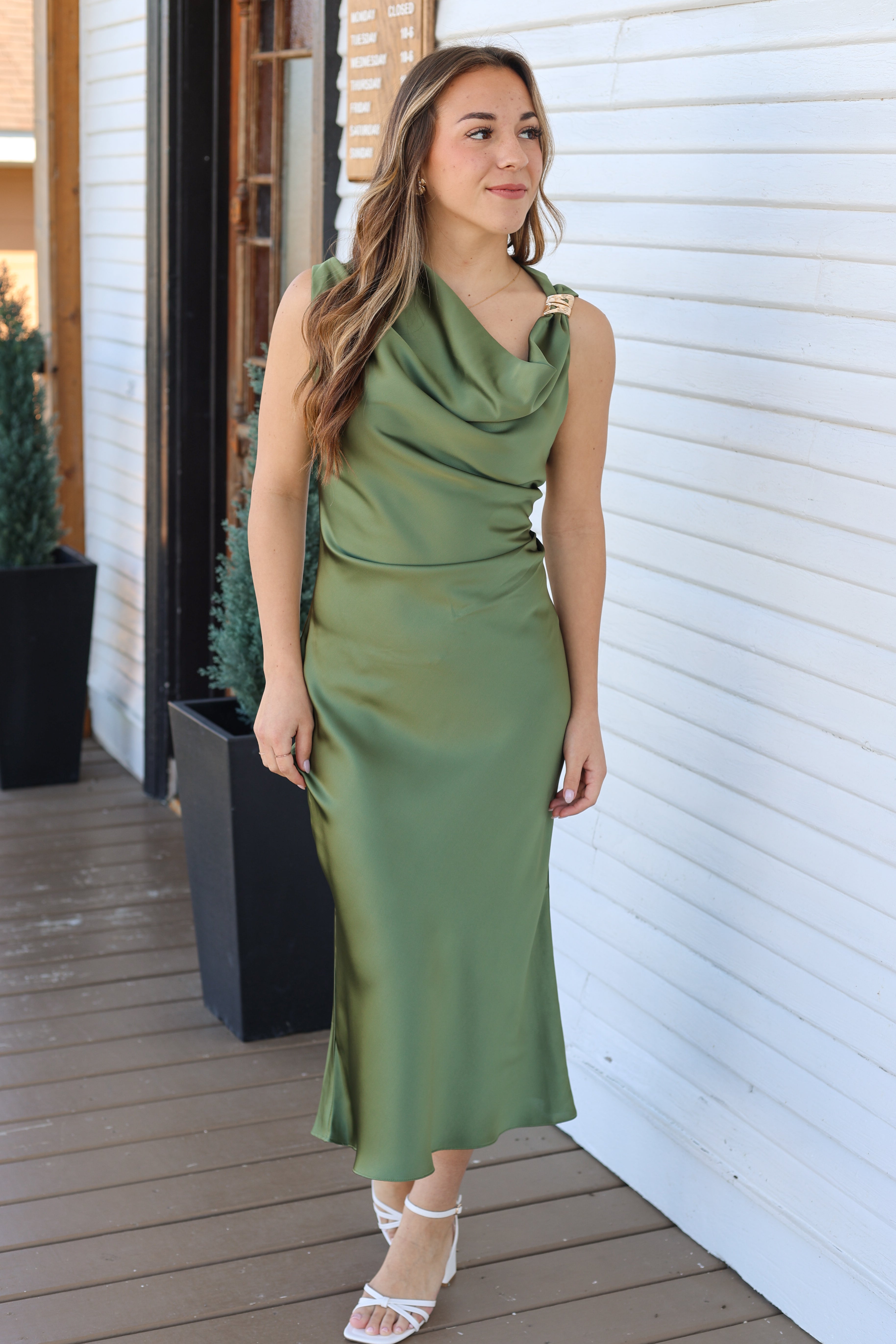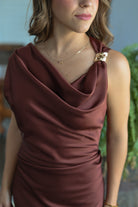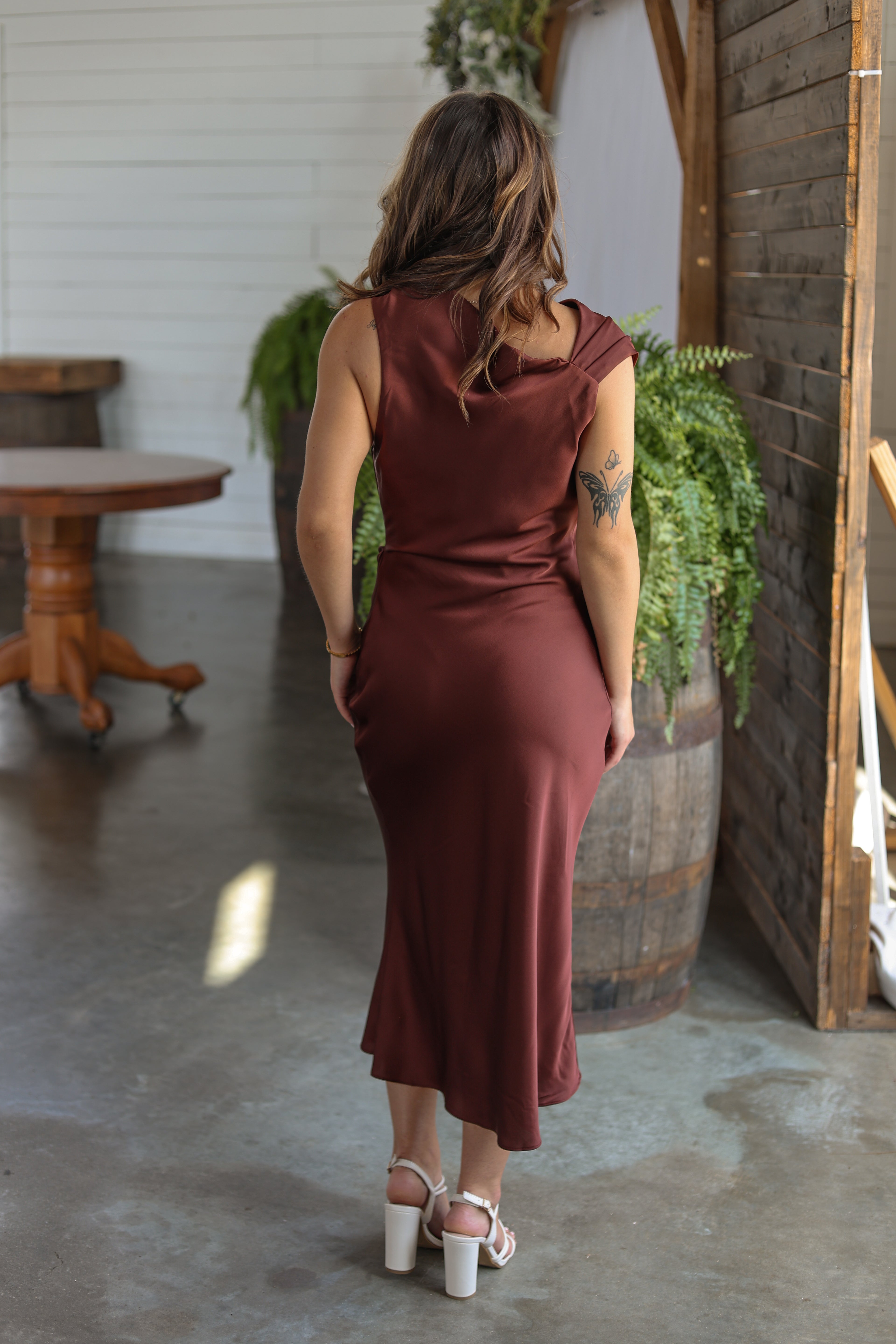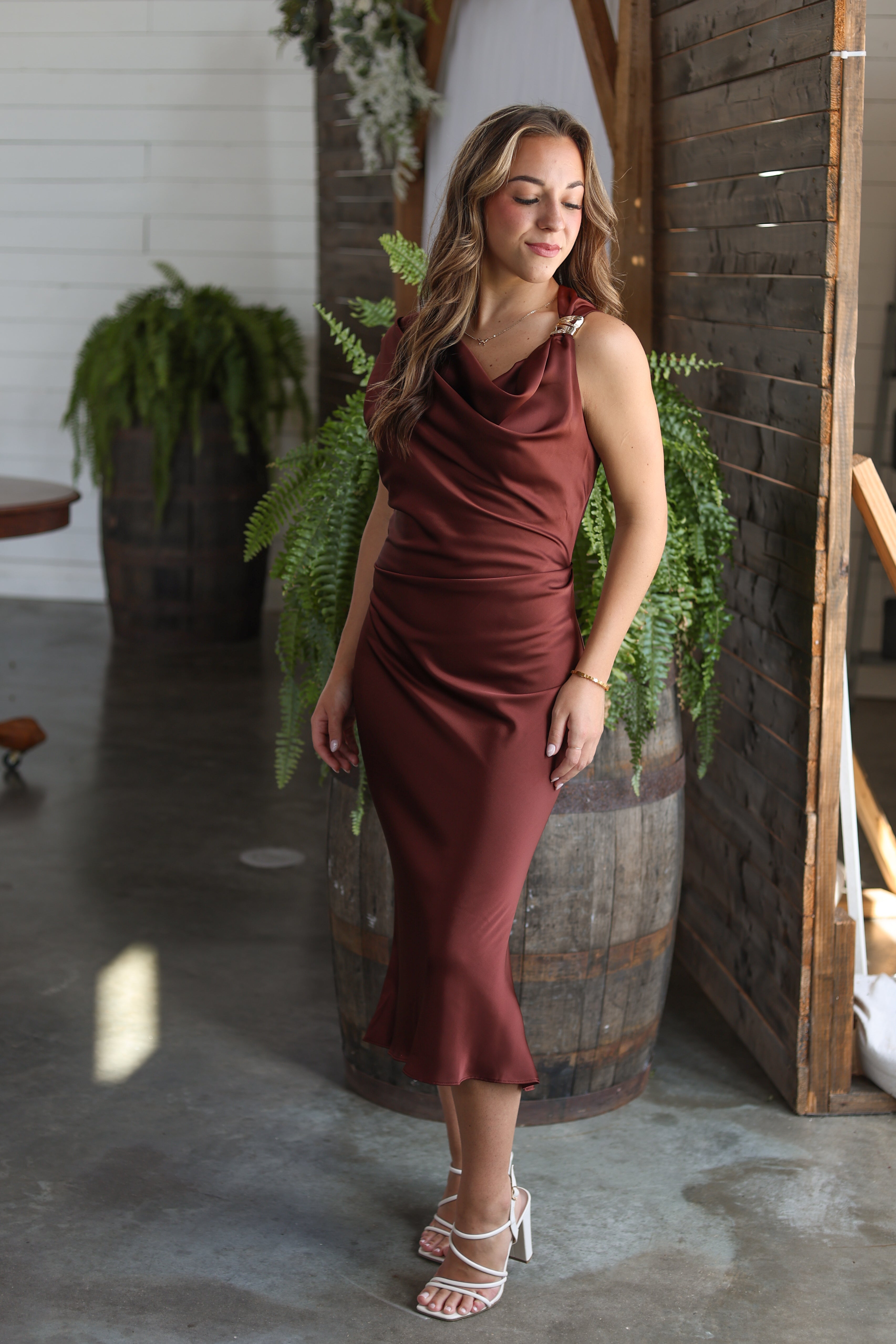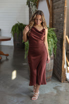 Experience effortless elegance with the Chocolate Dreams Dress. This stunning chocolate brown satin midi dress features a soft cowl neck and a comfortable pull-on design with no elastic or smocking for a smooth, flattering fit. Unlined and pocket-free, it offers a sleek silhouette perfect for any casual outing or special event. Embrace grace and style with this gorgeous, easy-to-wear dress!