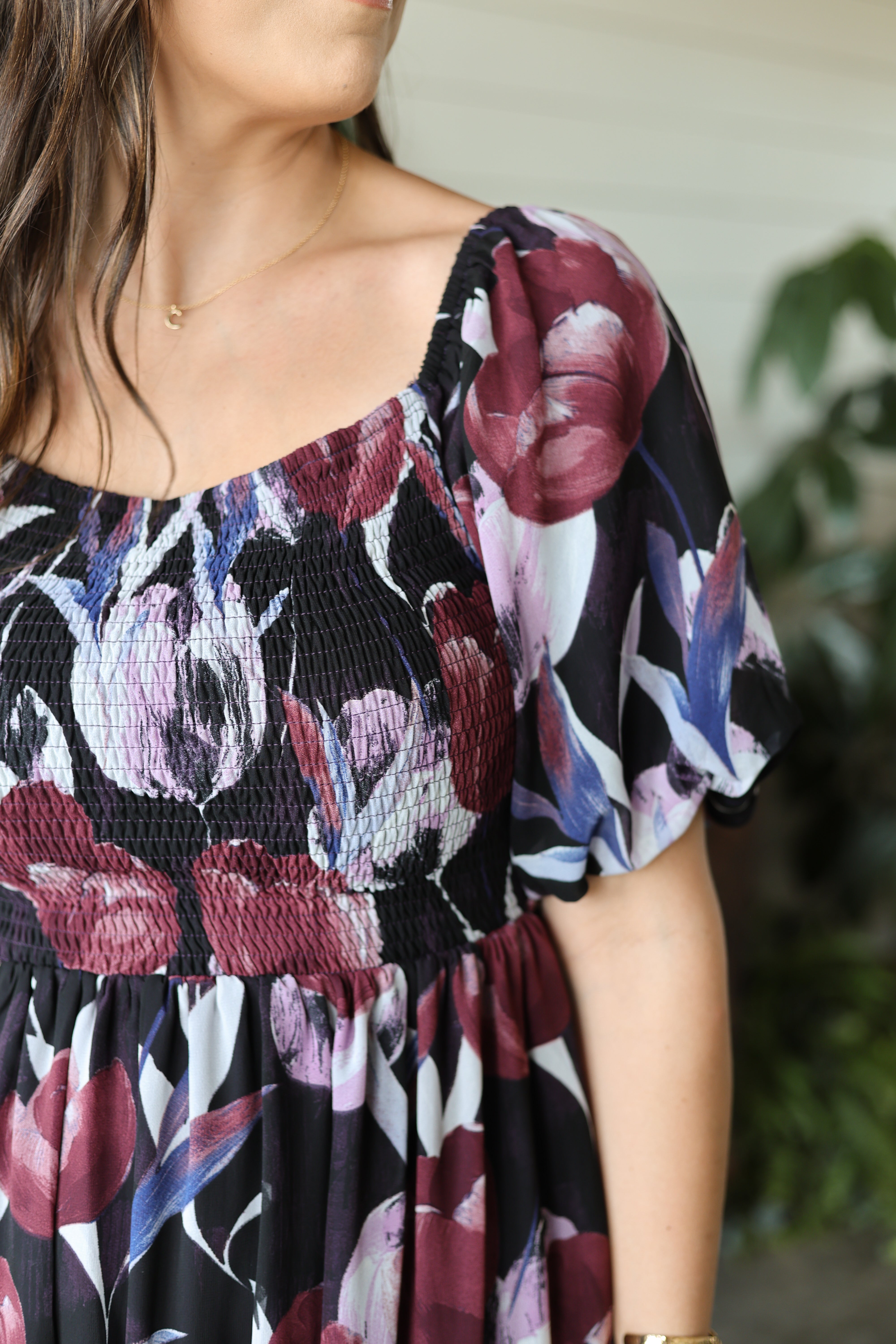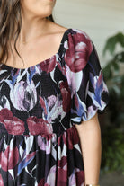 Embrace autumn’s rich palette with the Moody Florals Midi Dress. Featuring a smocked bodice and short puff sleeves, this moody midi dress showcases a dramatic big floral print in black, burgundy, and deep purple. Fully lined for comfort, it’s the perfect choice for weddings or fall family photos, blending effortless style with seasonal charm.