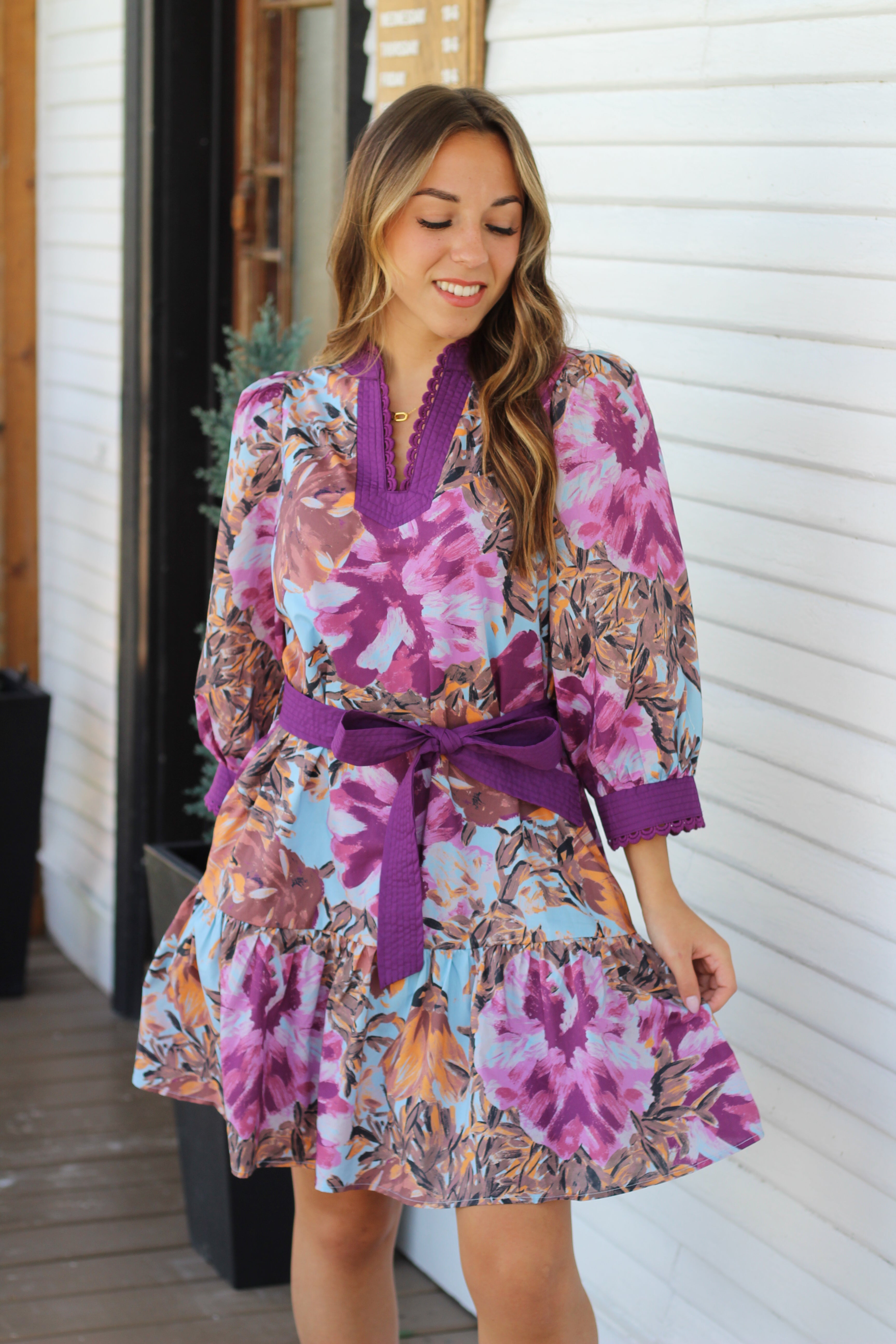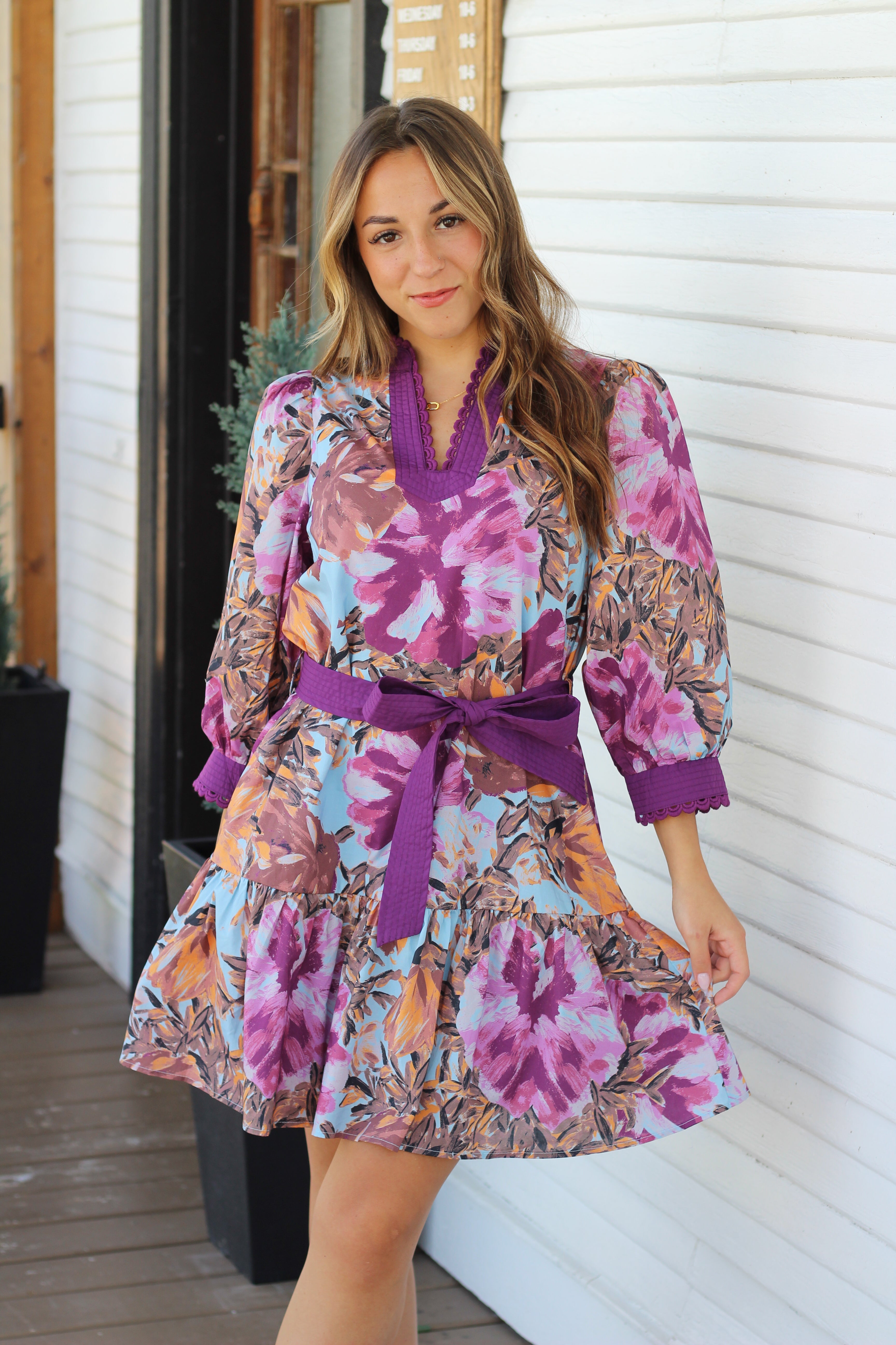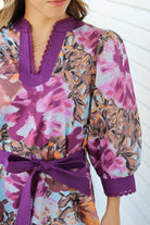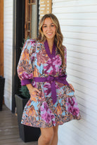The Palmer Dress is a playful mini-length piece featuring charming 3/4 length puff sleeves and a lively plum print that adds a fresh pop of color. Its waist tie enhances your silhouette while the convenient pockets keep essentials close. Perfect for casual outings, this dress combines comfort with a fun, flirty vibe you'll love to wear all day.