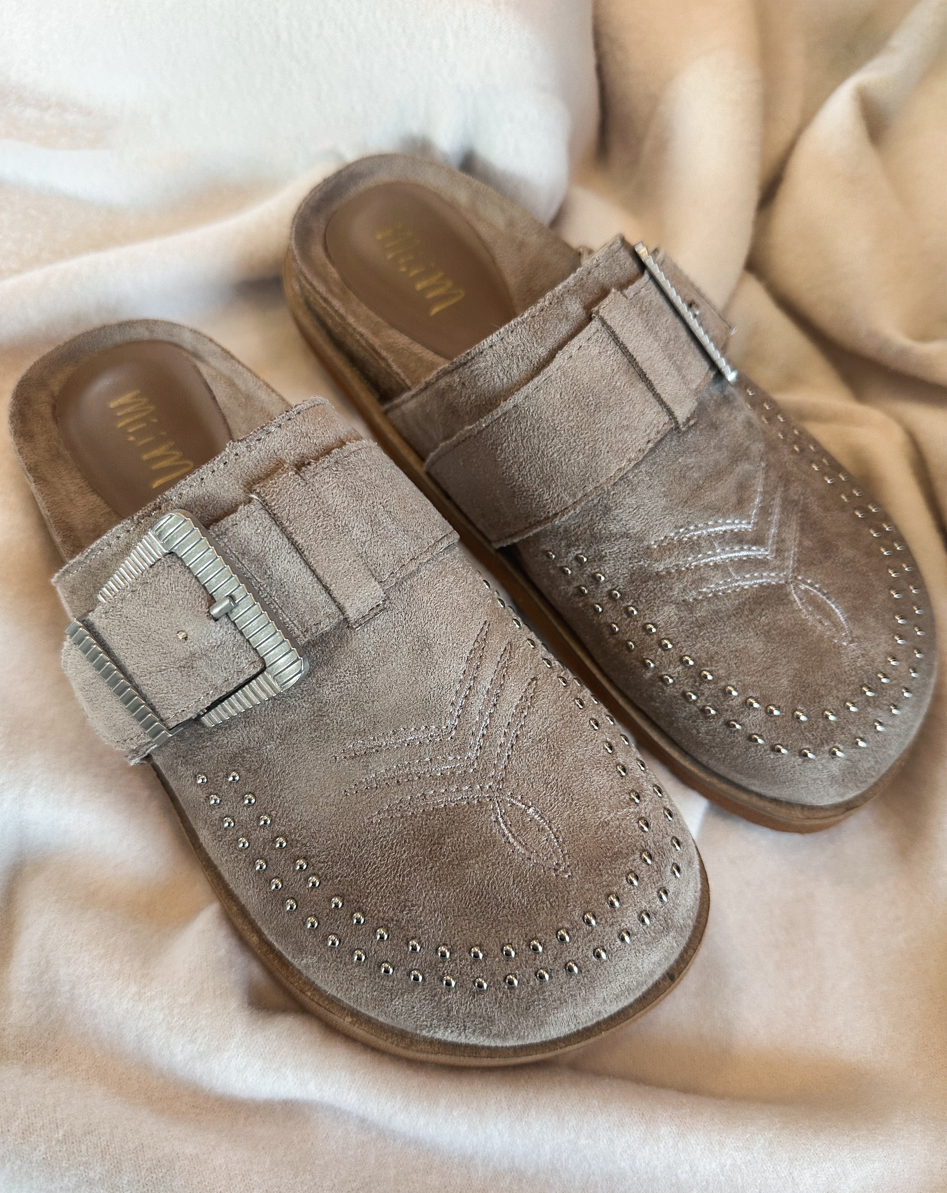 Josephine Clogs offer effortless style with their neutral grey hue and studded detailing. Designed for easy slip-on wear, these clogs combine casual comfort with a subtle edge, perfect for everyday outings. Whether you're running errands or meeting friends, they add a laid-back yet chic touch to any outfit.