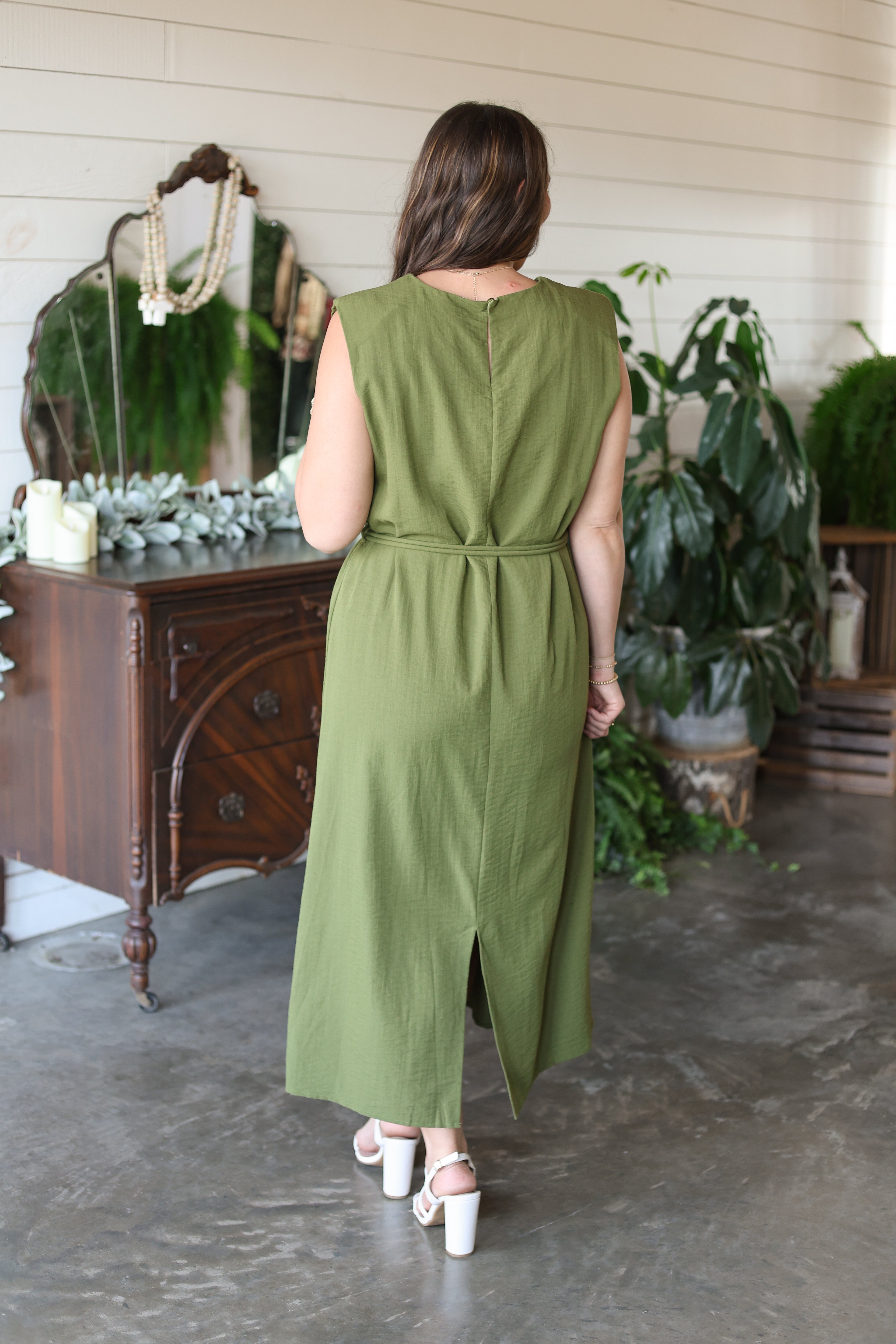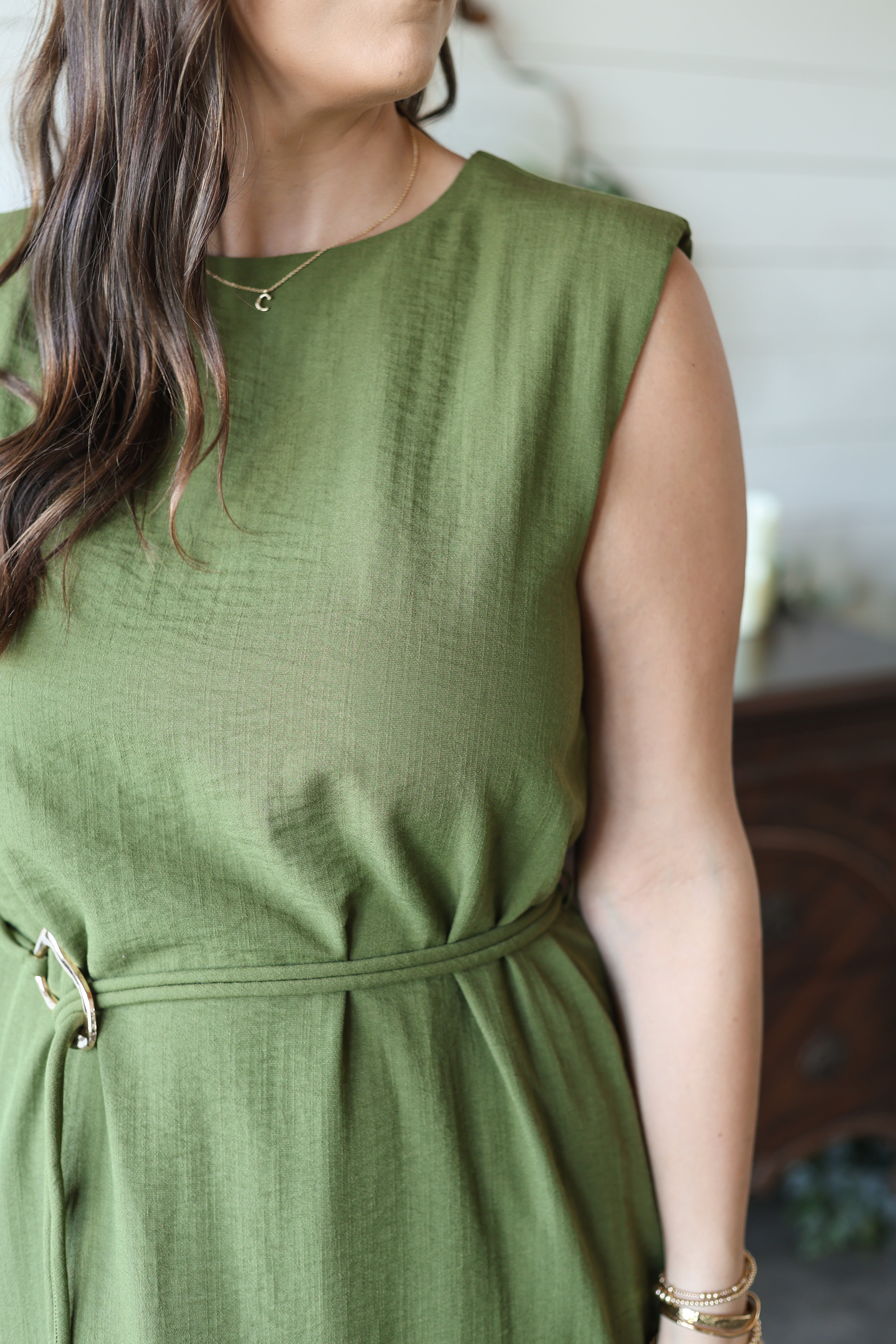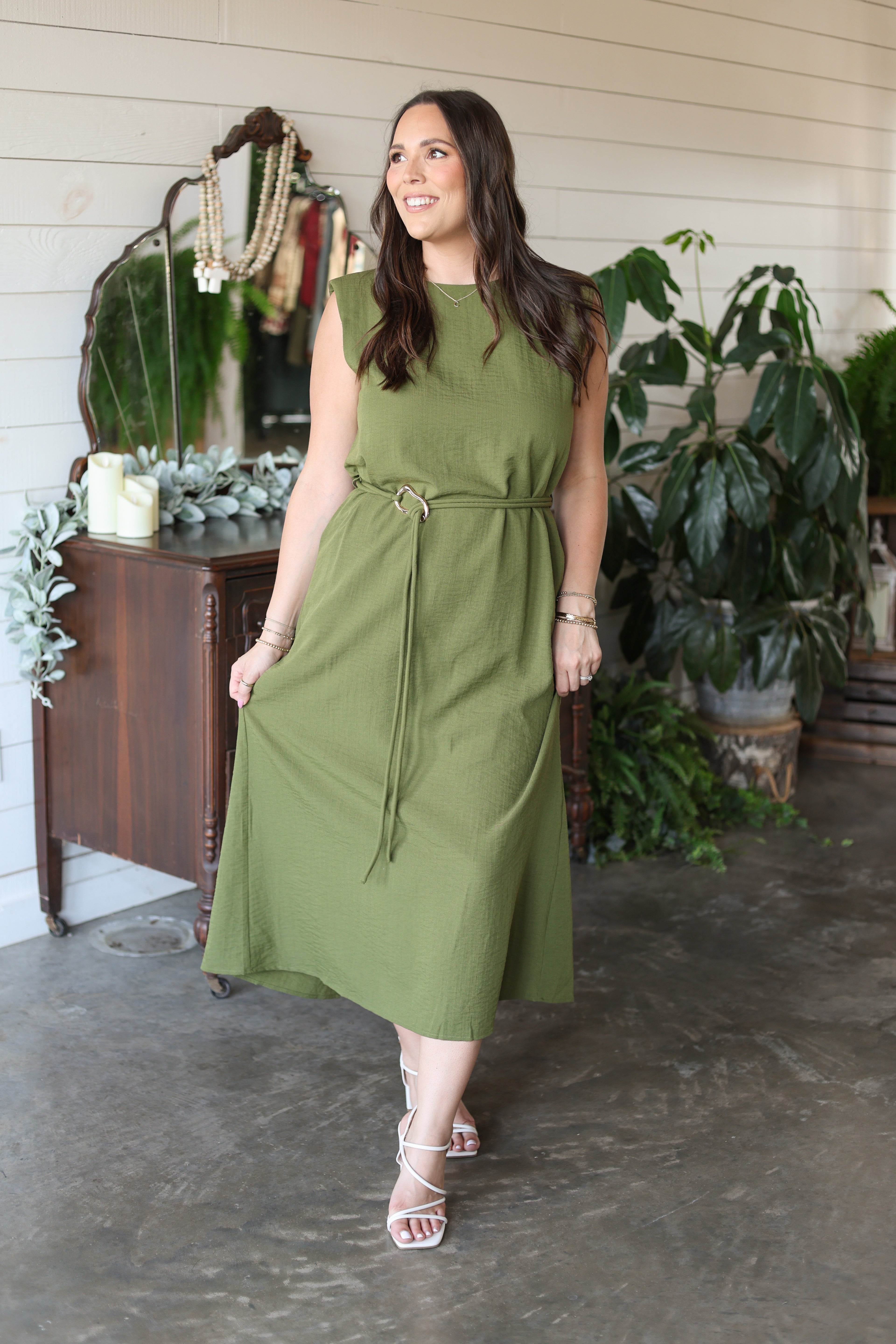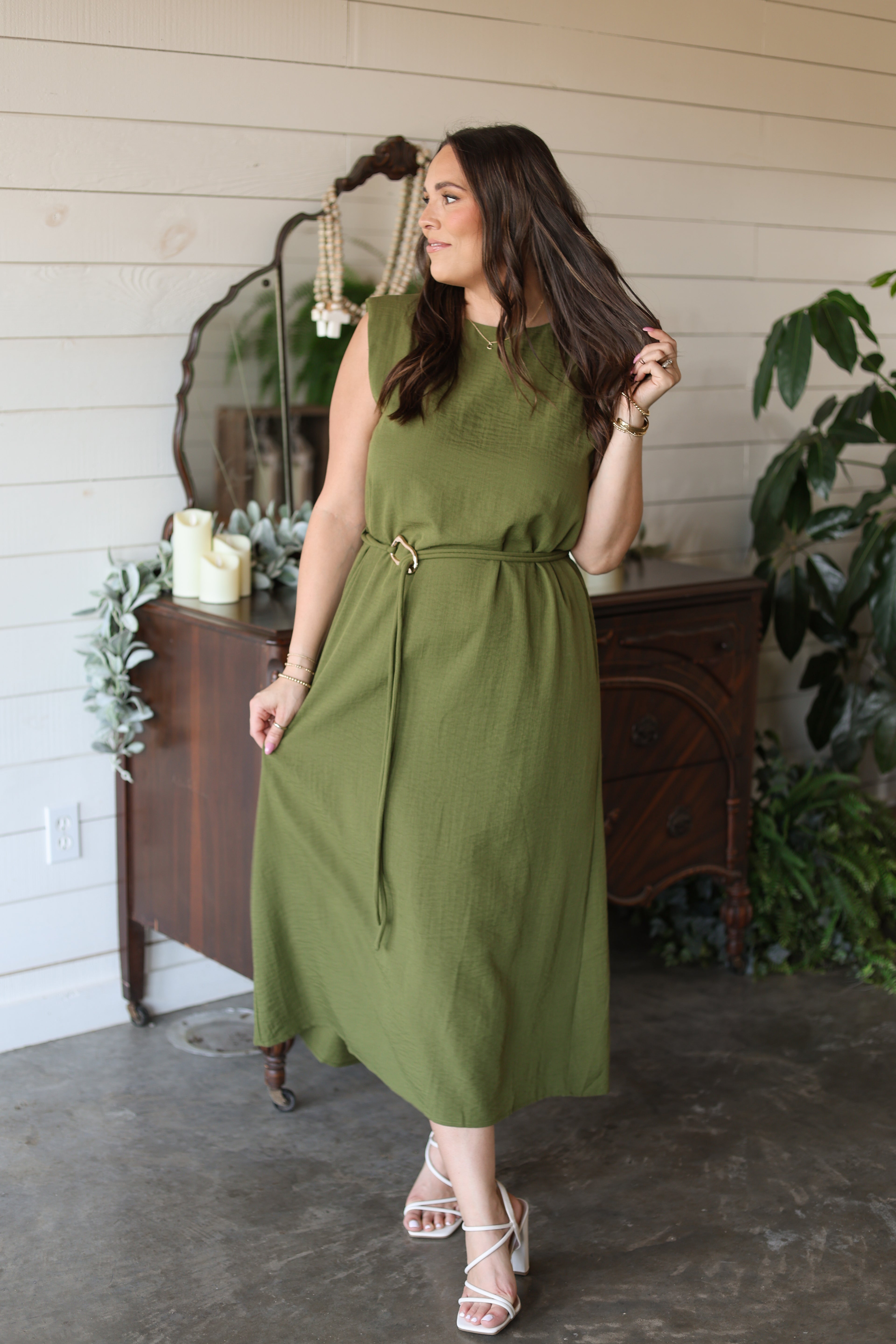 Bring effortless elegance to your wardrobe with the Vayla Midi Dress. This olive green, sleeveless dress features a flattering waist tie accented by a gold buckle, adding a chic touch to its timeless design. Perfect for any occasion, its midi length and classic silhouette make it both classy and versatile. Enjoy looking fabulous with a dress that combines comfort and sophistication in one exciting package!