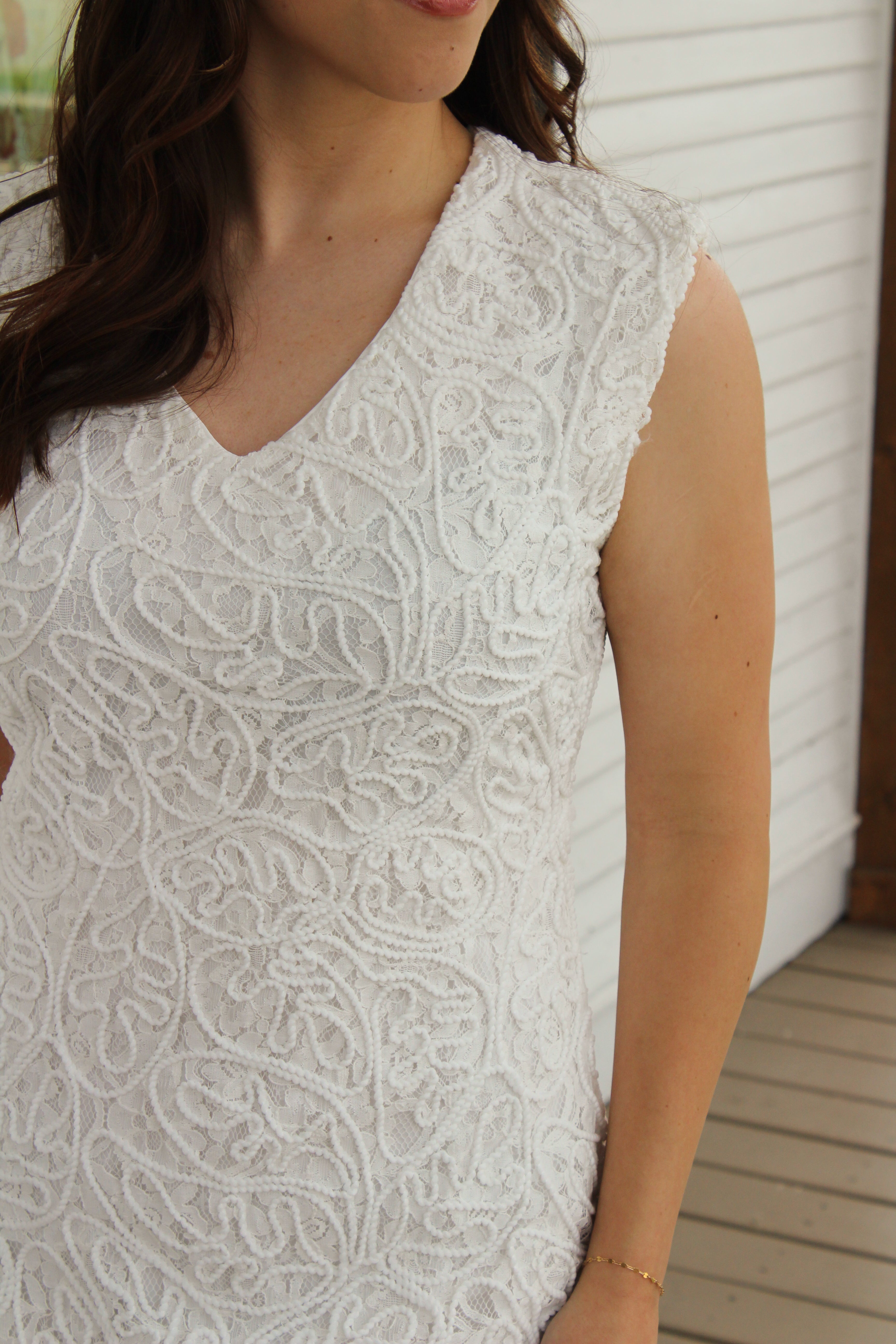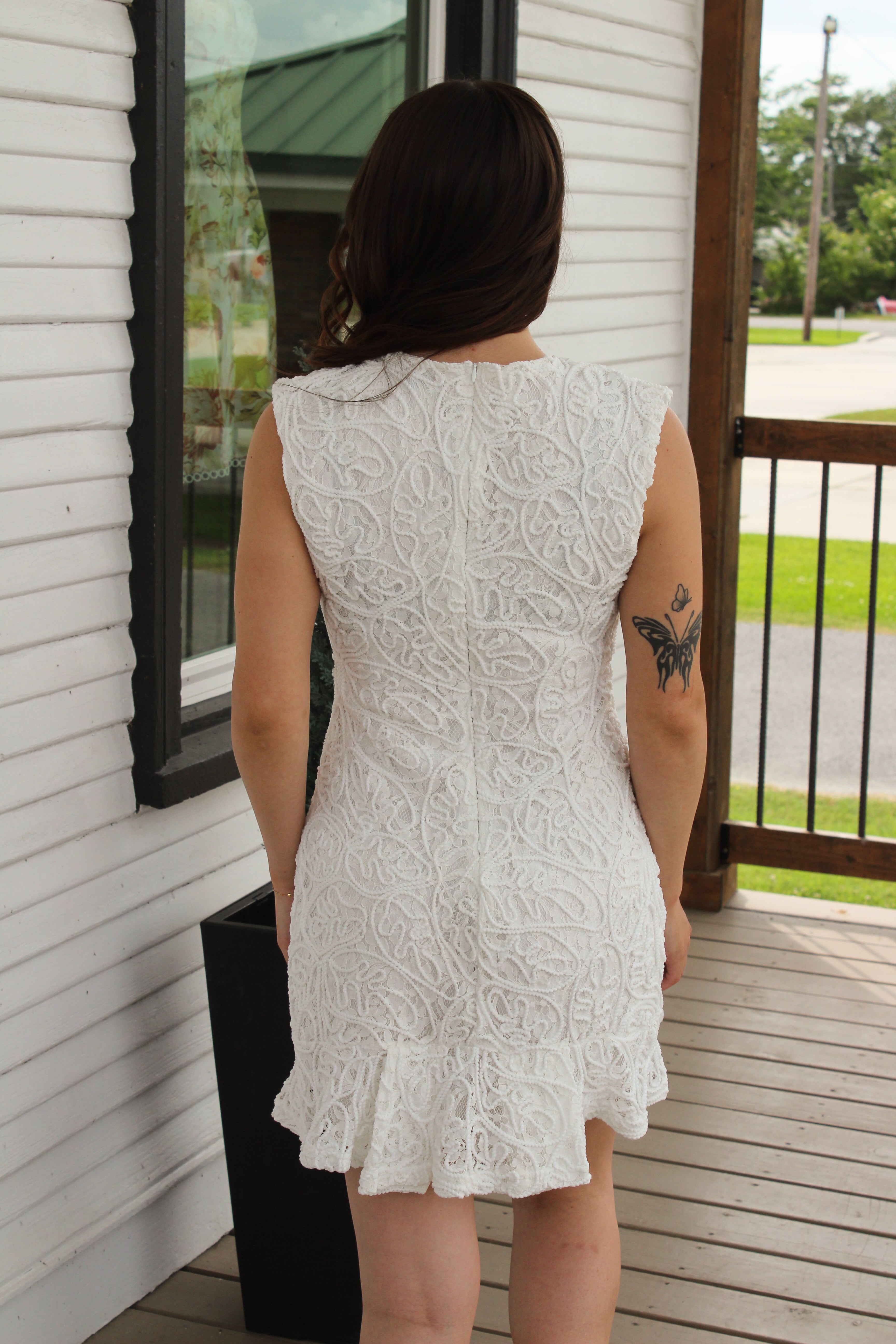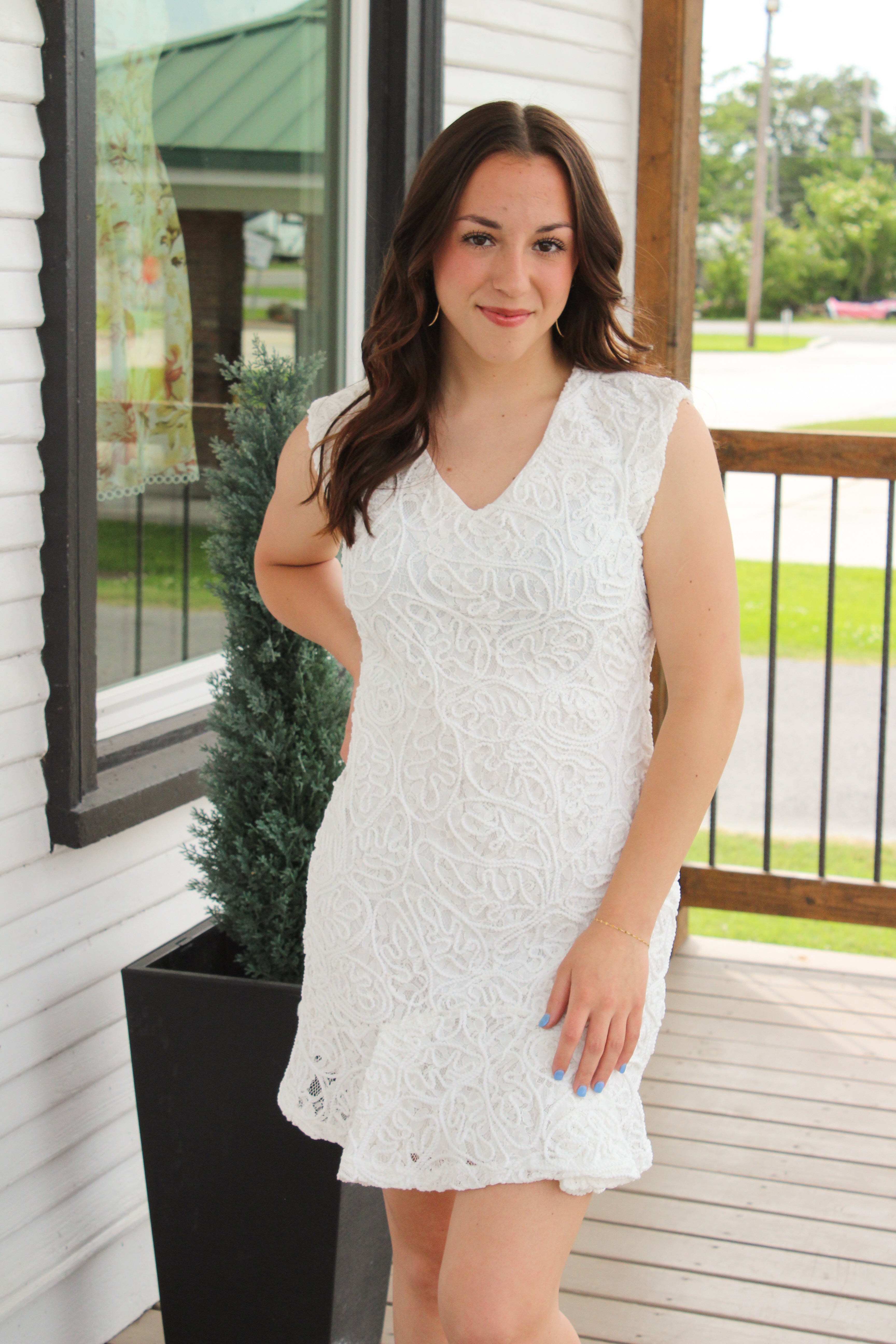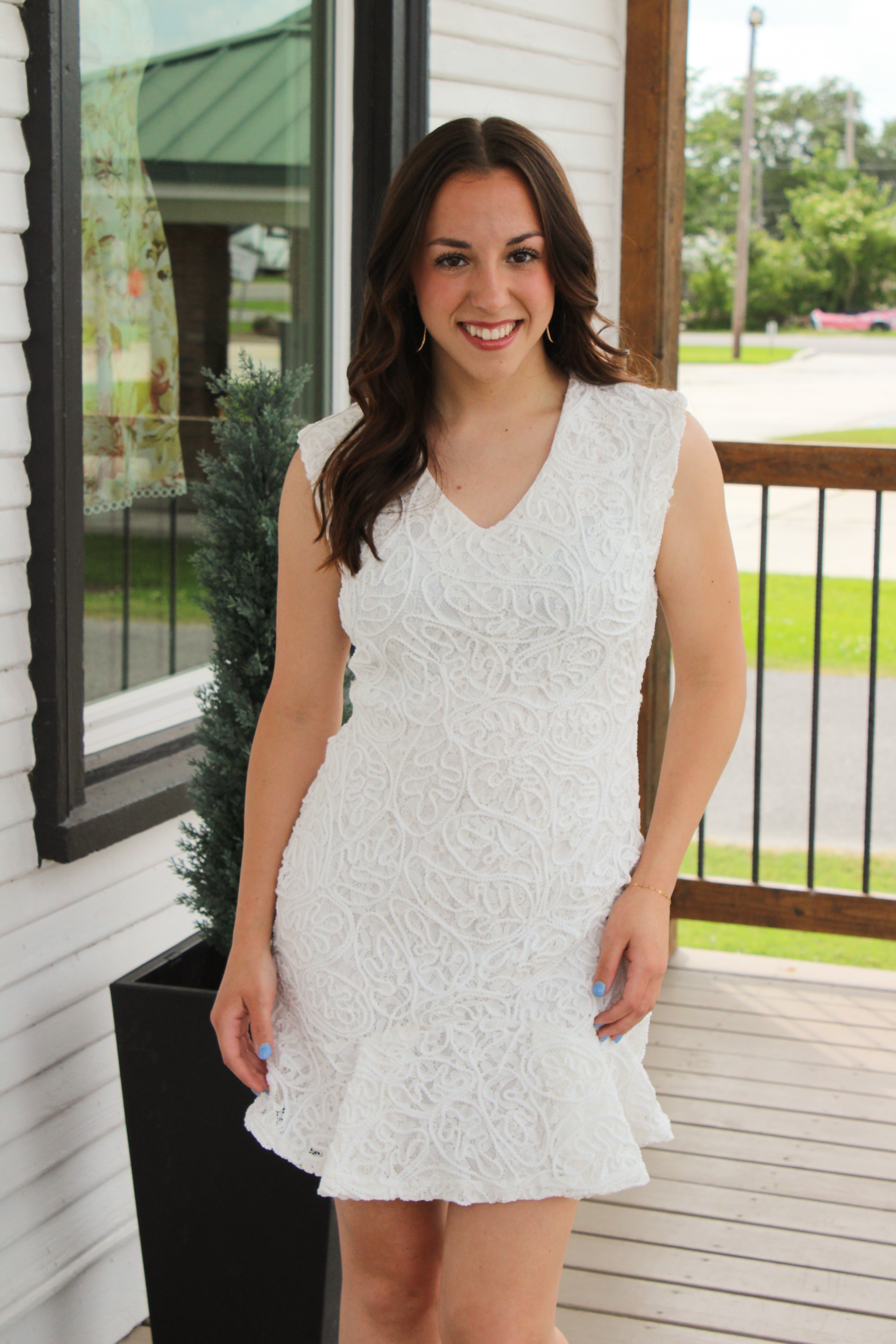 This white dress is PERFECT for graduates and brides. It can also serve as a stylish bridal shower or graduation dress. With a sleeveless design, shoulder pads, and a mini length, it features a flattering V neck and delicate lace details. The pleated skirt hem adds a touch of elegance.