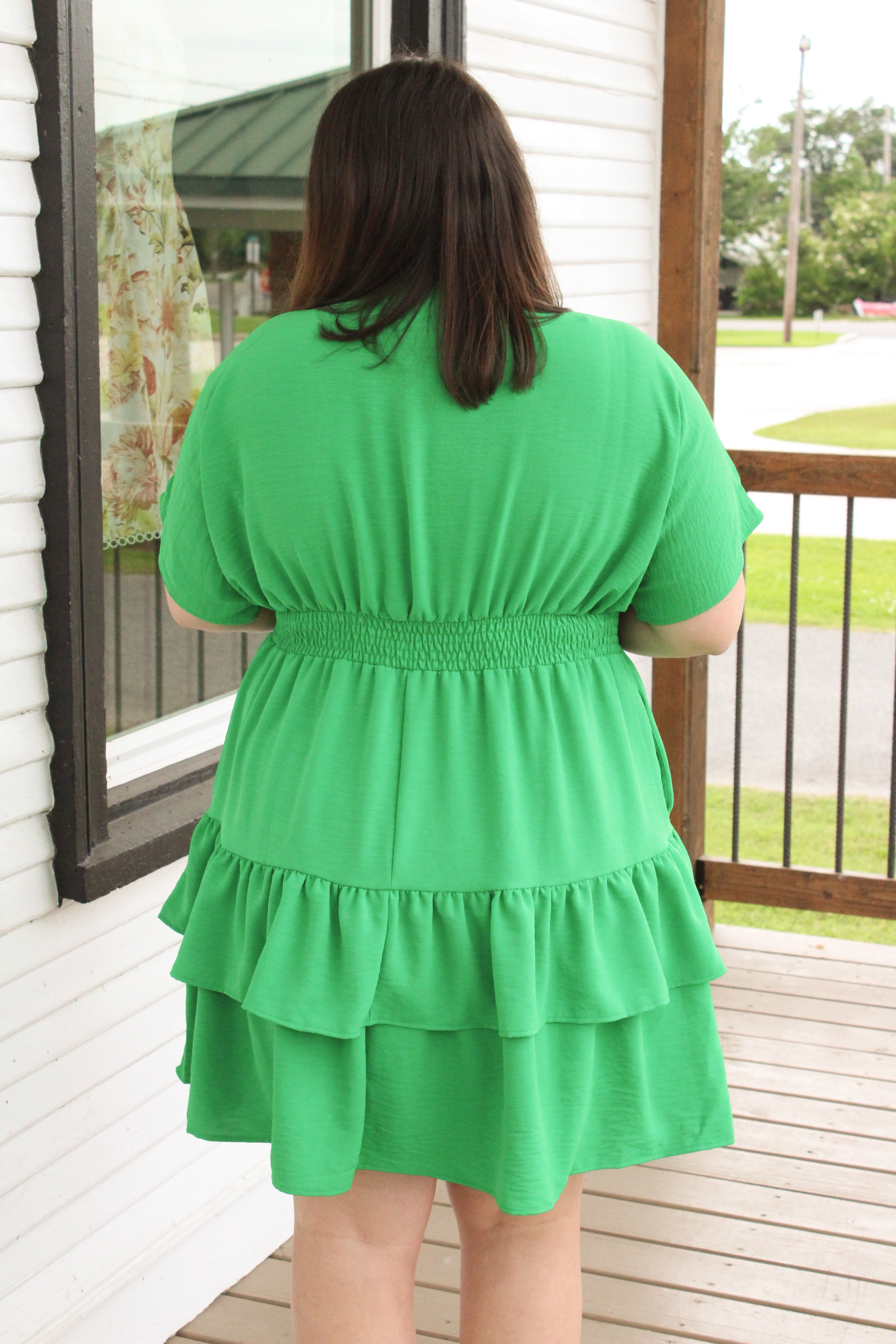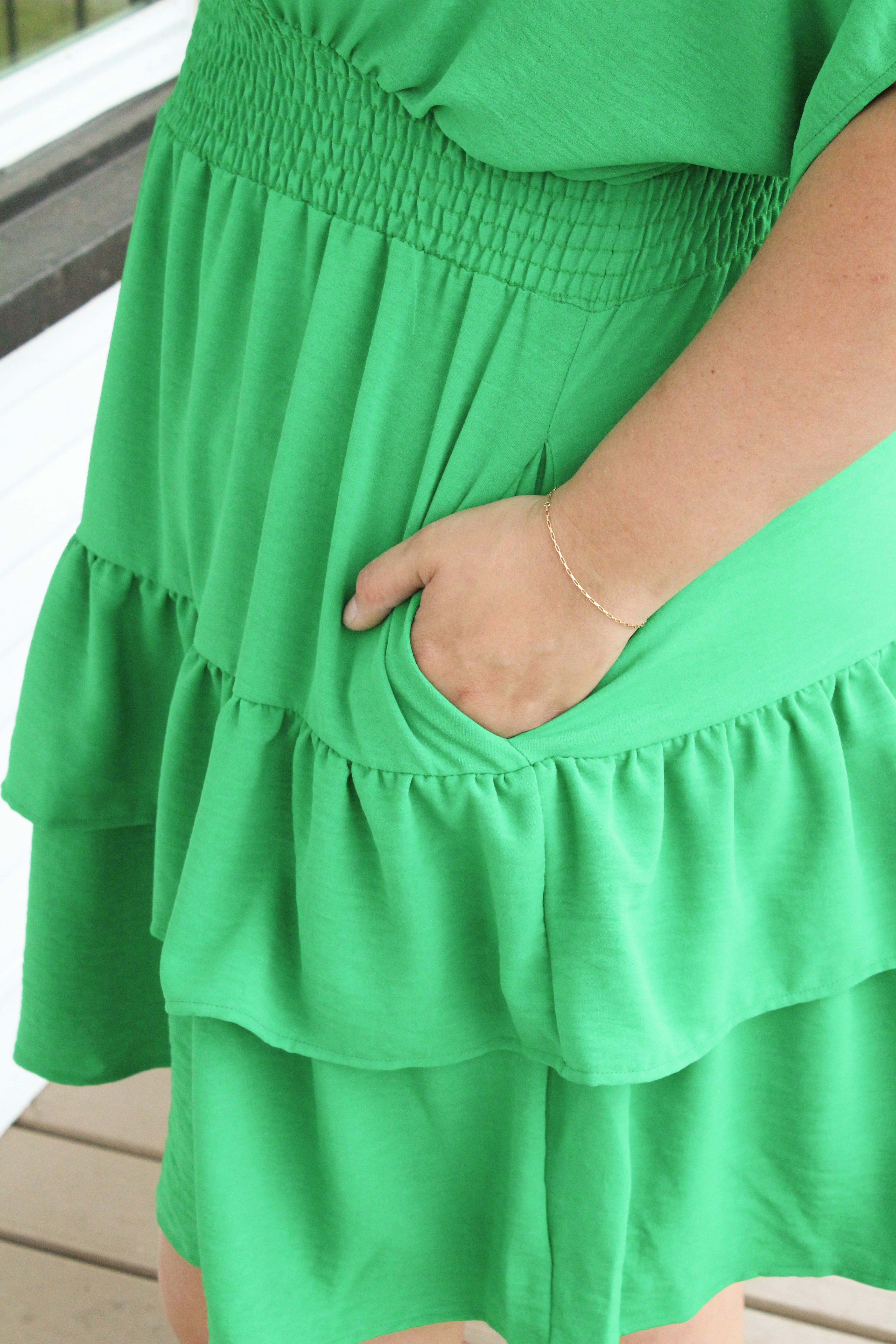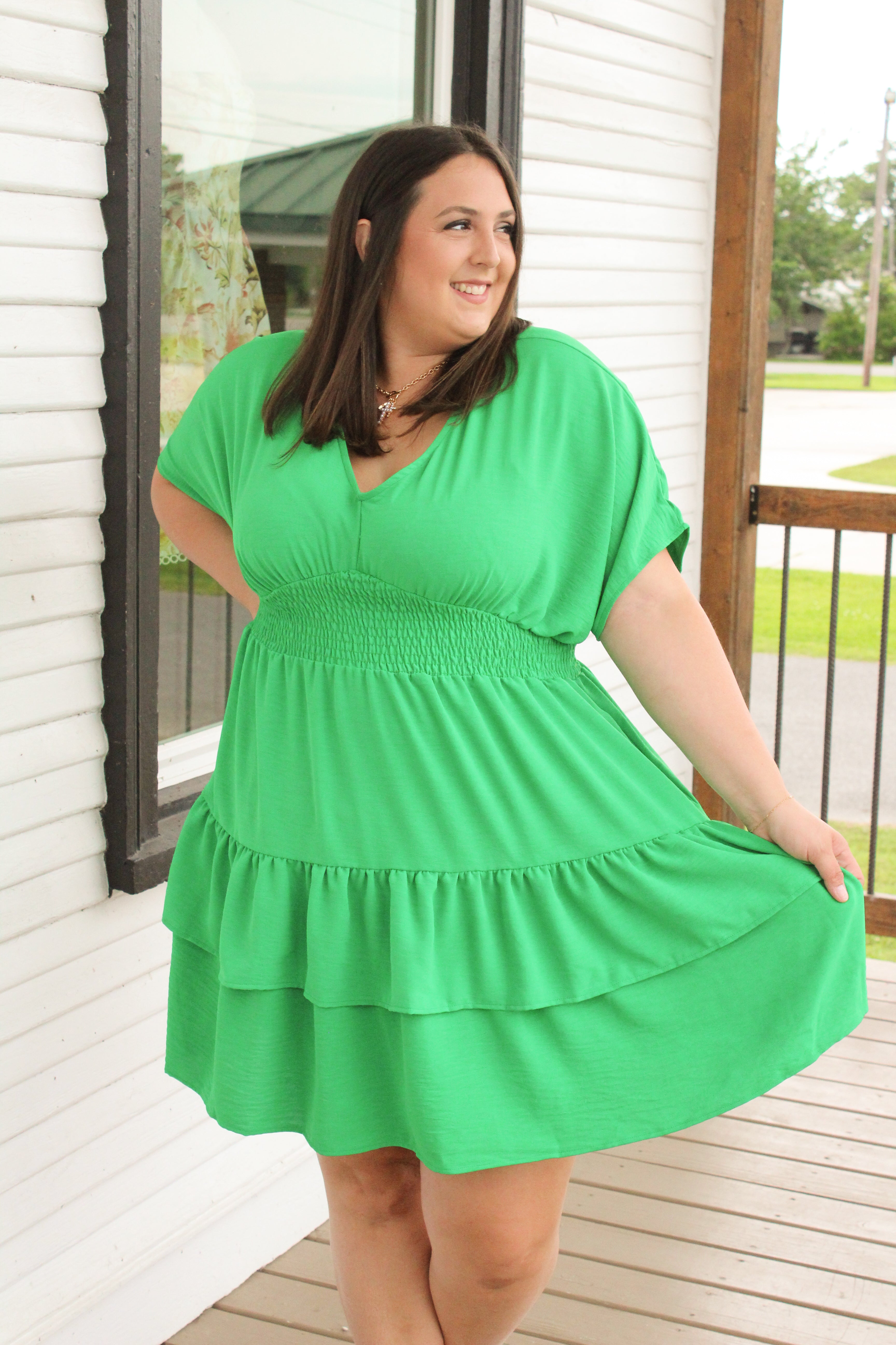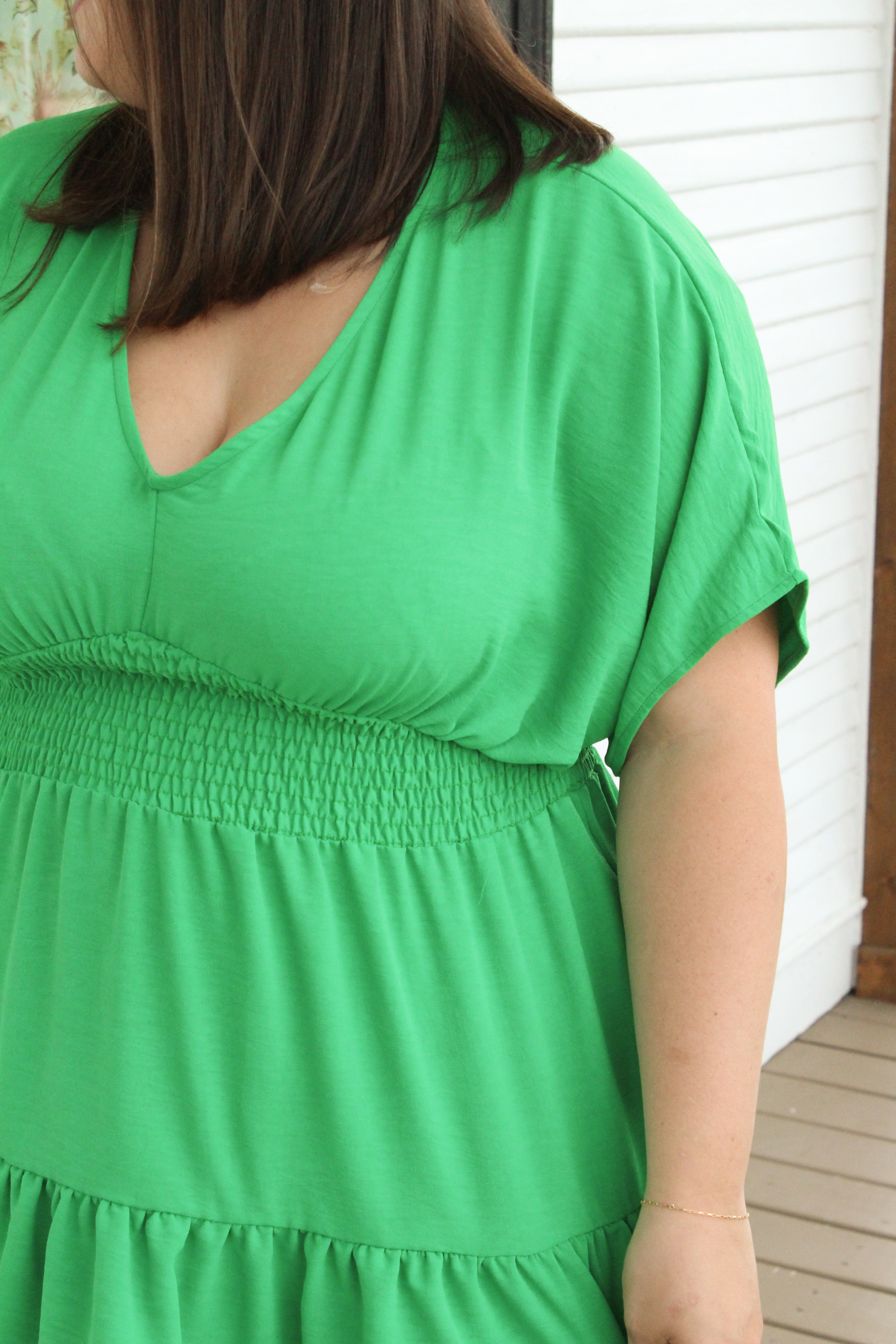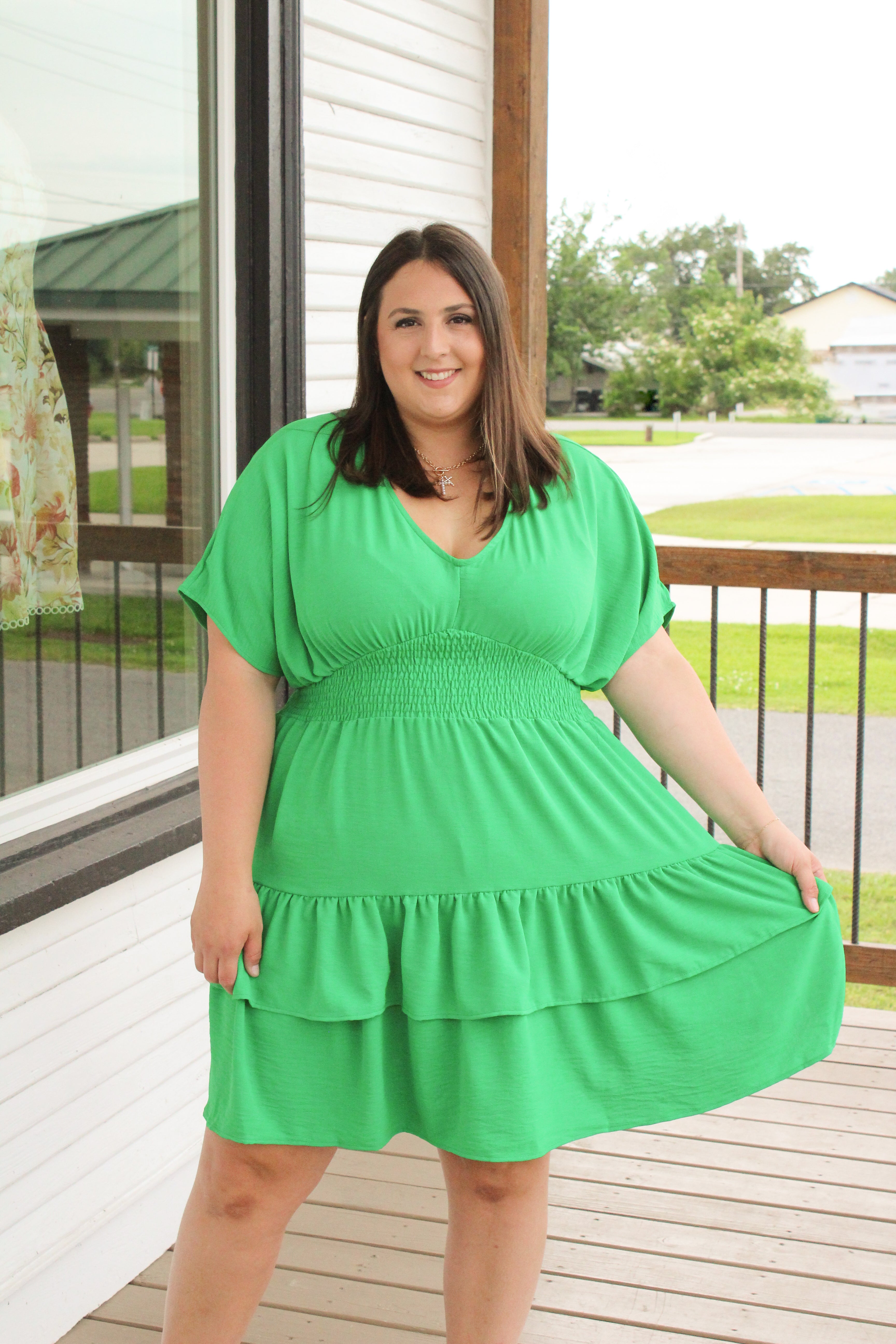 Introducing the Olivia Dress - P, now available in kelly green! Slip into this plus size V neck dress with dolman short sleeves for a comfortable and stylish look. The smocked waist and ruffle detailing adds a feminine touch, while the tiered design and side pockets make it practical. Perfect for any occasion, this knee length dress will become your new go-to.